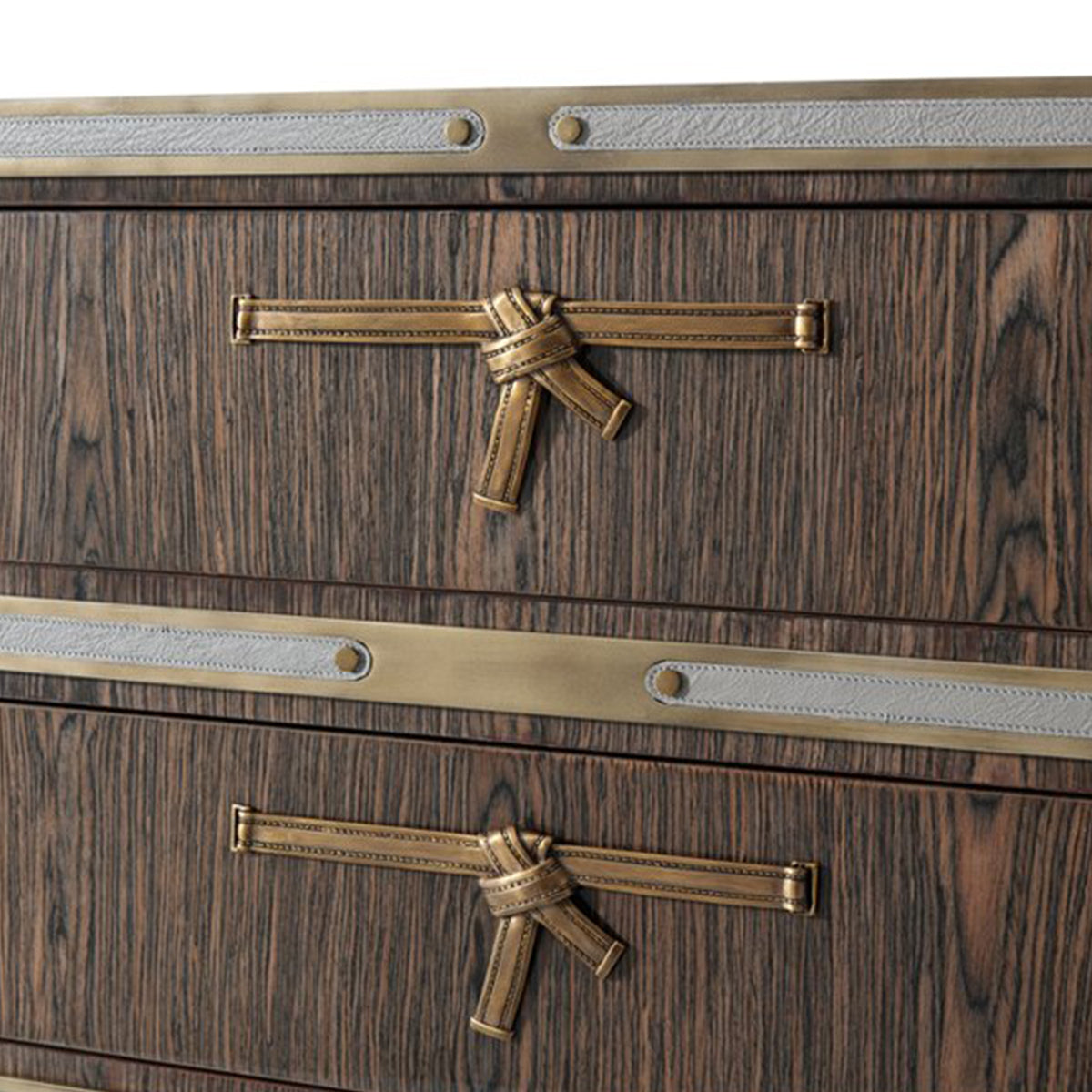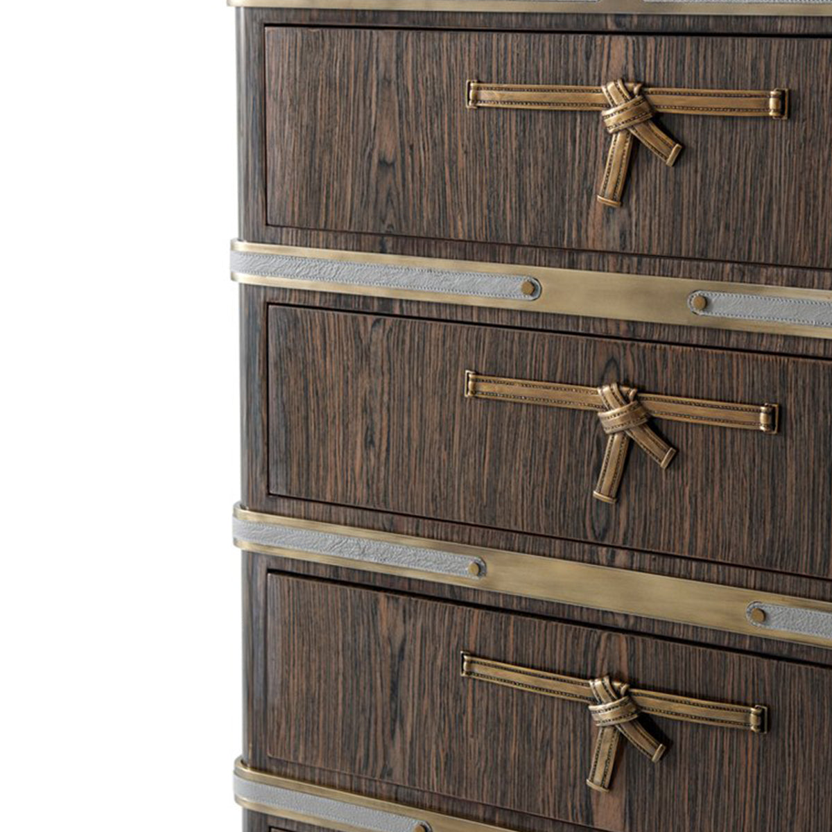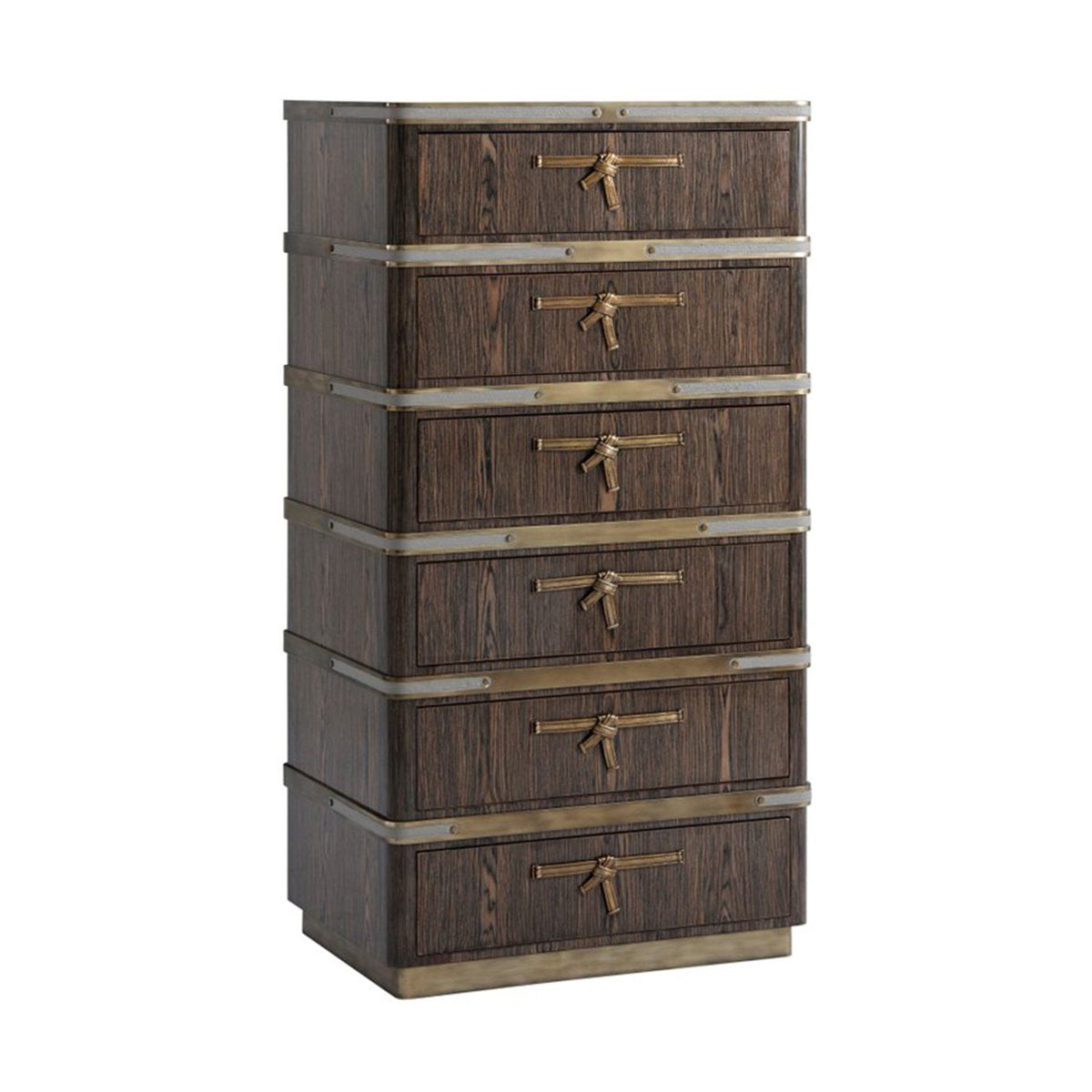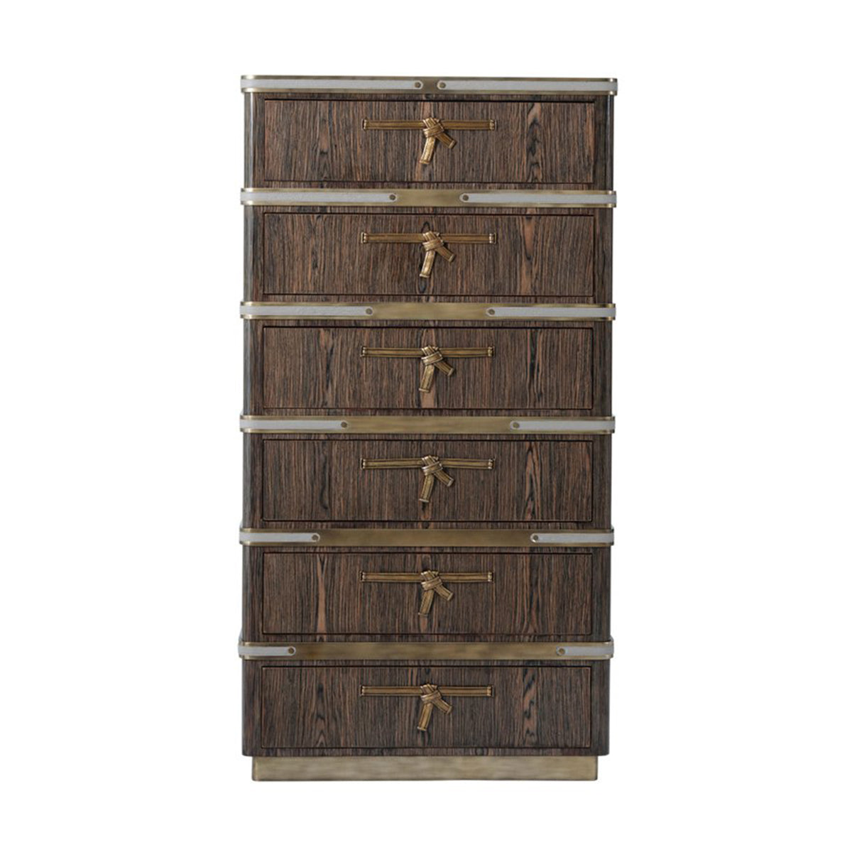 The finely veneered top and case with smooth edges offer an industrial appeal to the stunning Hi Boy Chest. Six sliding Leather channeled chests of drawers with Cast-Cinch drawer pulls add to the refined look. A Recessed Bronze finish plinth base is durably captivating.
