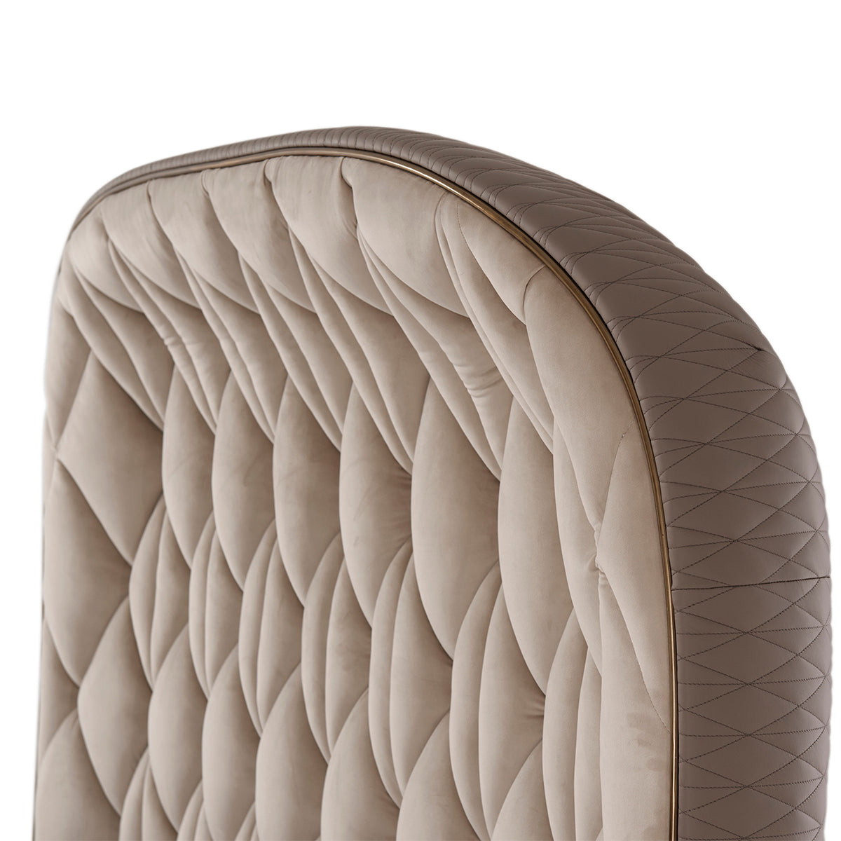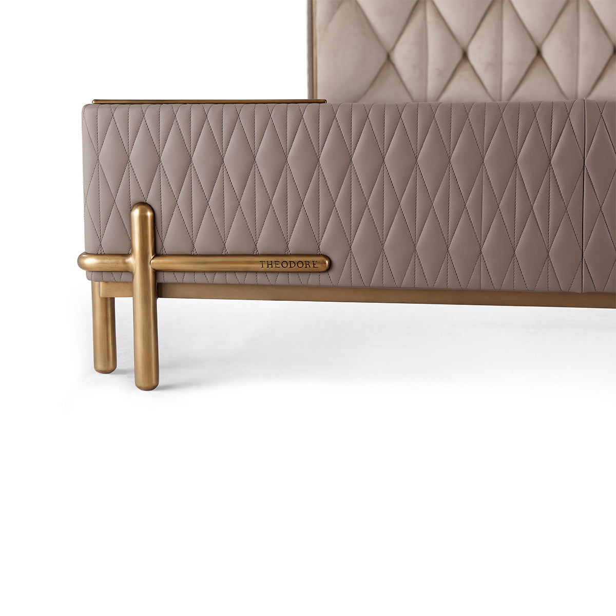 Offering style and comfort, the Iconic Upholstered Bed boasts an arched alcove headrest accented with button tufting details. Rosepine Leather on the side rails and outside backrest display a geometric quilting pattern to amplify the visual effect. Bronze baton legs with crossed details wrap round out the graceful silhouette.