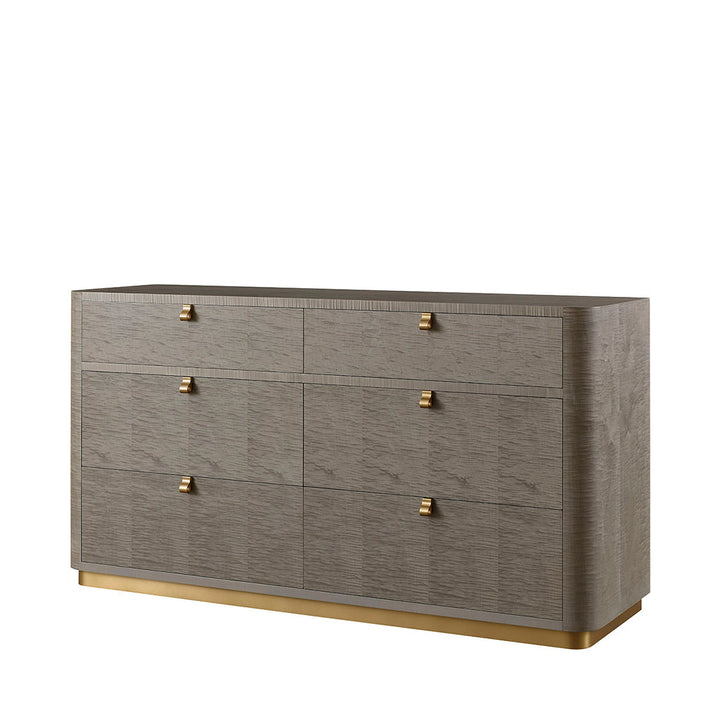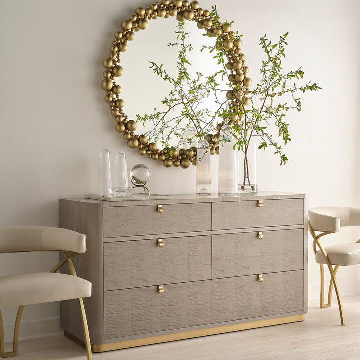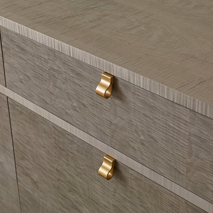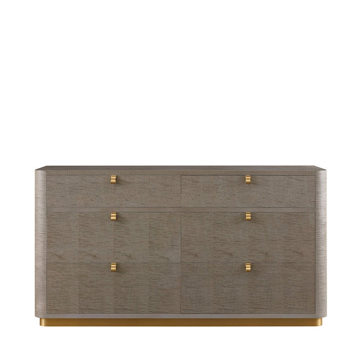 With six drawers adorned by cast Brass Leather strap pulls, the Jocelyn Dresser evokes a sense of vintage sophistication. A solid framework composed of Italian Dyed Figured English Sycamore Veneer takes you to the golden era of luxury travel. It rests on a Polished Brass plinth metal base, adding a chic touch and ensuring durability.