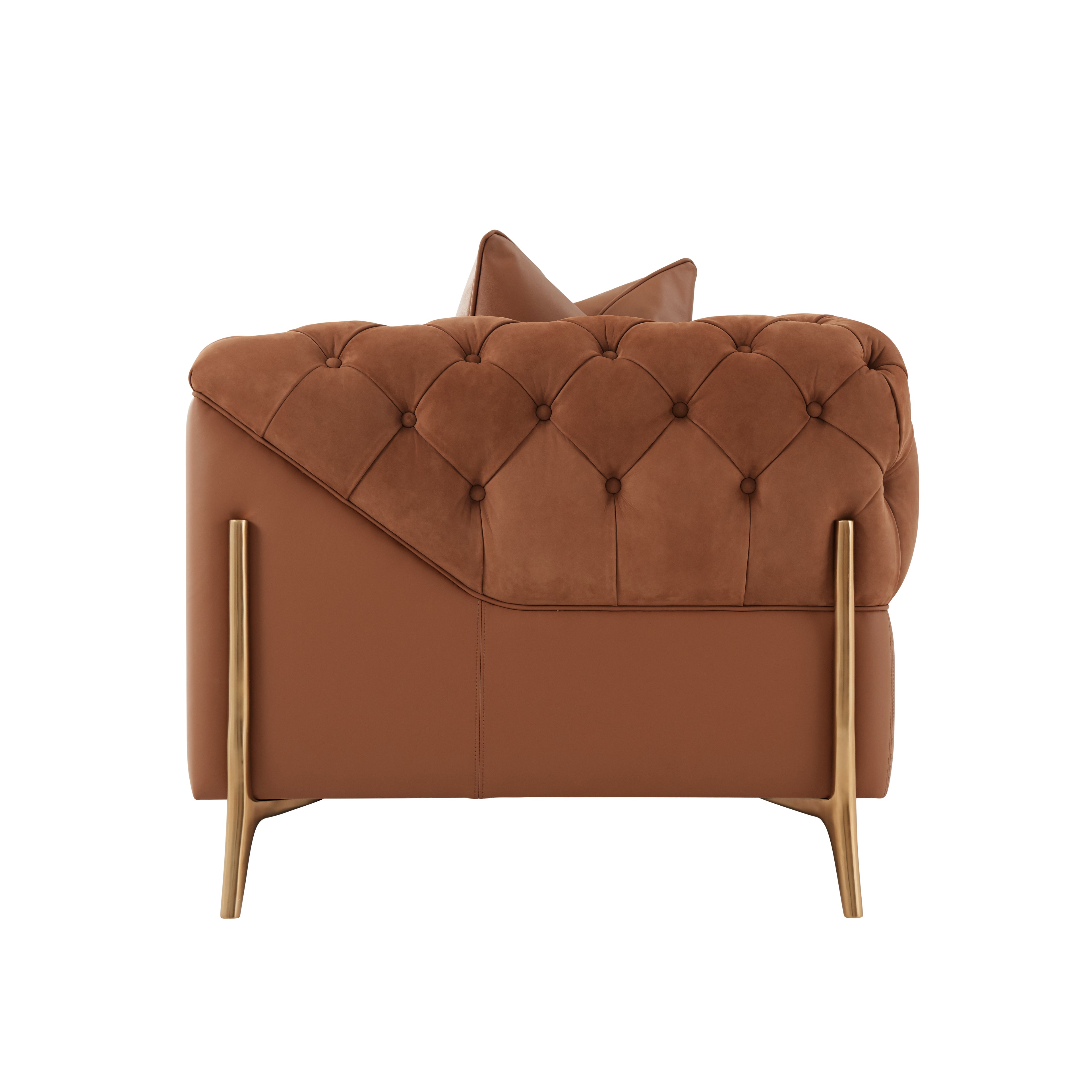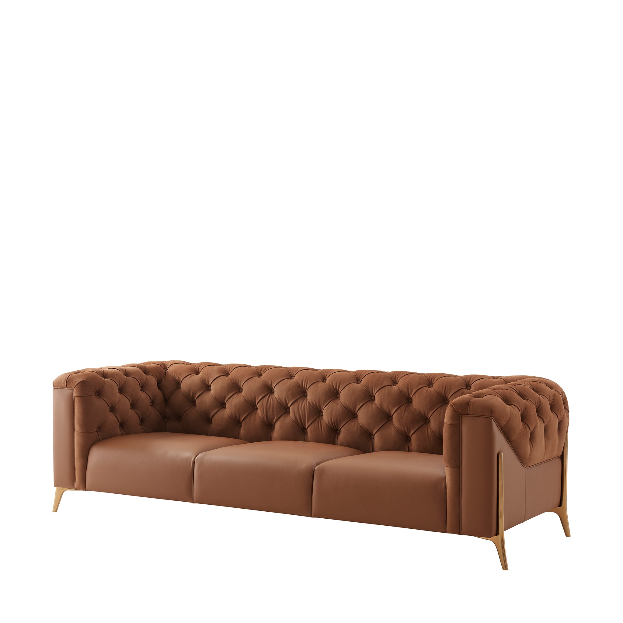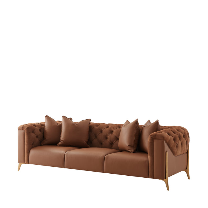 The Jolie Sofa prioritizes comfort, with a three-section tight seat that provides the ideal balance of support and coziness. It has channeled arms details that add an extra layer of luxury and visual intrigue. Four-throw pillows add a touch of luxury, and the organic Brass finish cradle base exudes elegance. Embrace the future of home fashion with this trendy sofa.