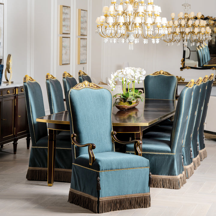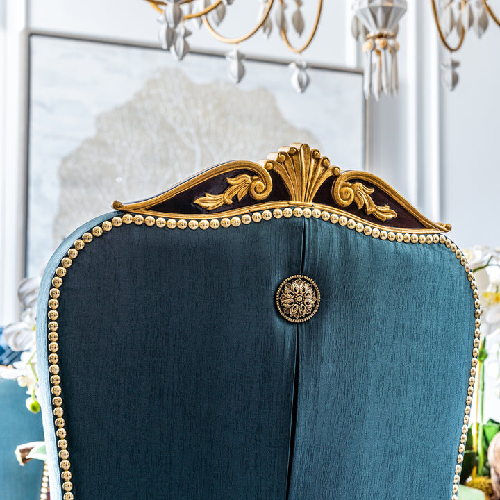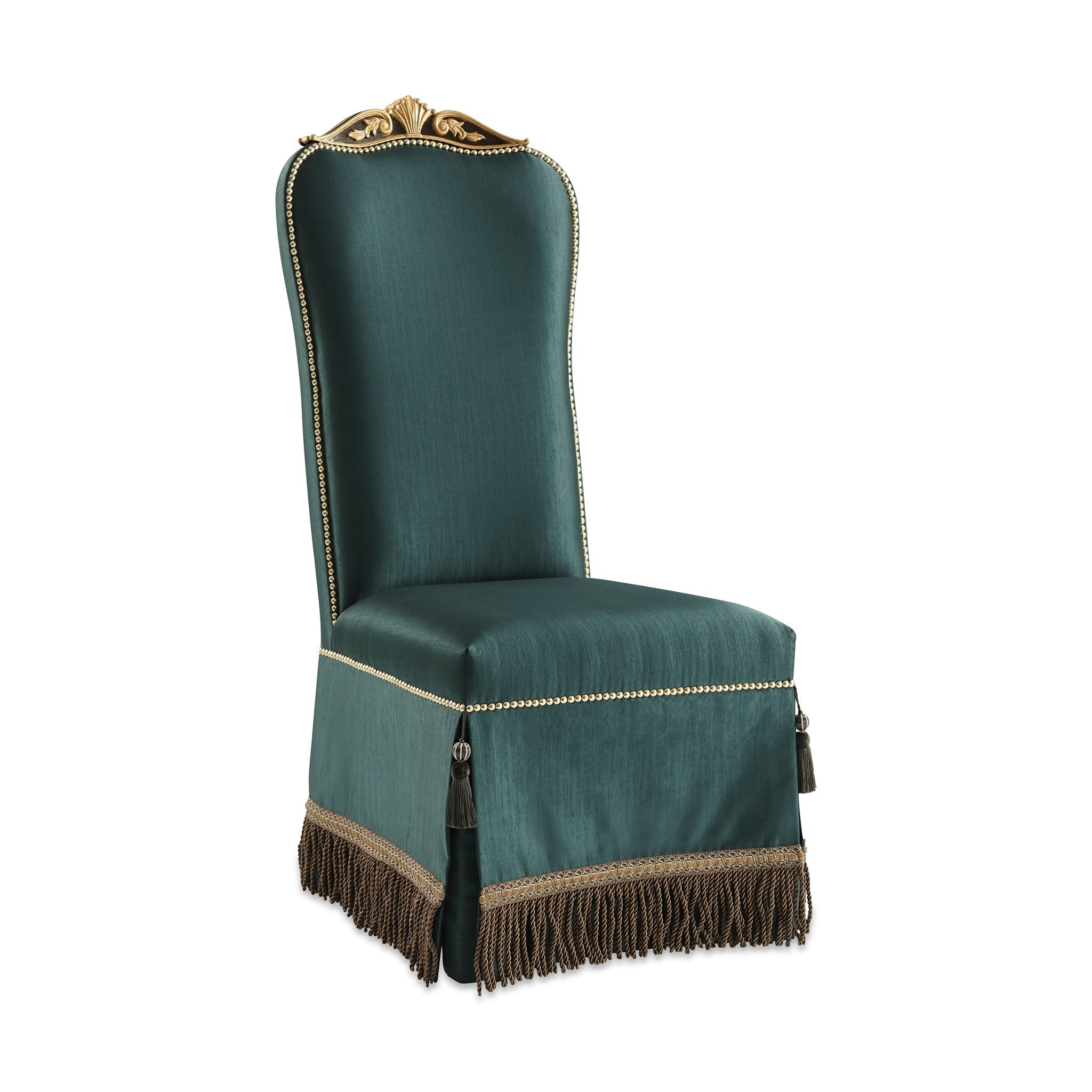 The luxurious Julietta Side Chair adds a touch of class and sophistication to any dining room. It is a durable, long-lasting Wooden Upholstered Side Chair featuring Emerald Green upholstery and a Cambridge finish. This piece offers a graceful vintage vibe and adds drama to the otherwise basic table setting.