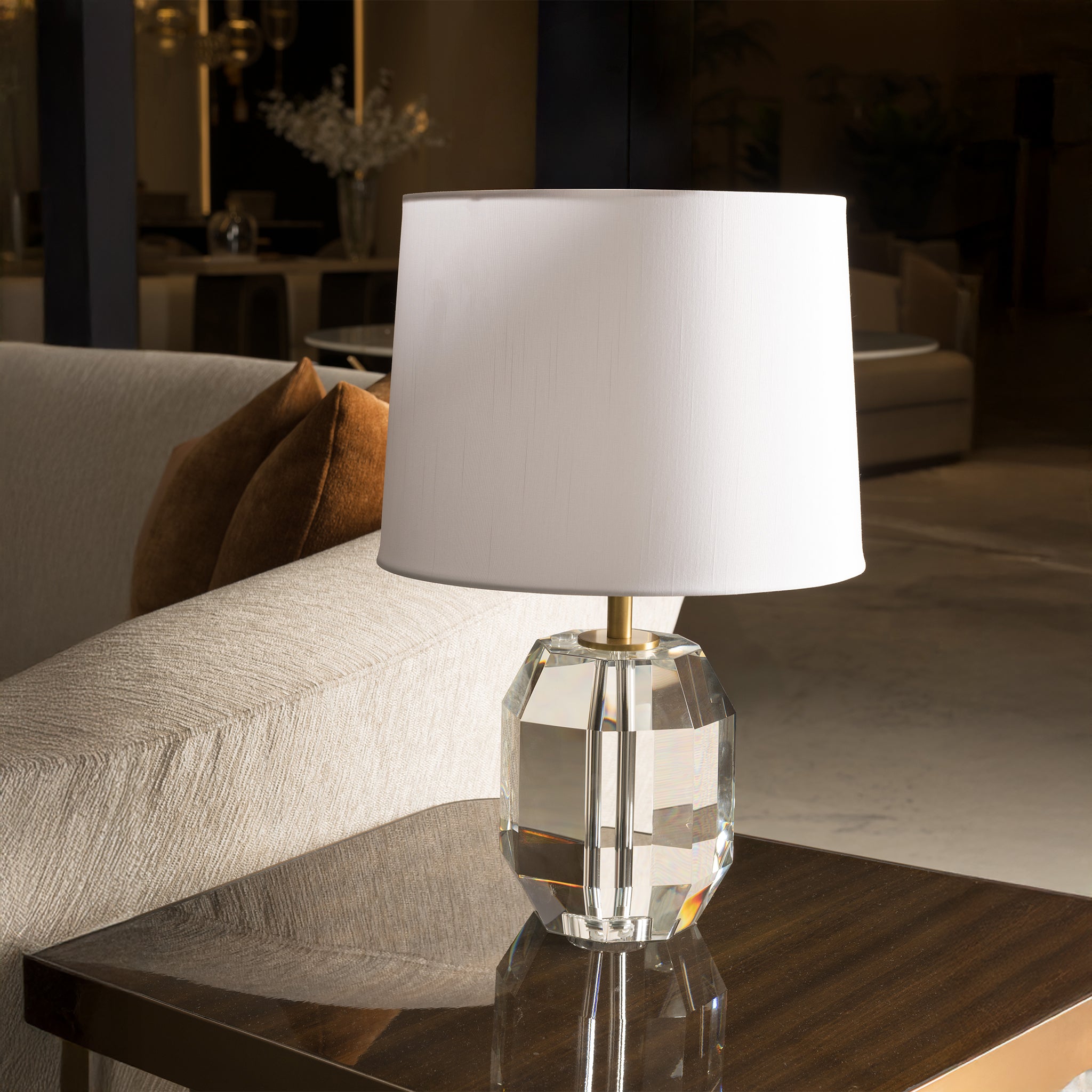 Defined by clear crystal and the graceful structure of art deco design, this lamp exudes timeless elegance. The faceted base and precise geometry come together in perfect visual harmony.