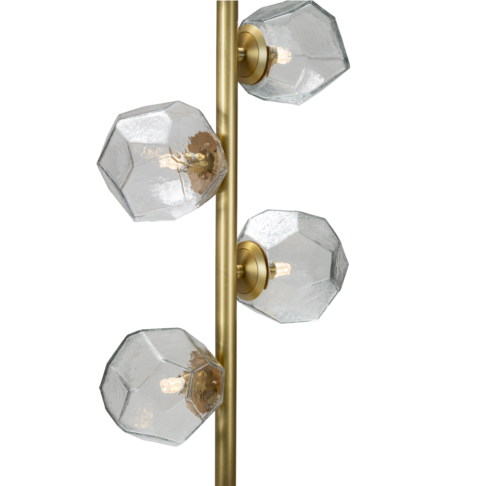 The floor lamp pairs an antique brass frame with clear glass accents that catch the light beautifully. Its clean lines and sculptural form bring a refined presence to any space.