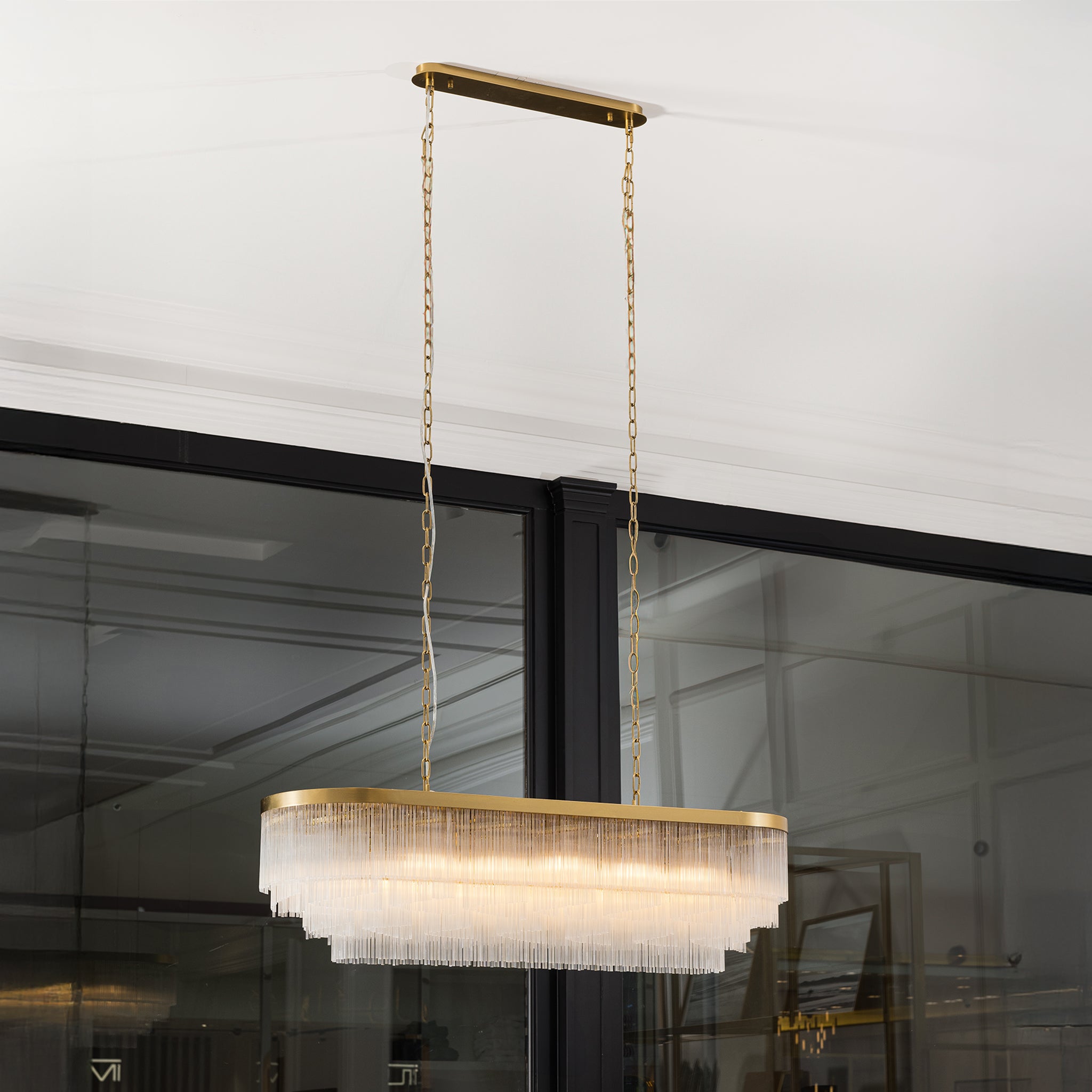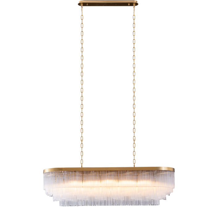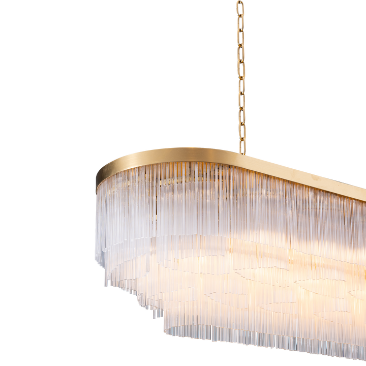 This linear chandelier brings a fresh take on classic art deco style. Each glass piece is meticulously set by hand, a process demanding precision, patience, and exceptional craftsmanship.