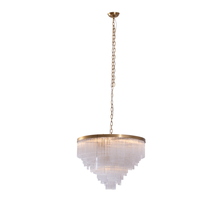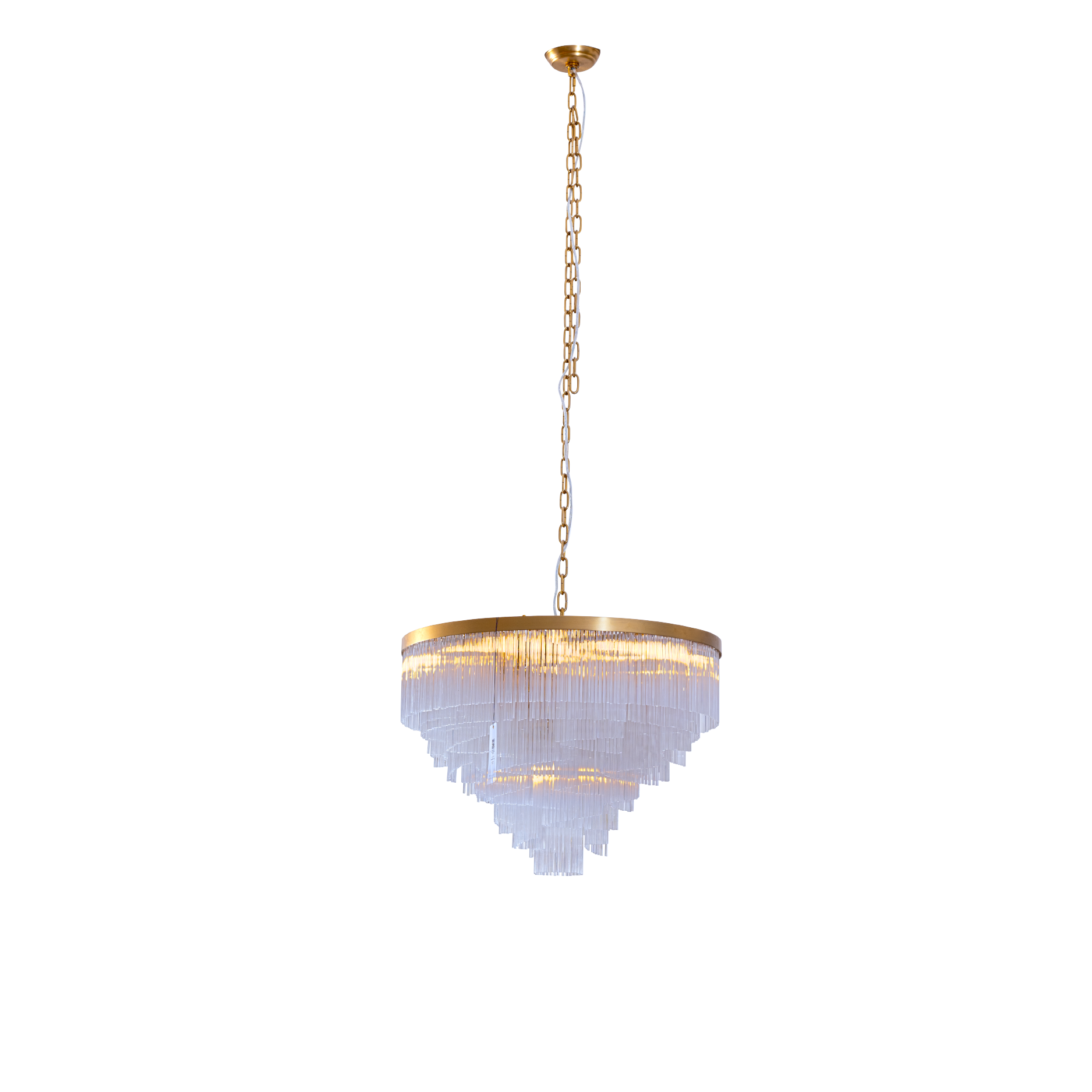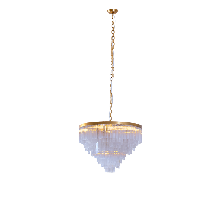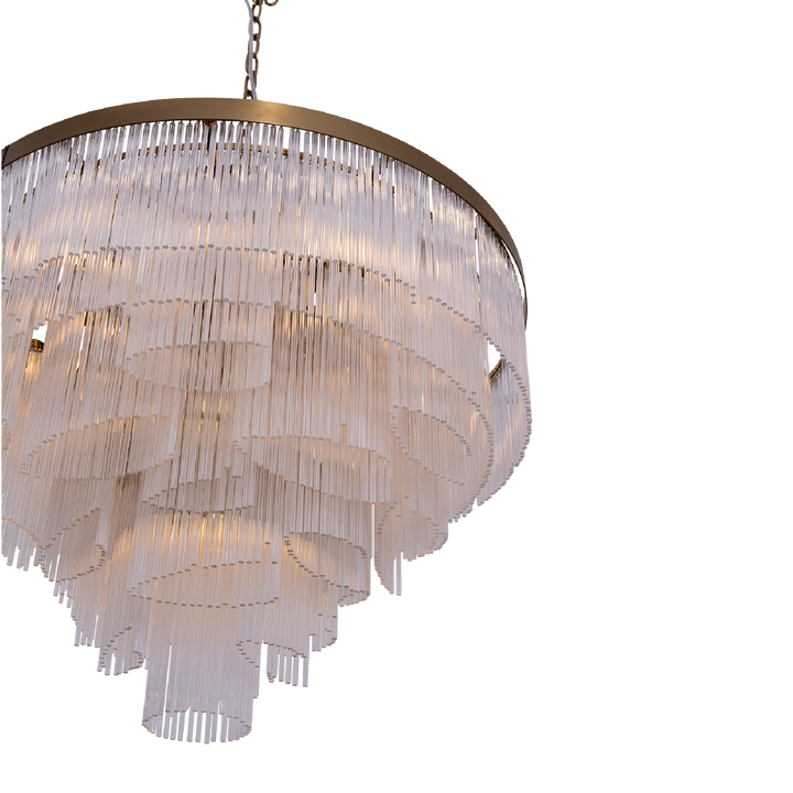 A stylish fusion of elegance and artistry, this chandelier channels the opulence of the art deco era into a sculptural narrative of light. Each glass piece is installed by hand, a process that demands precision, patience, and exceptional craftsmanship.