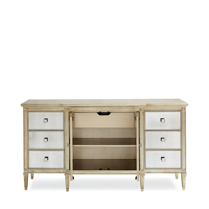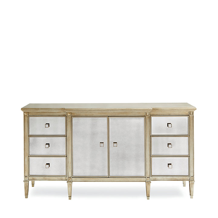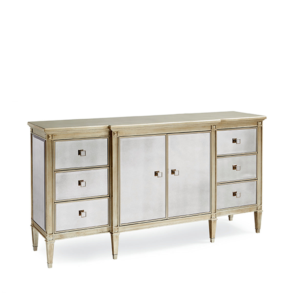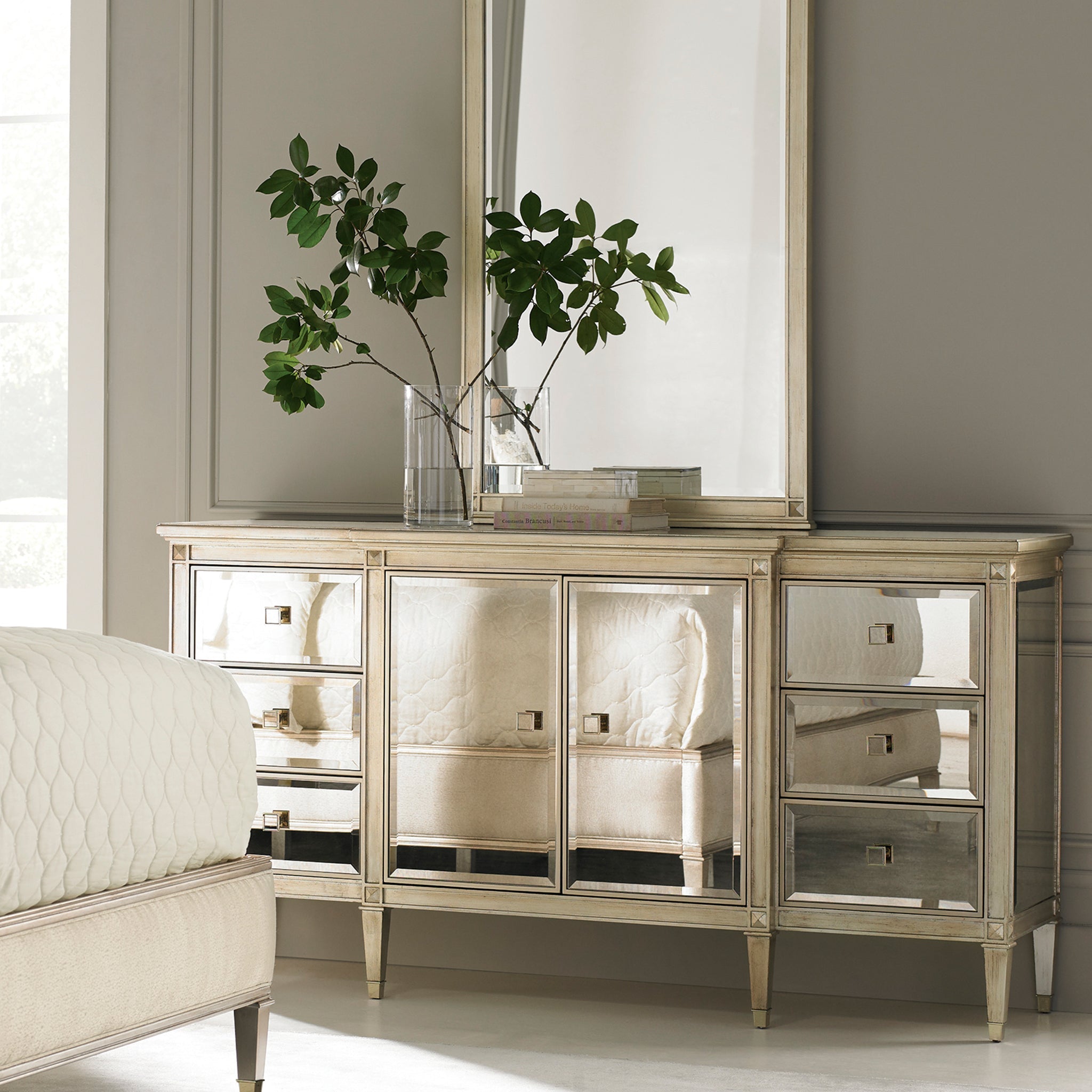 A vintage-inspired dresser will make your bedroom look stylish and organized. Holding six drawers and two doors embellished with Beveled Antique Mirror overlays, this piece will shine in any setting. The auric-finished case gives it a more refined appearance, while the Gold Bullion Paint accent on the interior produces a seamless aesthetic.