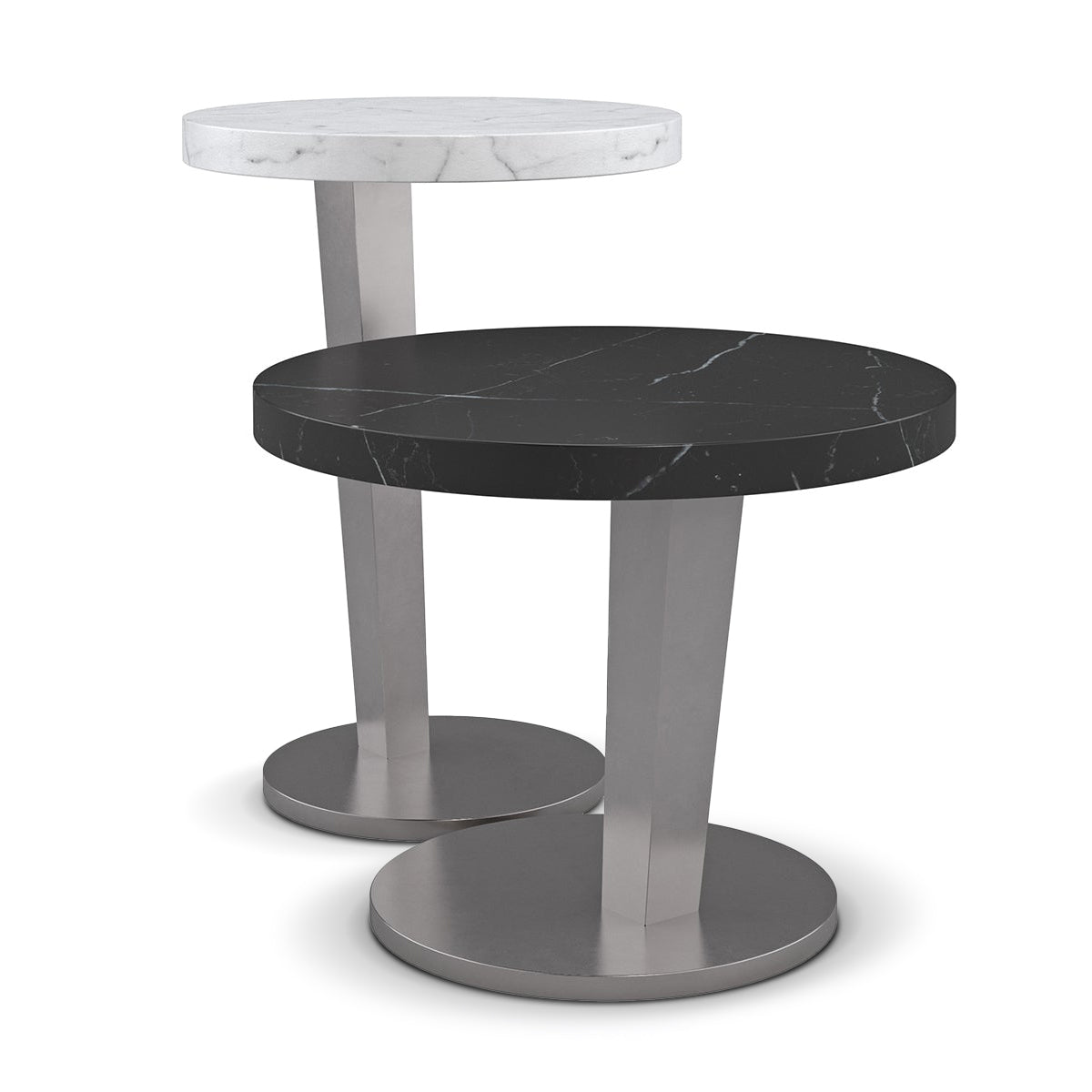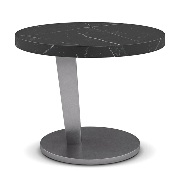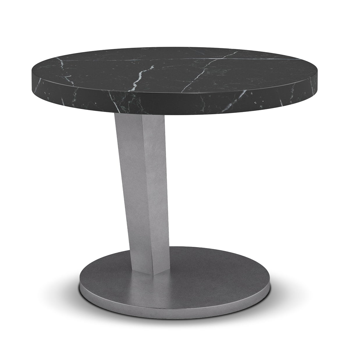 Channel elegance and sophistication to your home decor by adding this accent table. The Black Stone with White veins adorns the top, exuding timeless beauty. Its slightly bent metal frame complements its Smoked Stainless base, giving it a chic appearance. This piece is simple yet versatile, making it an excellent accessory for any room.