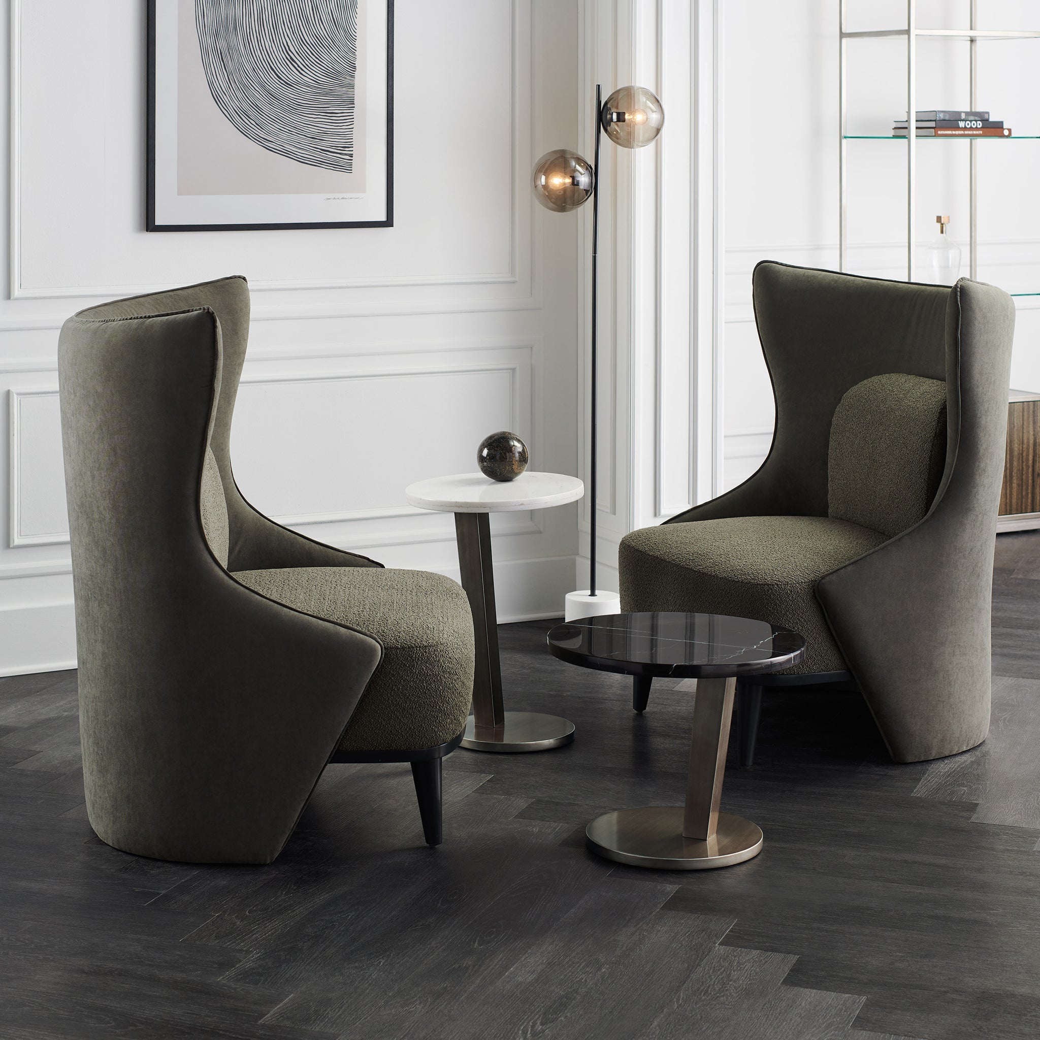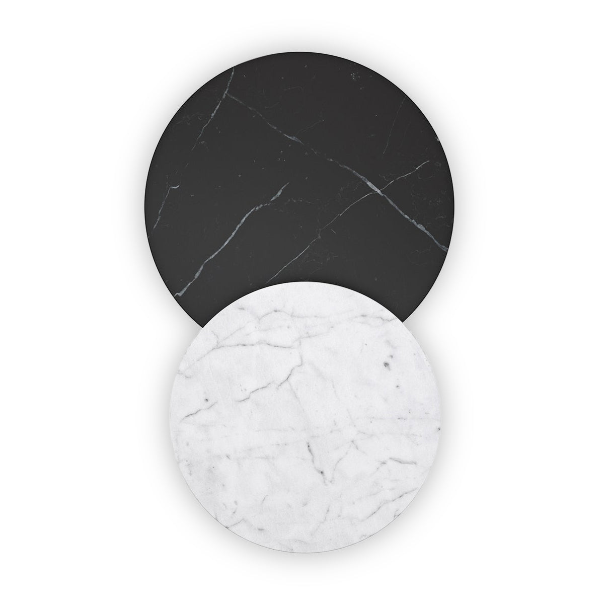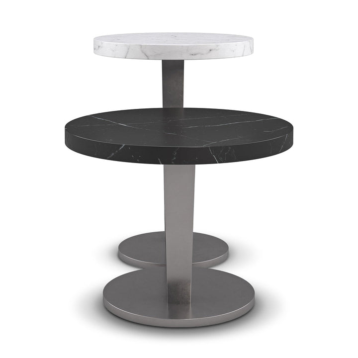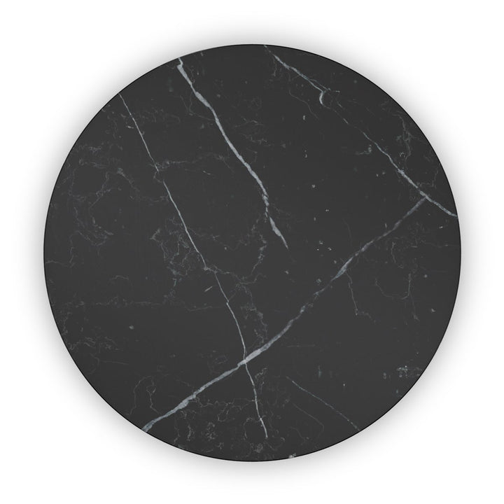 Channel elegance and sophistication to your home decor by adding this accent table. The Black Stone with White veins adorns the top, exuding timeless beauty. Its slightly bent metal frame complements its Smoked Stainless base, giving it a chic appearance. This piece is simple yet versatile, making it an excellent accessory for any room.