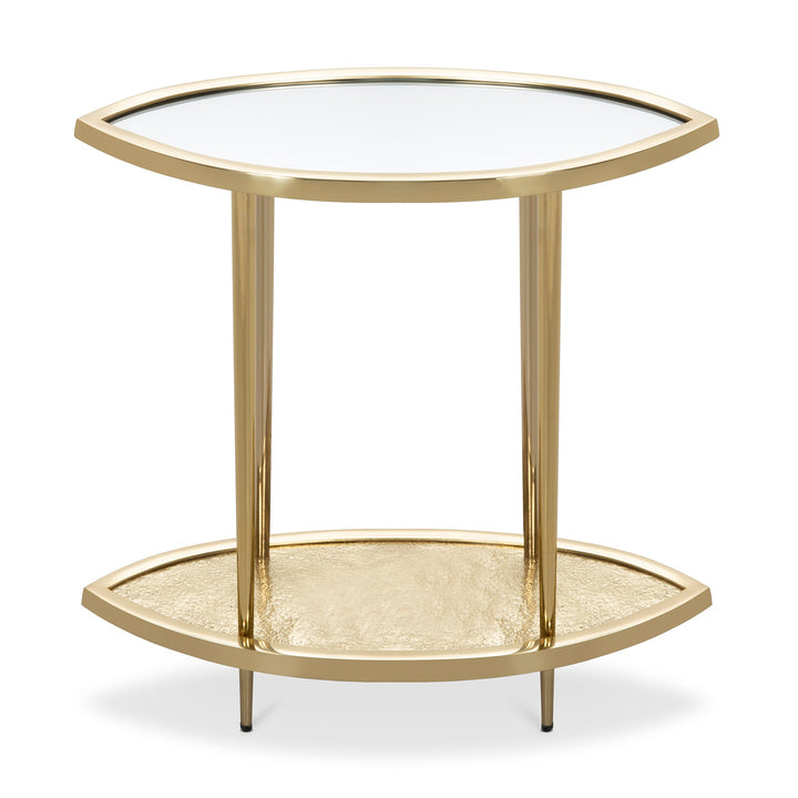 Flaunting a two-tier, leaf-shaped structure, this end table is a flawless fusion of form and function. The tabletop is fitted with a clear mirror, while the lower shelf is decorated with a rough, hand-hammered texture. Its base is entirely made of Stainless Steel, whereby the legs are covered in Polished Brass finish elevating the overall appearance.