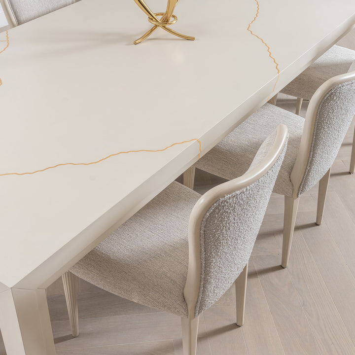 Linear furniture pieces are ever-classic, and Marloe Dining Table is no different. The gorgeous unit is finished in Lacquered Zogeiro over a Kintsugi Gilt top. Stepped Recessed Frieze and legs with Gilt feet complete the silhouette, offering the desired amount of grace.