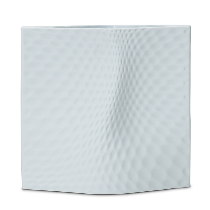 The Mathelado Bianco Grande Vase brings sophisticated scale to your decor. Made from fine Porcelain with a Matte White finish, this large vase captures the essence of ""hammered"" art and ""mathematica"" precision. Its name perfectly encapsulates this blend, offering a piece that is both unique and elegant. Ideal for grand floral displays or as a statement decorative piece, it adds a touch of contemporary elegance and sophistication to any room.
