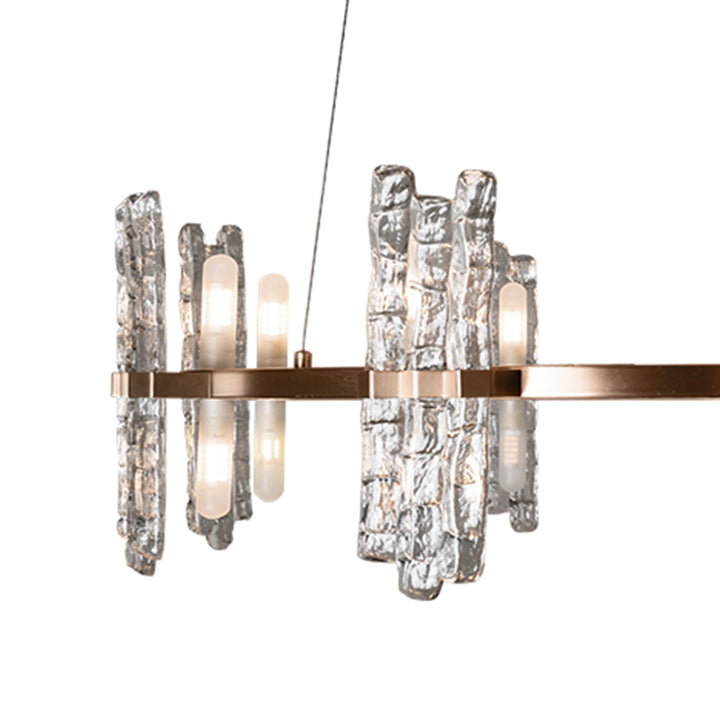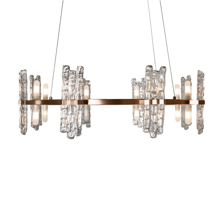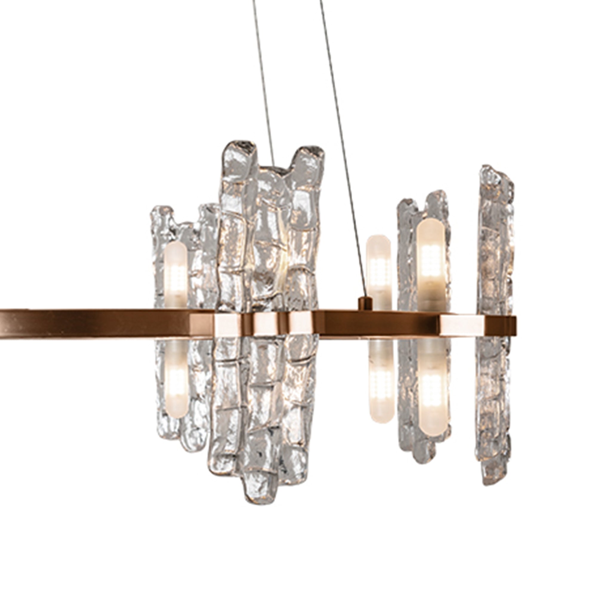 A network of batched glass frames in an attractive pattern sheds a warm glow around. The Maxton Chandelier aesthetically holds the Glass and Metal work on a circular profile. The Brass finish adds to the classic-modern style, suitable for living spaces and dining areas.
