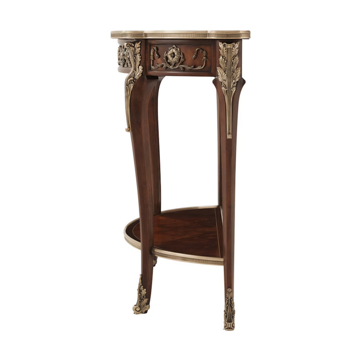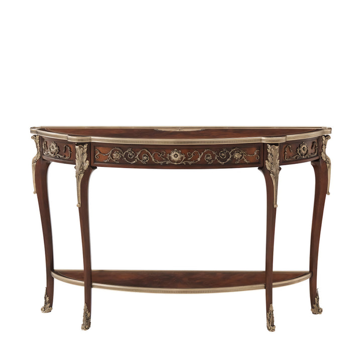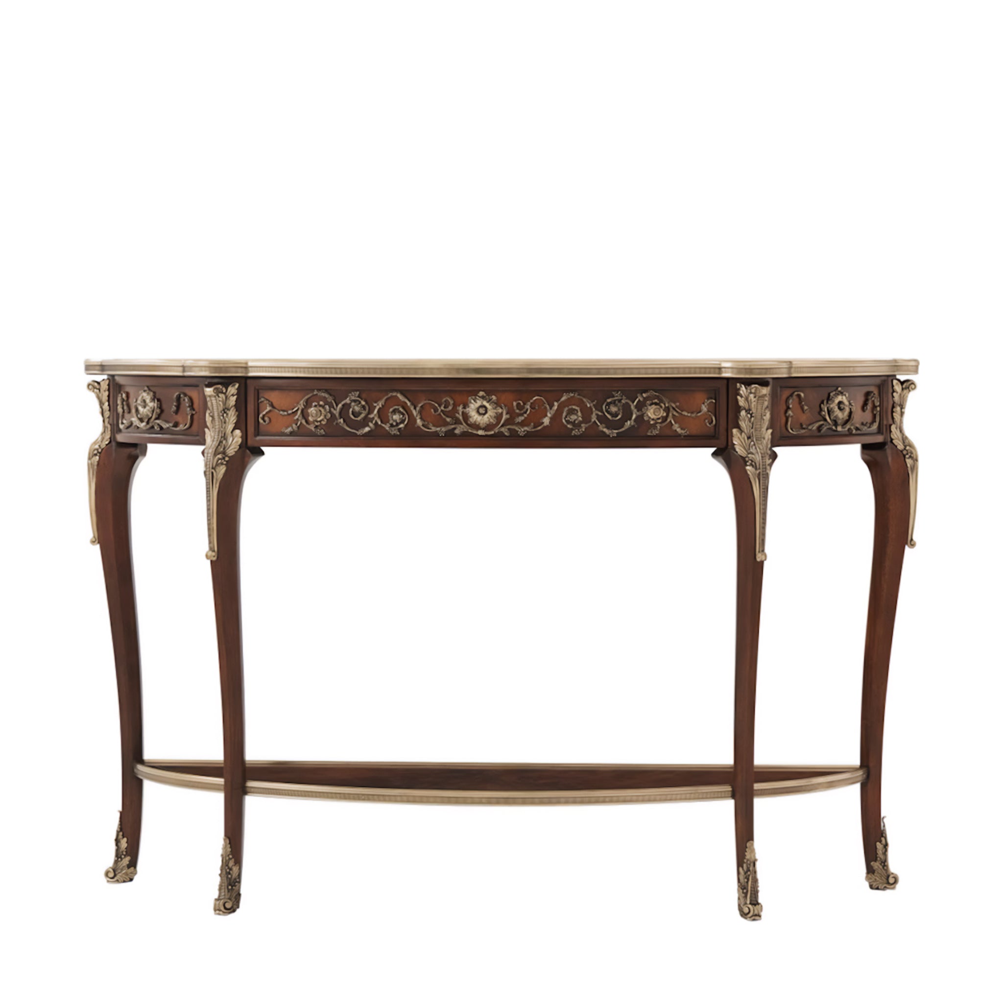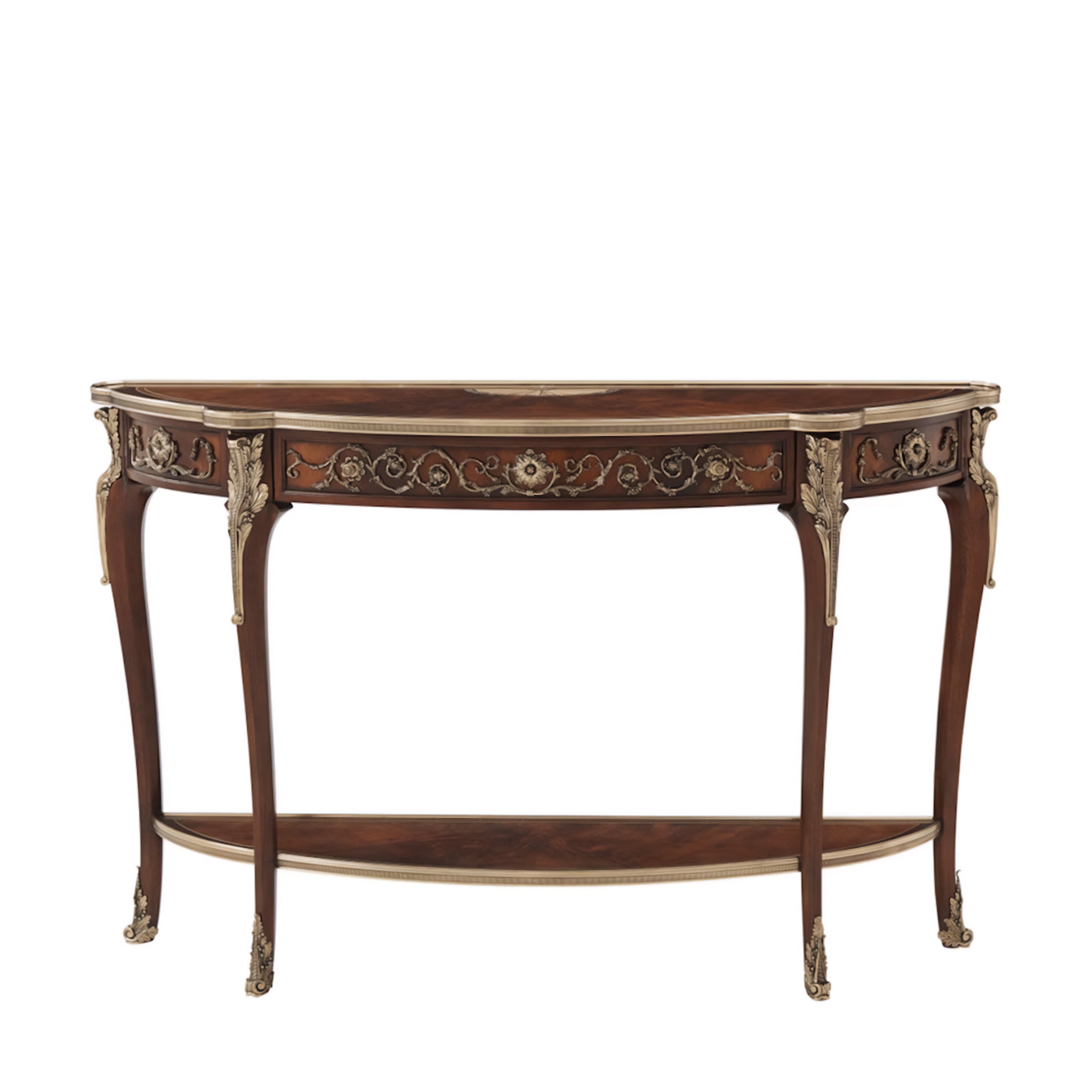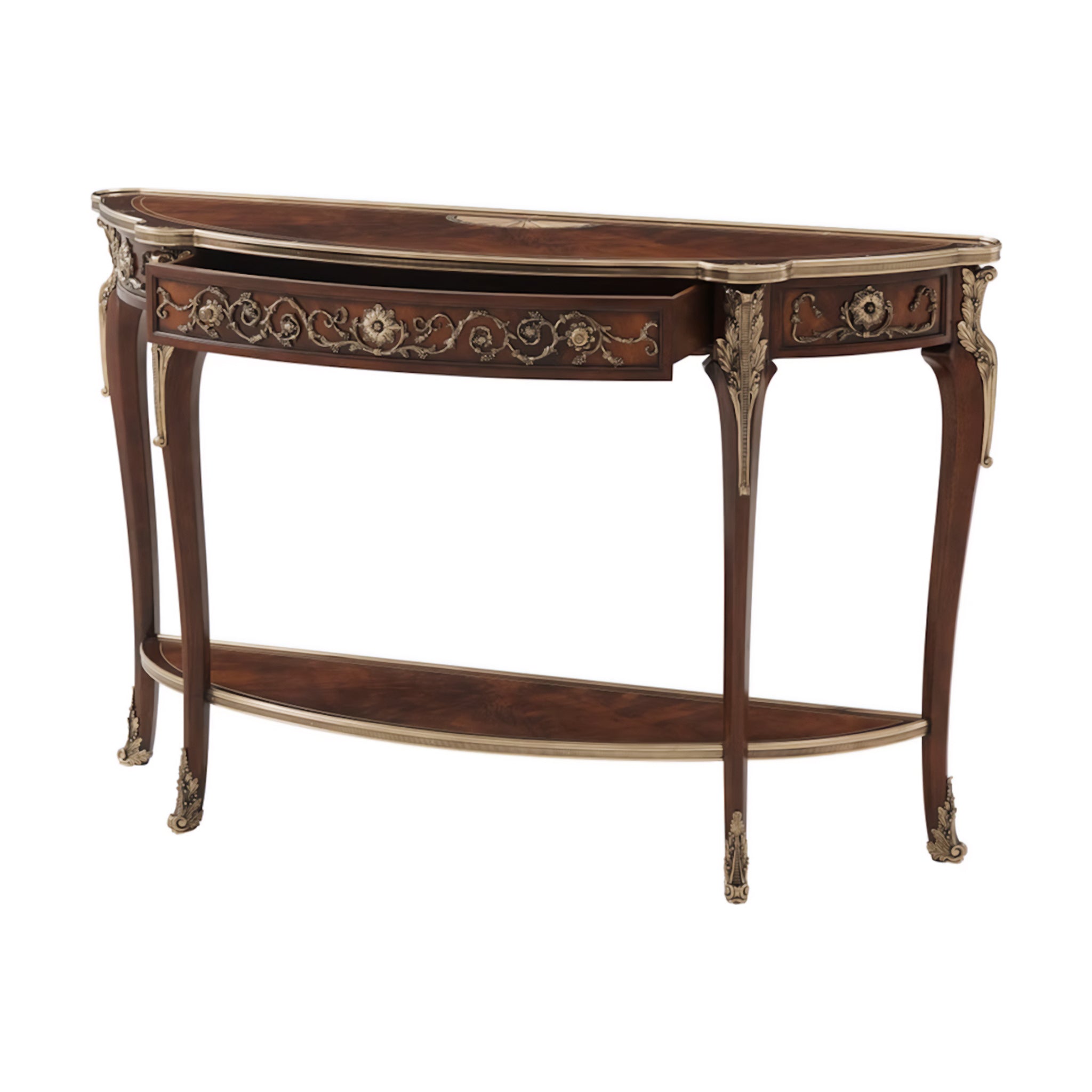 The Melina Console Table is a refined luxury piece made from flame Mahogany and Morado, showcasing woodworking expertise. The table features fan marquetry reminiscent of peacock feathers, delicate Brass lines, and Mother-of-Pearl inlays. The bowfront old English top, bound in Brass, adds whimsy to its classic charm. This piece features an old English finish cast Brass frieze with intricate Acanthus scrolls, symbolizing beauty and growth. A single drawer provides practical functionality, while cabriole legs with hand-cast Brass Acanthus leave and scroll feet harken back to an era of elegance. A Brass-bound and veneered under tier offers both style and practicality, perfect for storing cherished decor.
