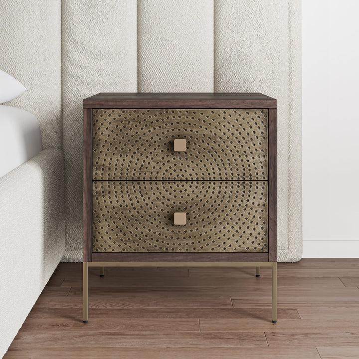 A Solid Acacia Wood lacquered finished nightstand holds two deep drawers that display beautiful tones, sweeping wood grains. The visually appealing solid mango wood internal structure makes one fall for it, combined with the front drawers cladded with Brushed Brass sheet in a Hand Hammered Antique finish. Its two Brushed Brass center knobs come with ease, securing your belongings. Four linear Iron legs in Brushed Brass hold up this piece, giving a solid and unique feel.