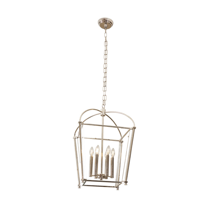 Echoing the silhouette of vintage lanterns, this chandelier brings a sense of tradition into your home. Crafted from stainless steel with a nickel finish and accented with clear crystal, it exudes a balanced and timeless presence.