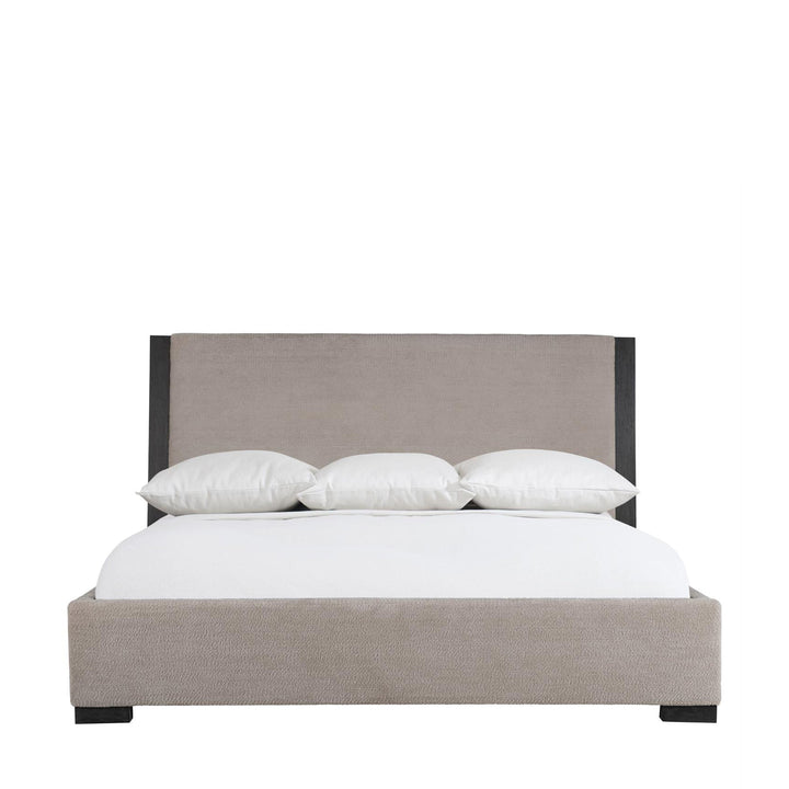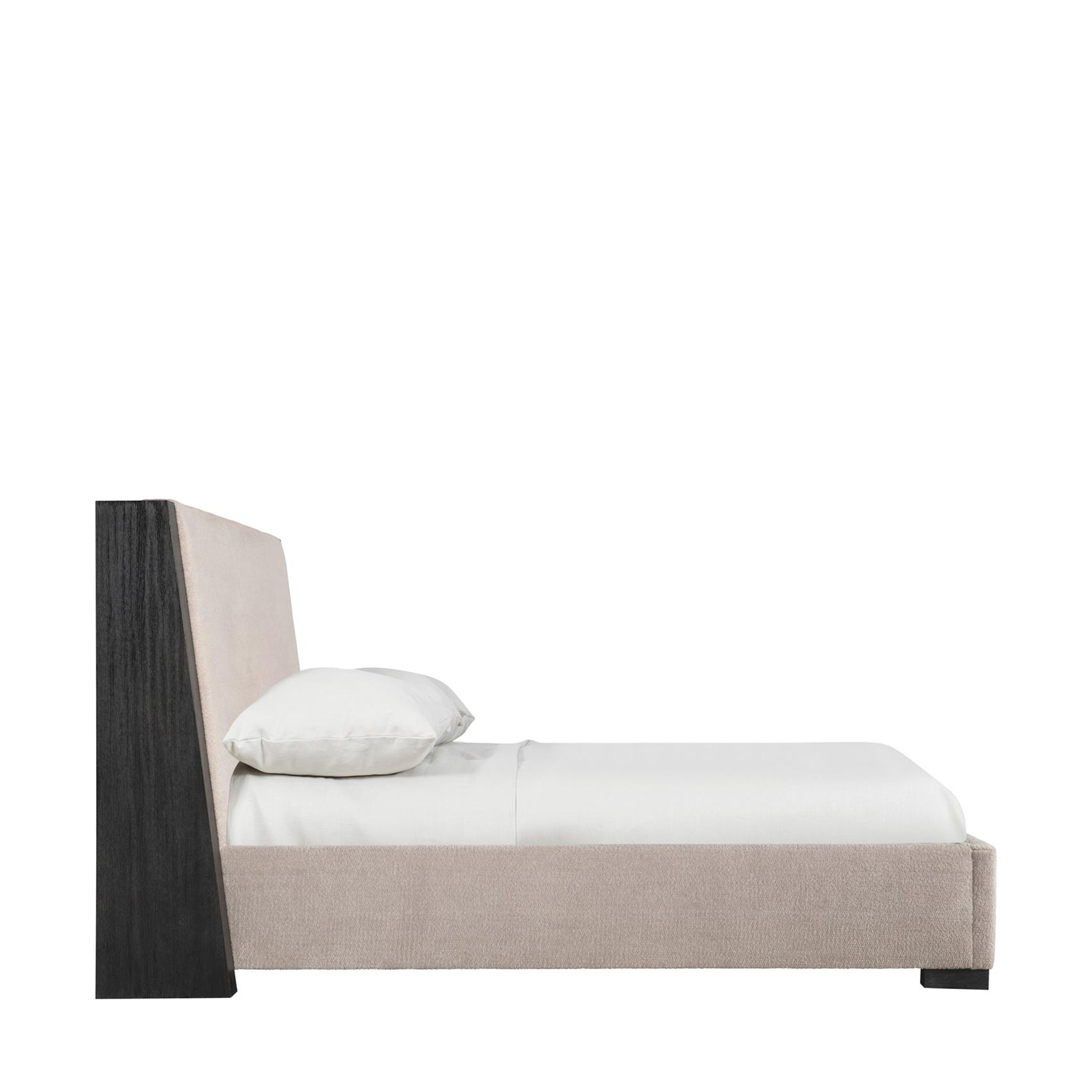 This fabric upholstered king bed is an excellent choice if you are looking for something minimal yet alluring. Its exposed wooden feet and angled headboard dressed in Ebonized Pine finish ensure an exquisite touch. Add it to your elegant bedroom and experience luxurious lounging in style.