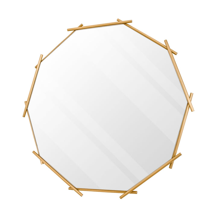 Crafted in a circular tube Stainless Steel in Electroplated Brushed Brass finish, revealing a decagon-shaped frame. A White solid wood was delicately constructed at the back to strengthen its structure before placing its clean and smooth clear mirror, flawlessly balancing its configuration. The Mikado Mirror is designed with minimalism in mind while conveying a luxurious image, and it will instantly glam up your wall.