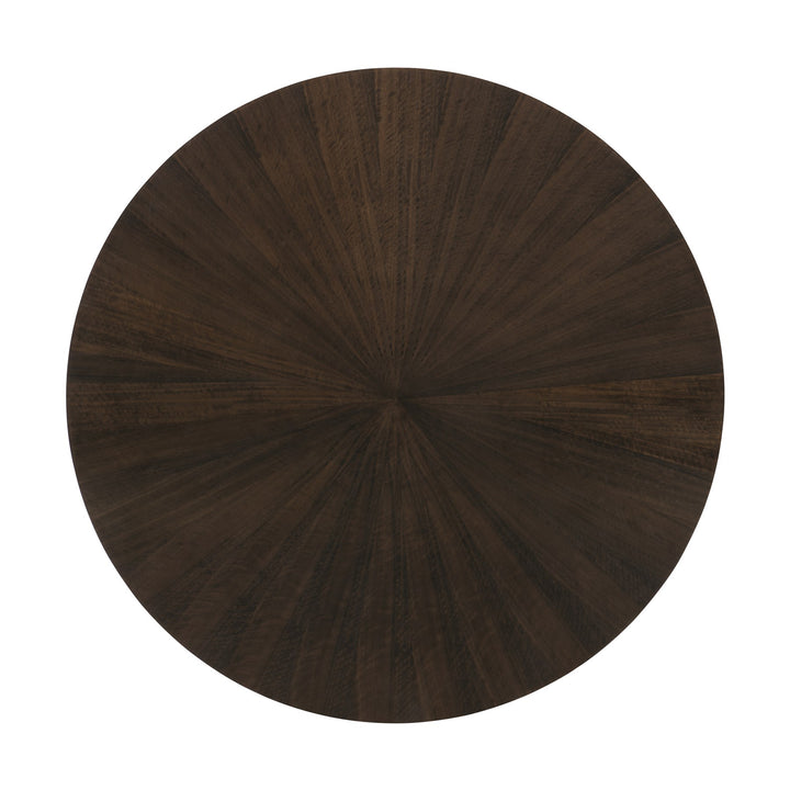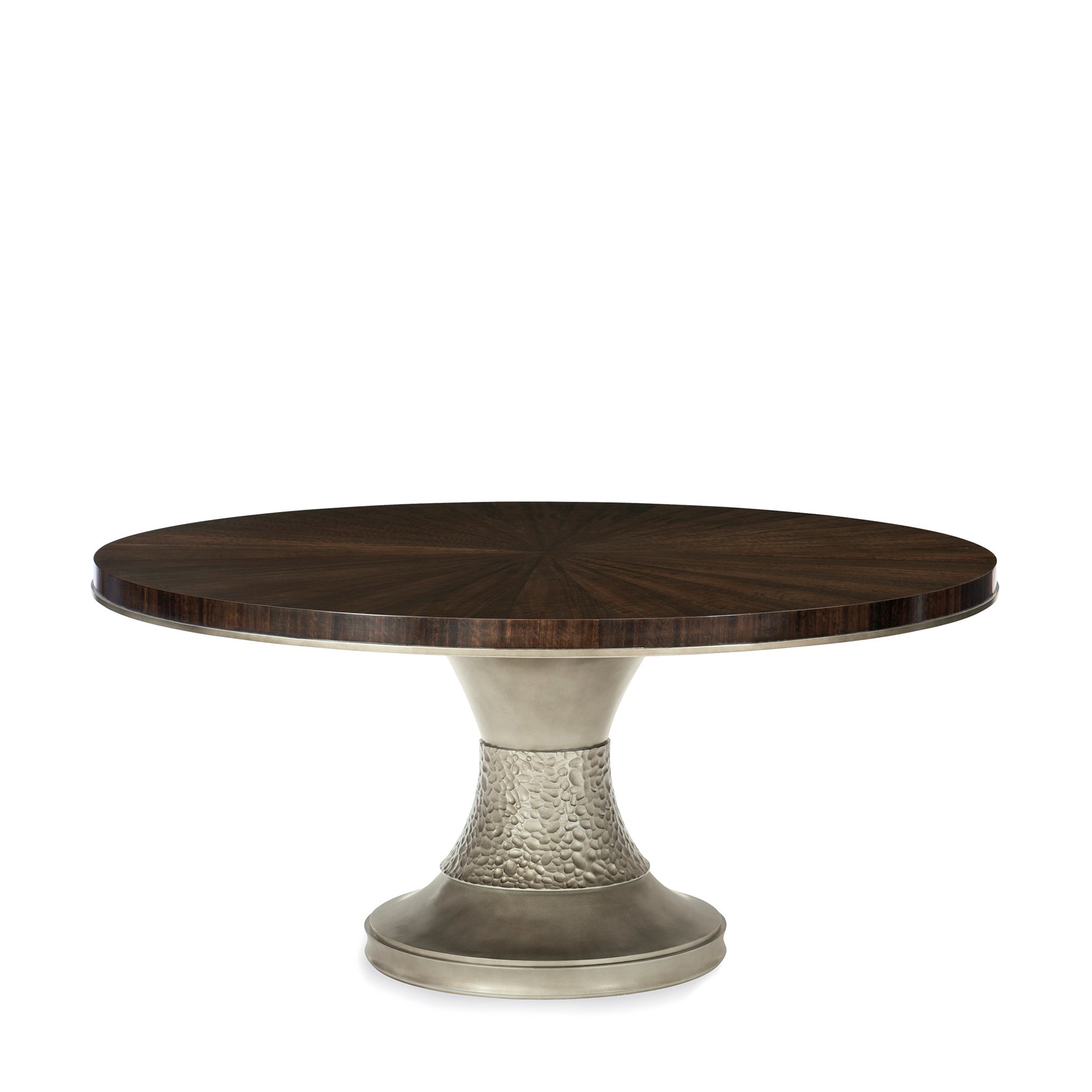 Witness the fusion of dramatic sculptural details with this round dining table, conveying contemporary flair. The Fumed Figured Eucalyptus, bathed in a dark Aged Bourbon finish, emanates a warm glow. The starburst inlay pattern, surrounded by a band of Smoked Bronze accent molding, adds exquisite detail. The real showstopper is the pebbled Smoked Bronze base, a work of art that immediately captures your attention.