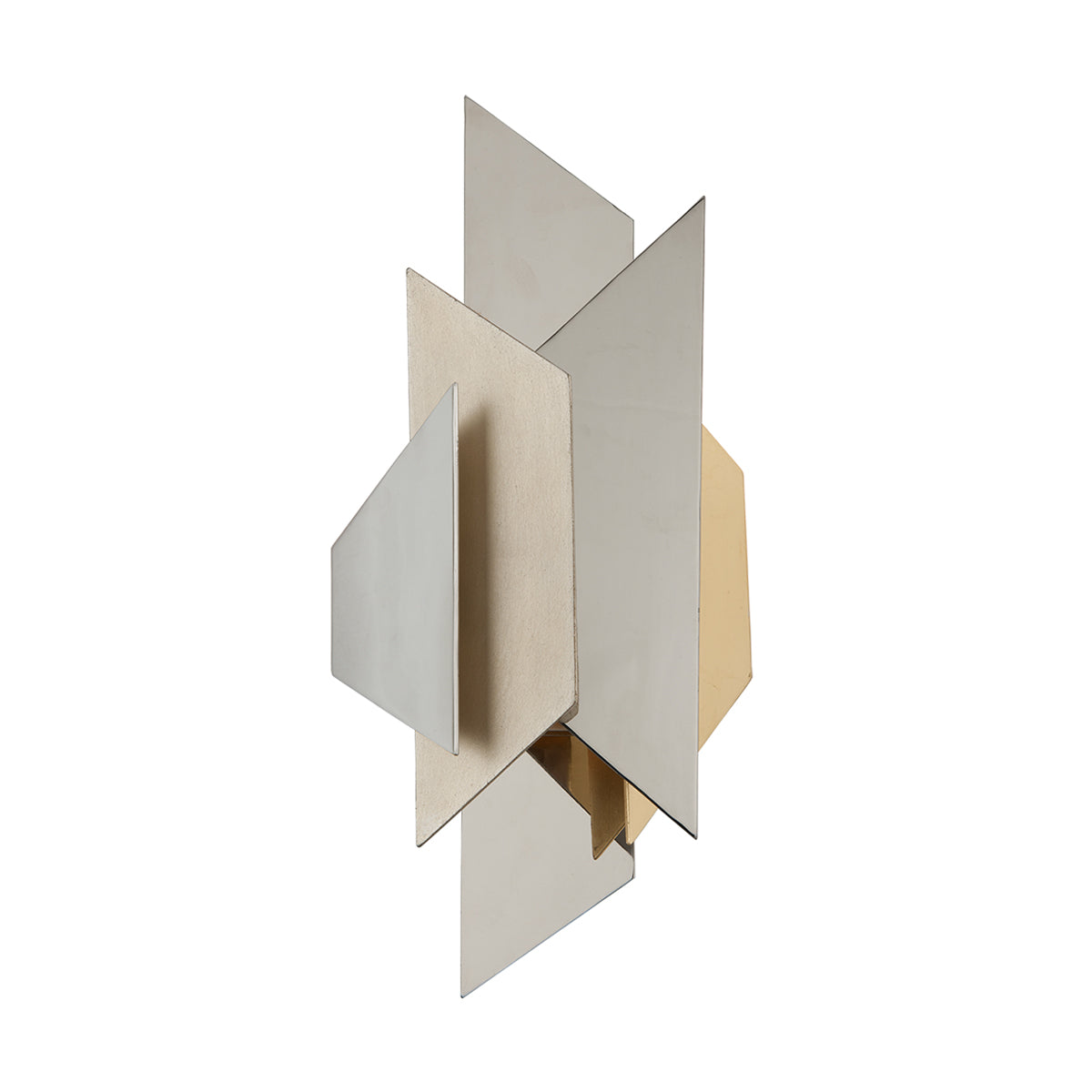 Modernist Wall Sconce is adorned with a bunch of hanging blades finished in a combination of Gold and Silver Leaf. Owing to its sharp, geometric shape, this luxurious piece adds a dramatic touch to the space while retaining its sophistication.