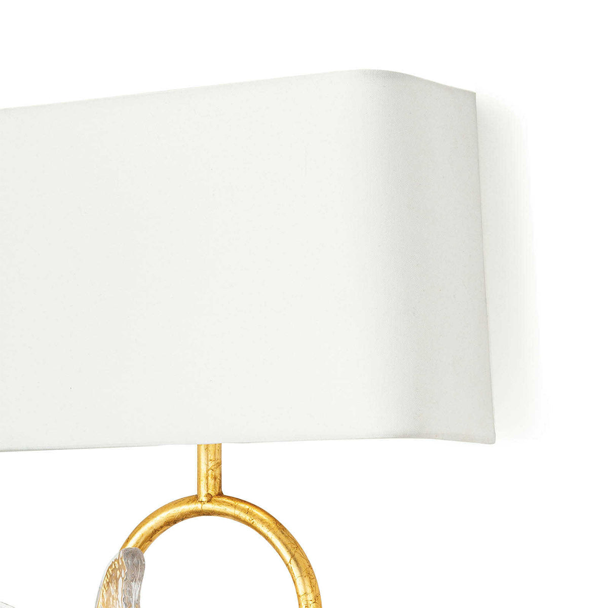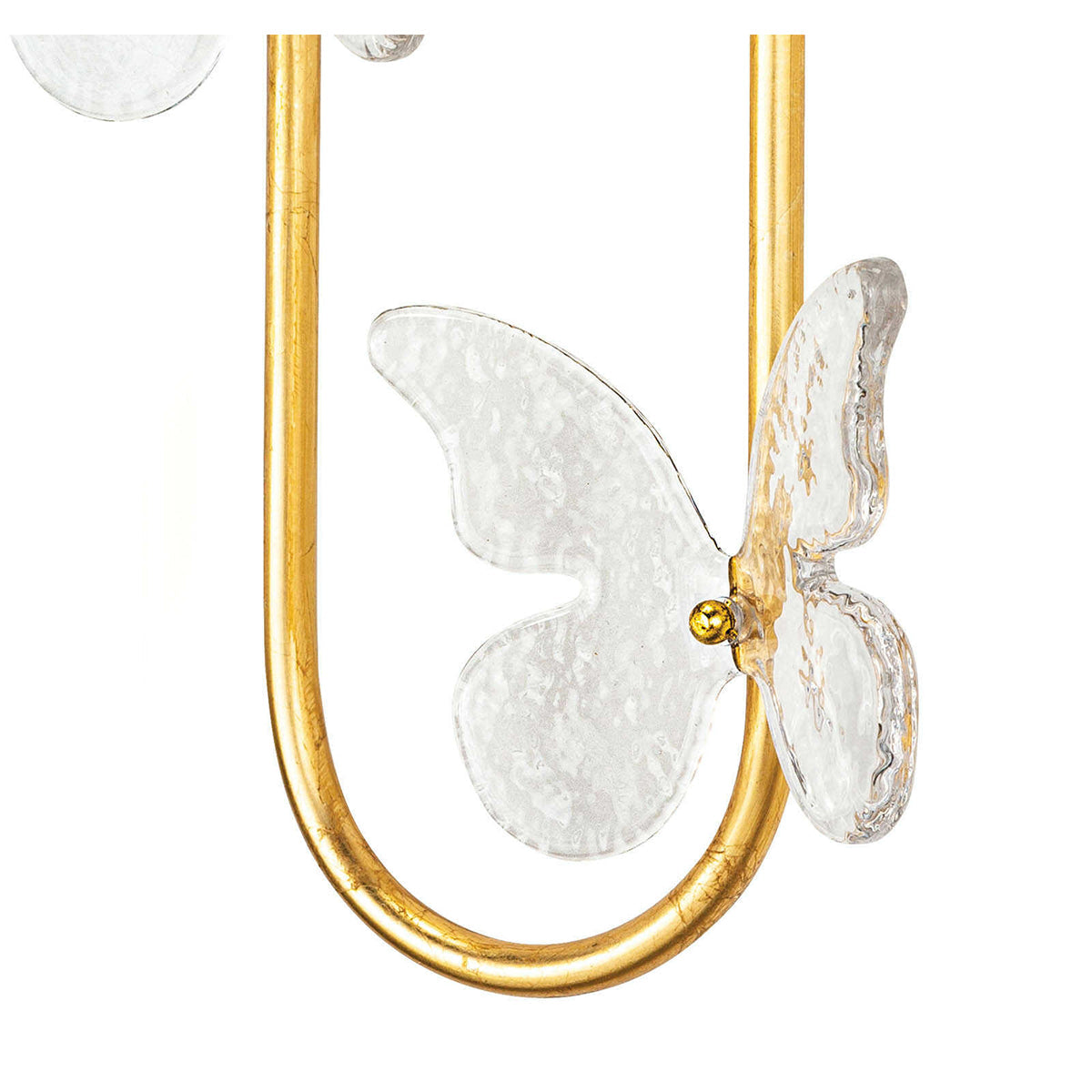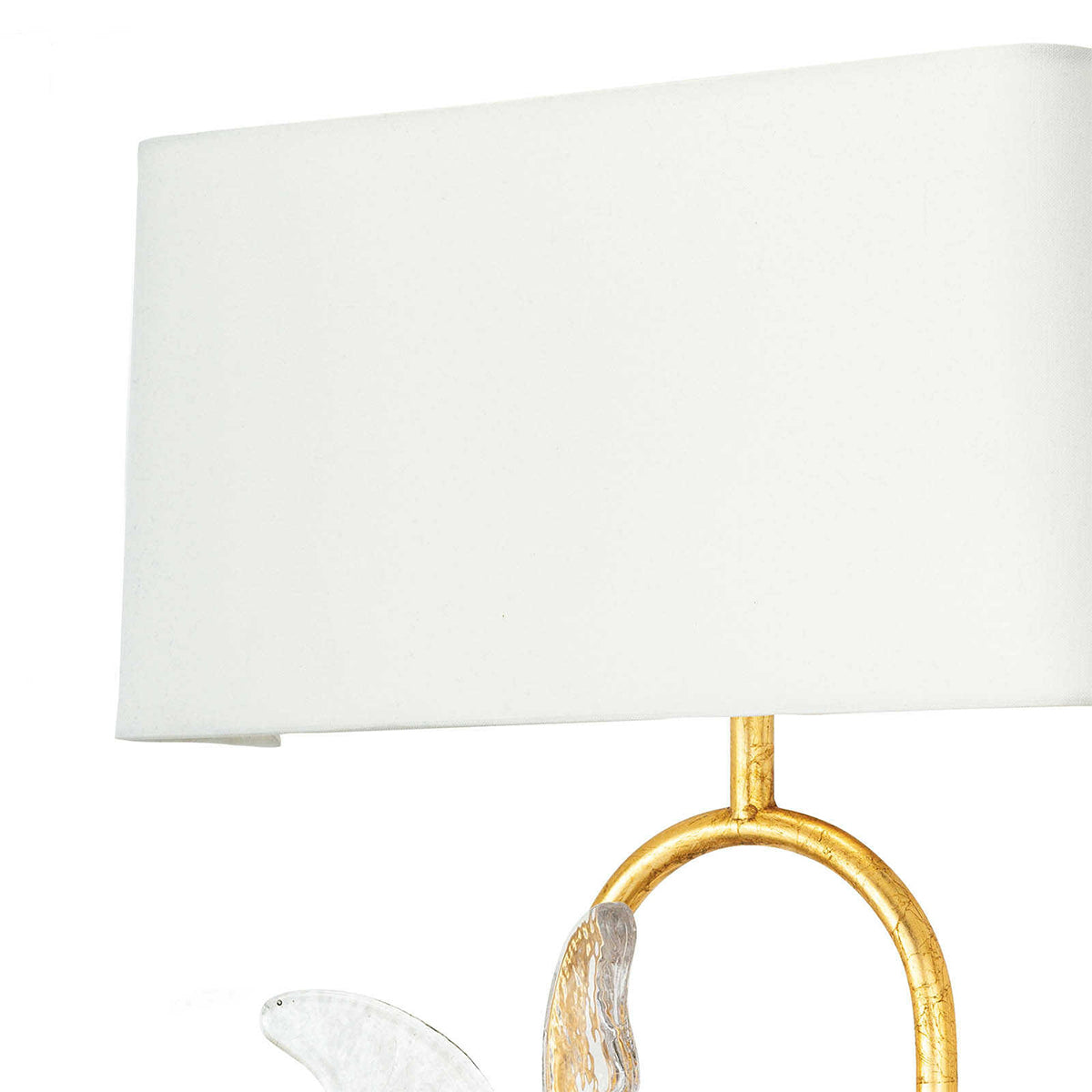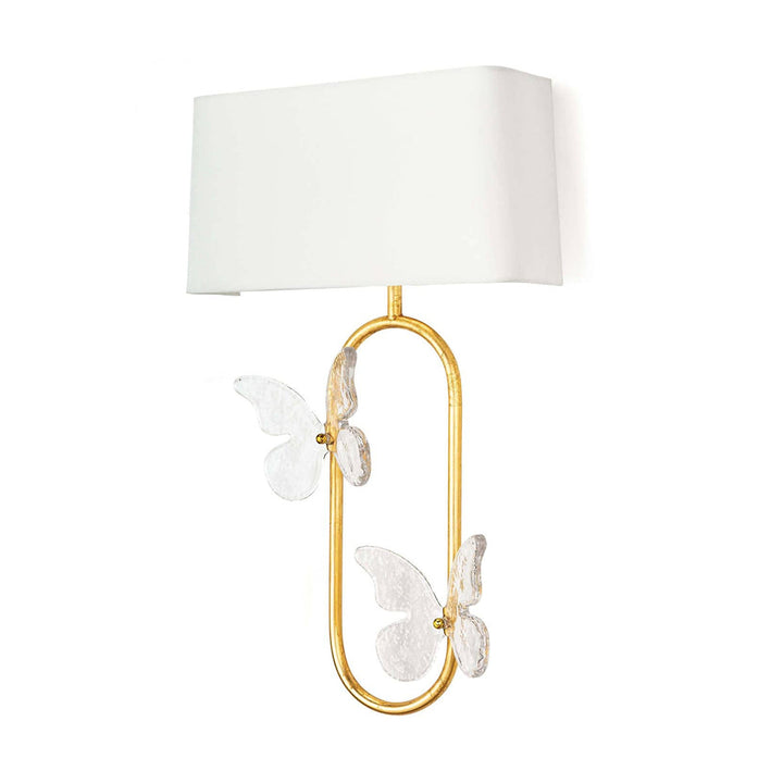Glam up your bedroom or living space with this stunning wall sconce. The thin, oval steel frame bathed in Gold Leaf finish hugs two clear glass butterflies. Combined with a shallow, rectangular Natural Linen shade, the Monarch Sconce is whimsy and beautiful for any setting around.