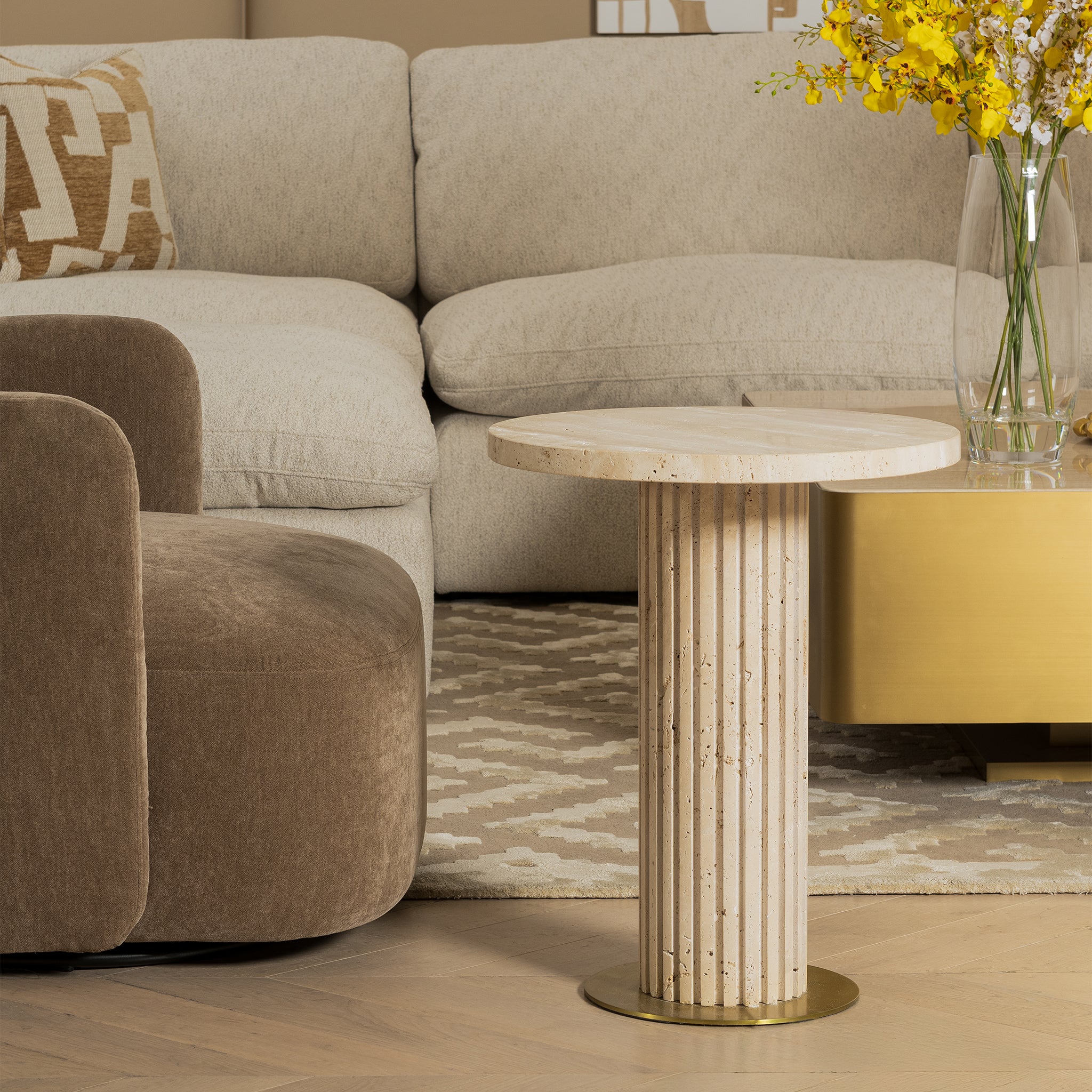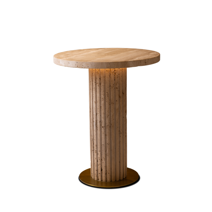 Radiating sculptural elegance, this end table showcases a column design in beige travertine. A soft LED undermount lighting accentuates its refined texture, while the brushed brass stainless steel base lends a modern, sophisticated touch.