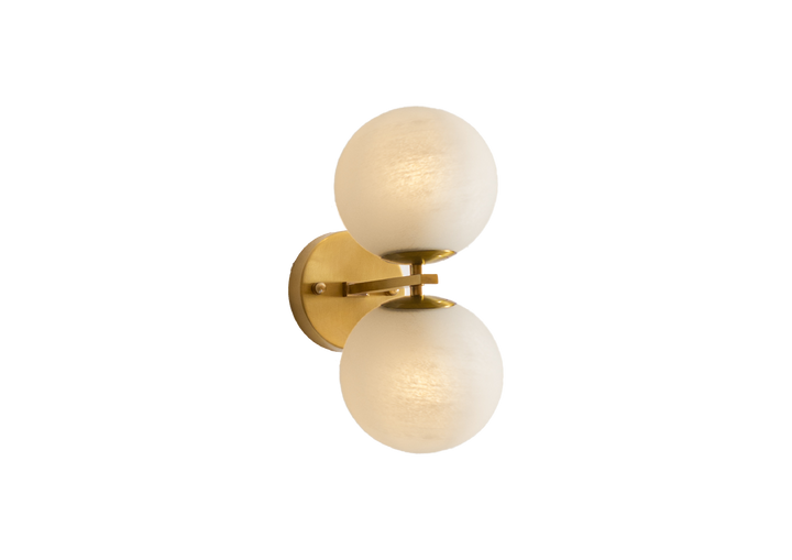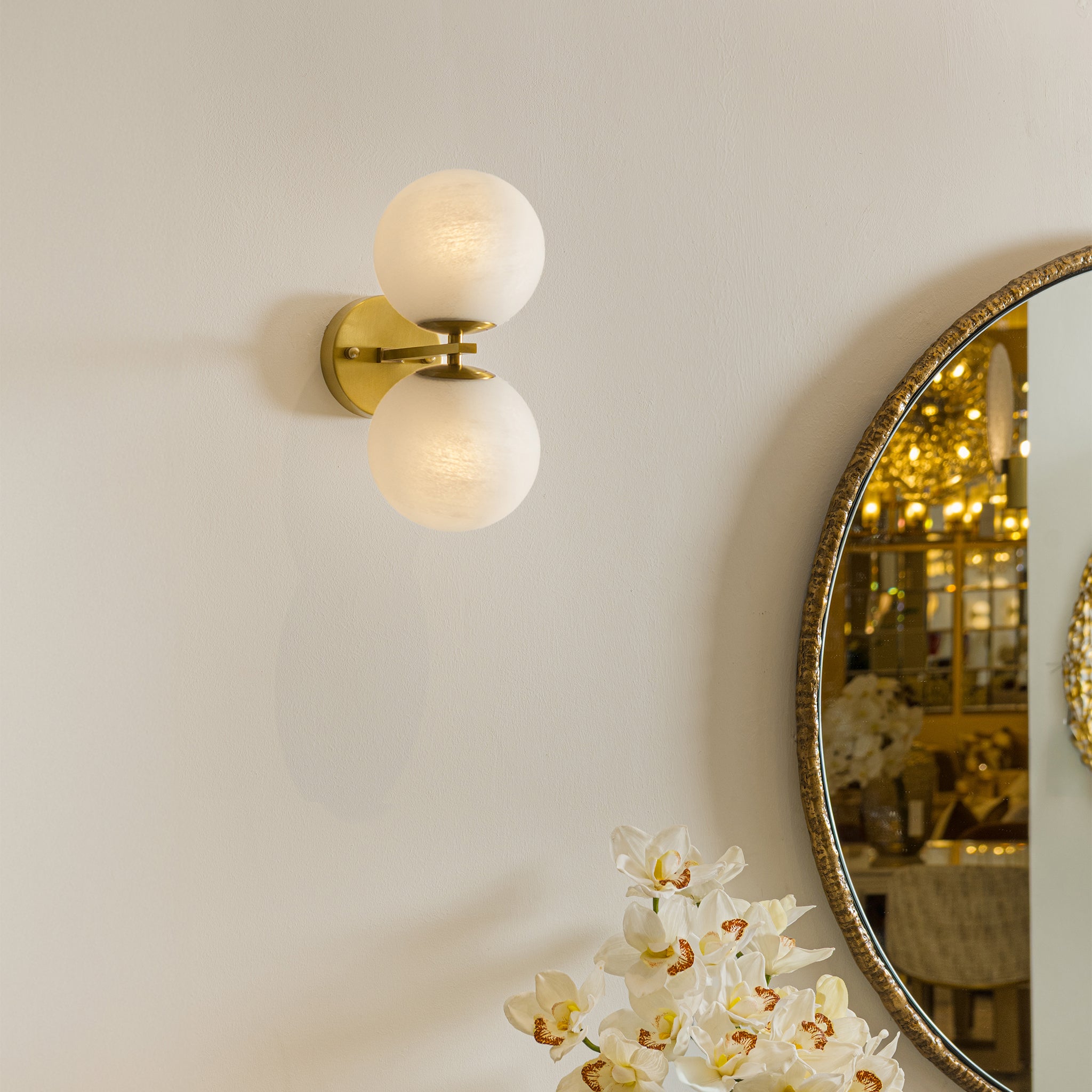 This wall lamp embodies the essence of mid-century modern design with its refined balance of form and function. The antique brass frame contrasts beautifully with cloudy white glass globes, creating a soft, inviting glow.