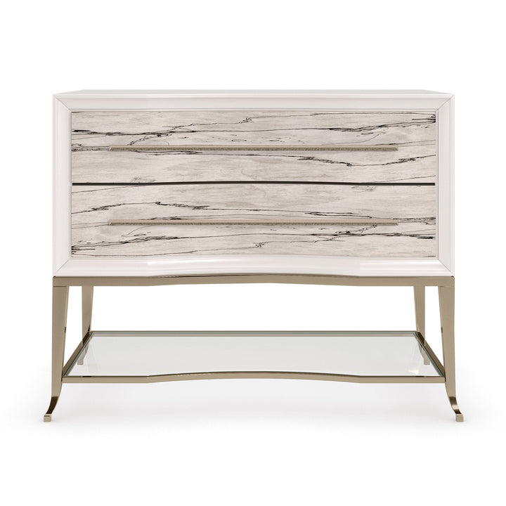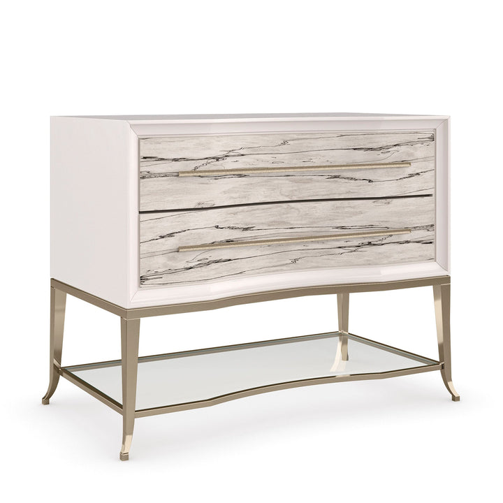 Showcasing an organic element with a pinch of elegance, this dresser is sure to impress. It has two soft-close drawers with enticing Snowcap Organic detailing on the fronts, and it compliments the Pearly White case beautifully to provide depth and texture to your space. Standing elegantly on a metal base bathed in Majestic Gold, it gives a clear glass bottom shelf for extra storage.