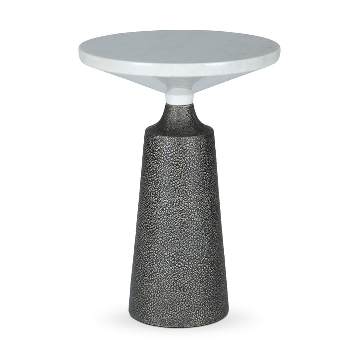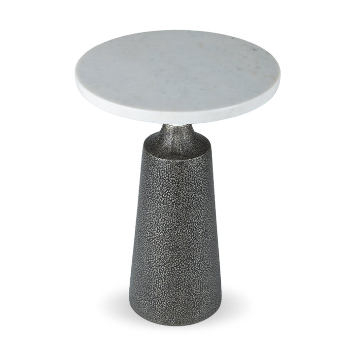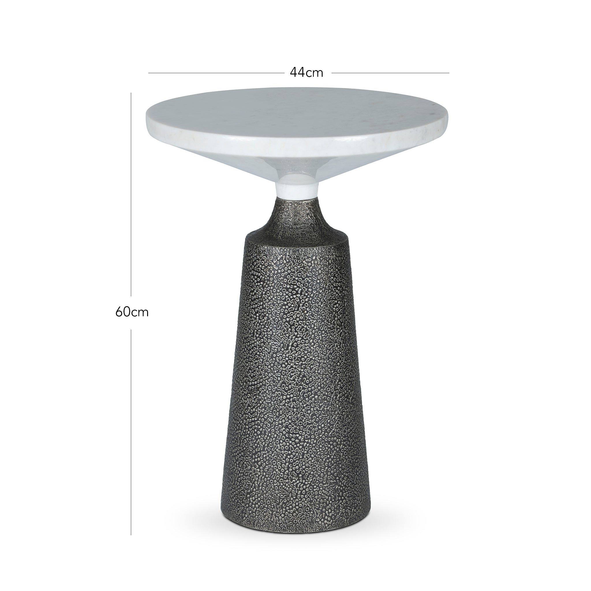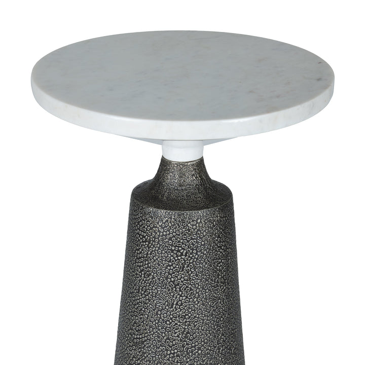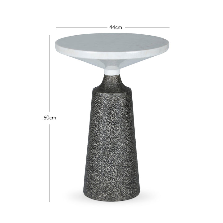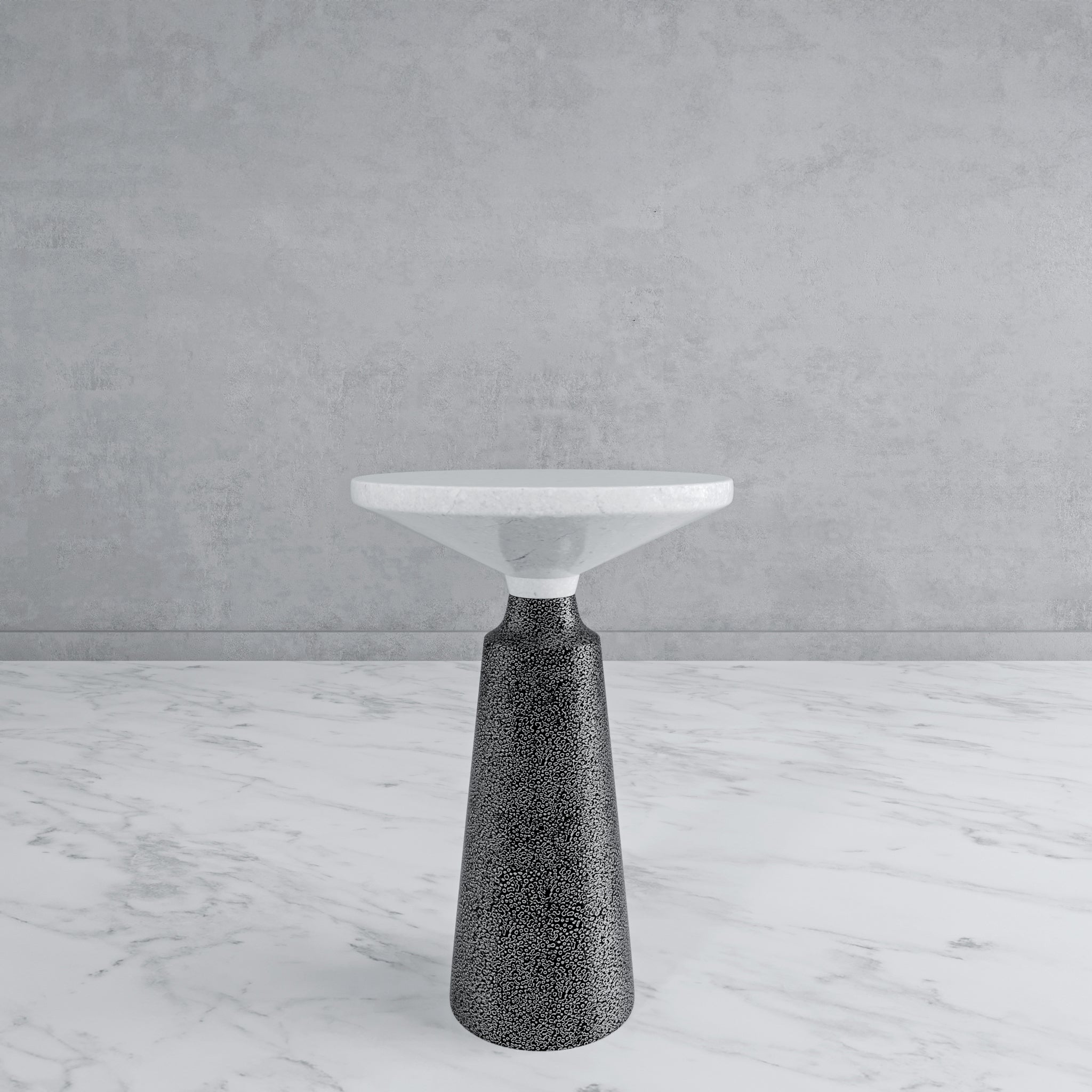 Contemporary form marrying unique materials, this piece of furniture elevates your interior in no time. Be stunned by it's solid cone-shaped base cladded with a metal sheet in Hand Hammered dotted texture – intricate indeed! The pure and solid White Banswara Marble is honed to achieve a smooth transition and features a half bullnose edging. To boot, upper and lower rings build a stable connection between the base and the top.
