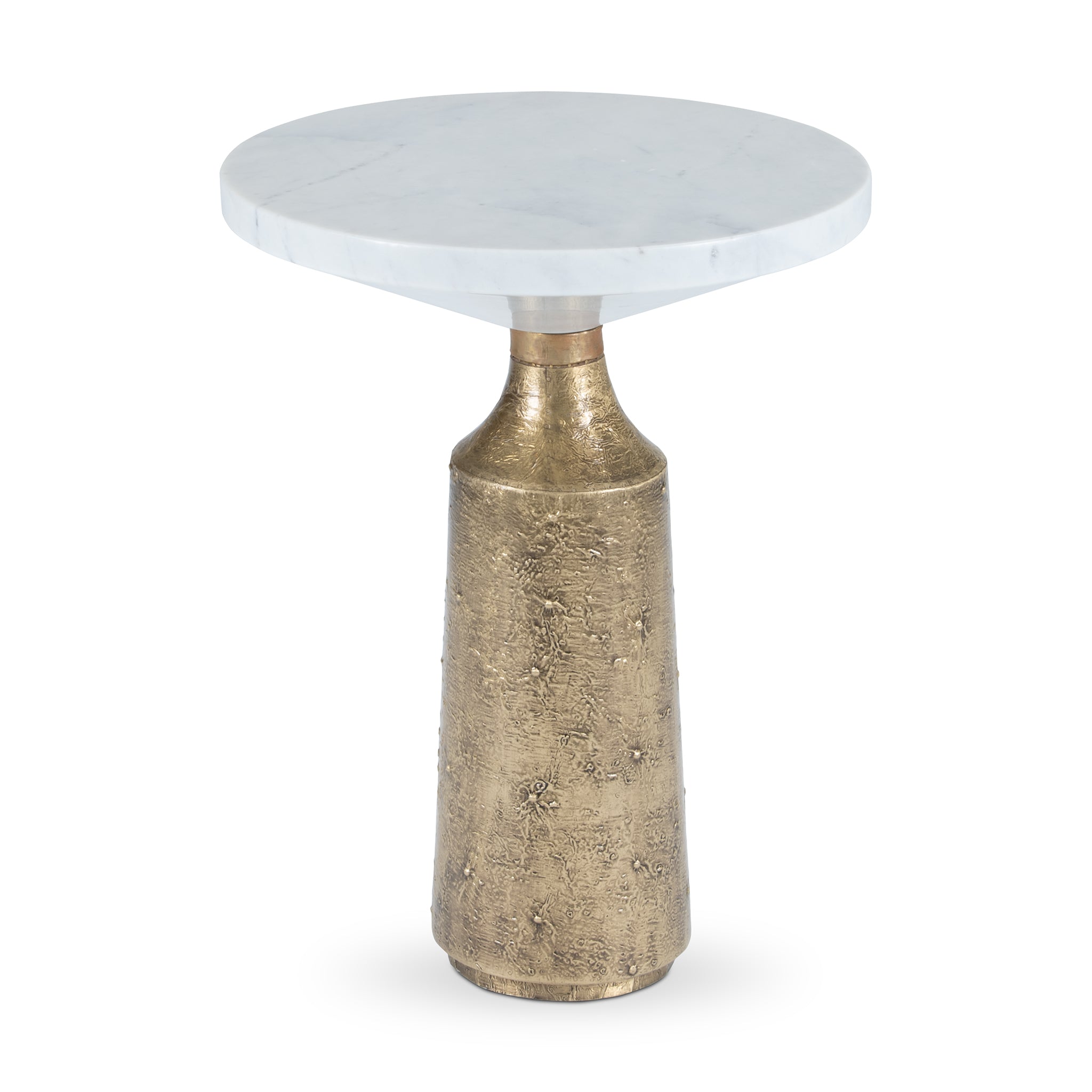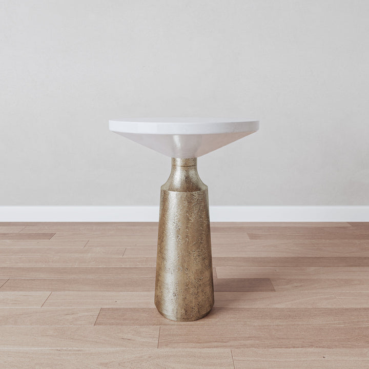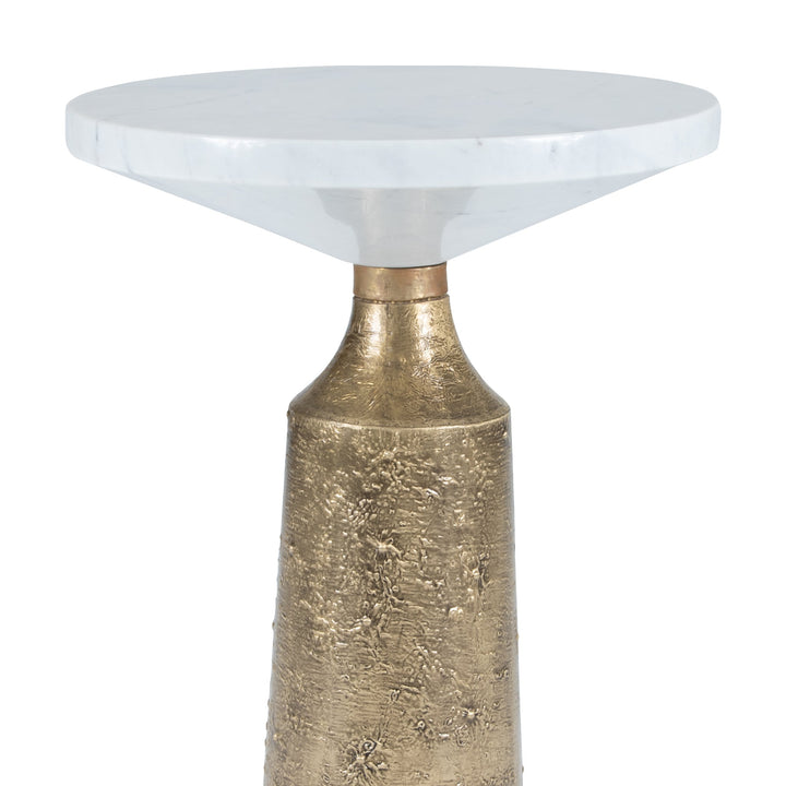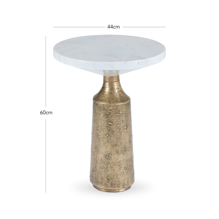 This stylish side table will be the main attraction of any room. It showcases a glossy White Banswara Marble top held by a cone-shaped base with a rounded tip that connects neatly to the surface. The solid wooden structure cladded in a Brass sheet with hand-hammered detailing shows off the natural wood grain-inspired design. Finishing it off is a Patinated Brass top coating.