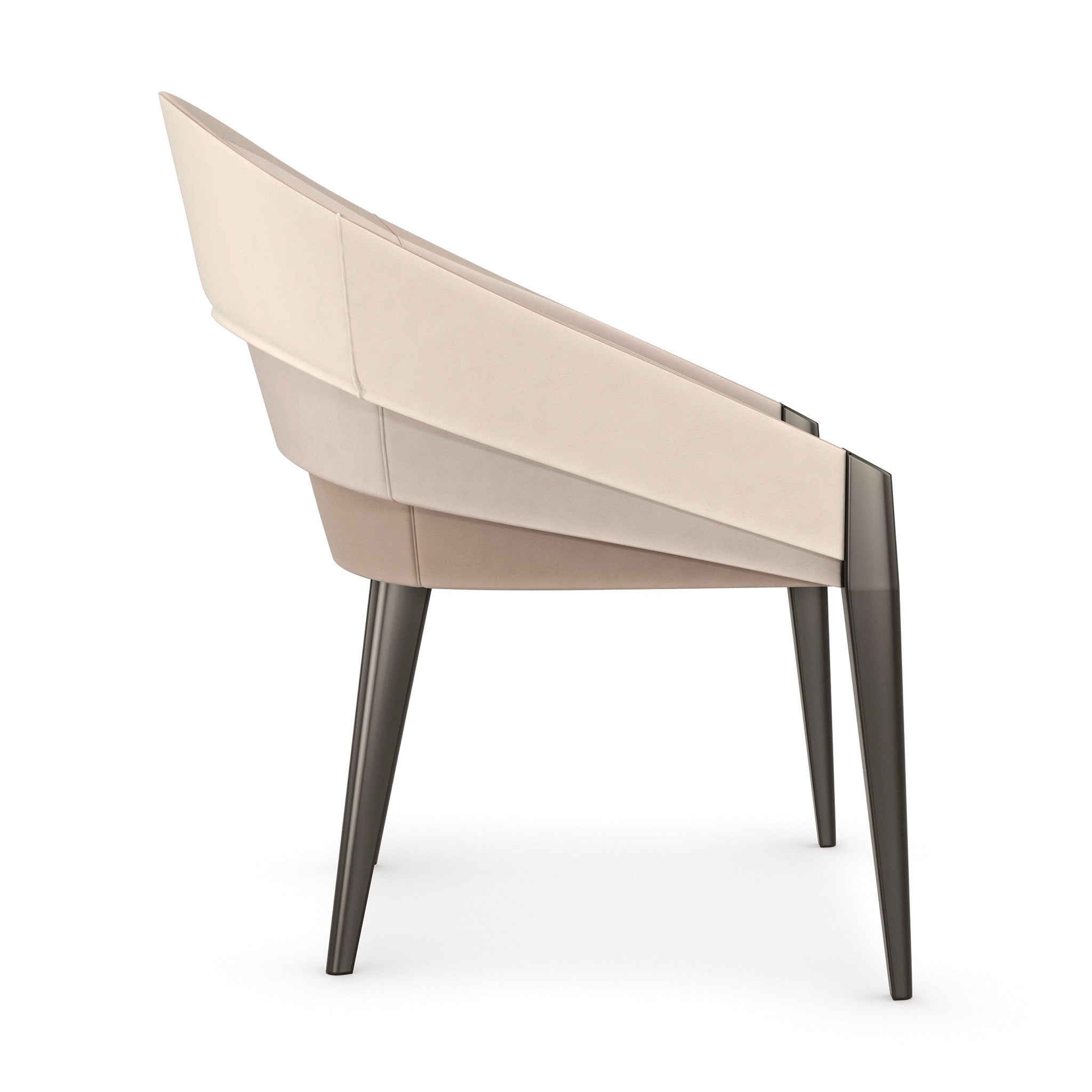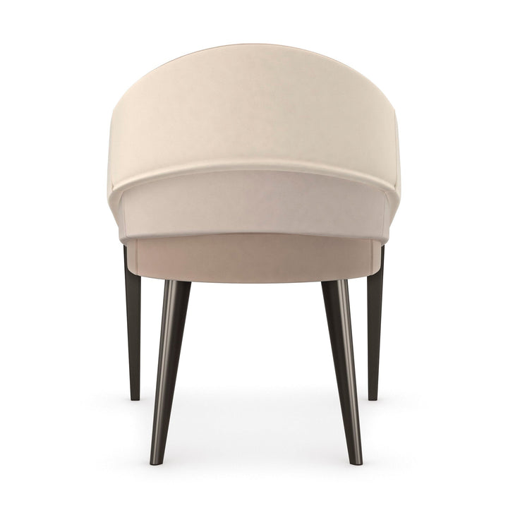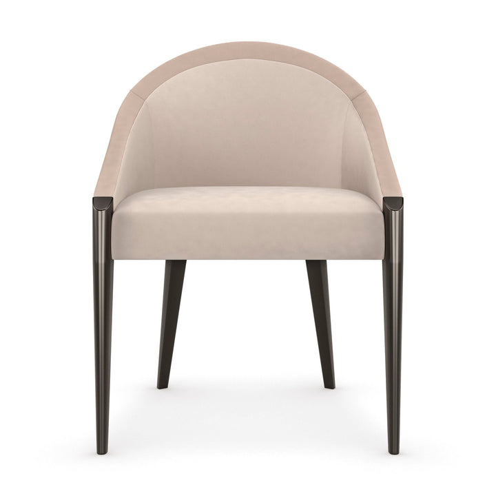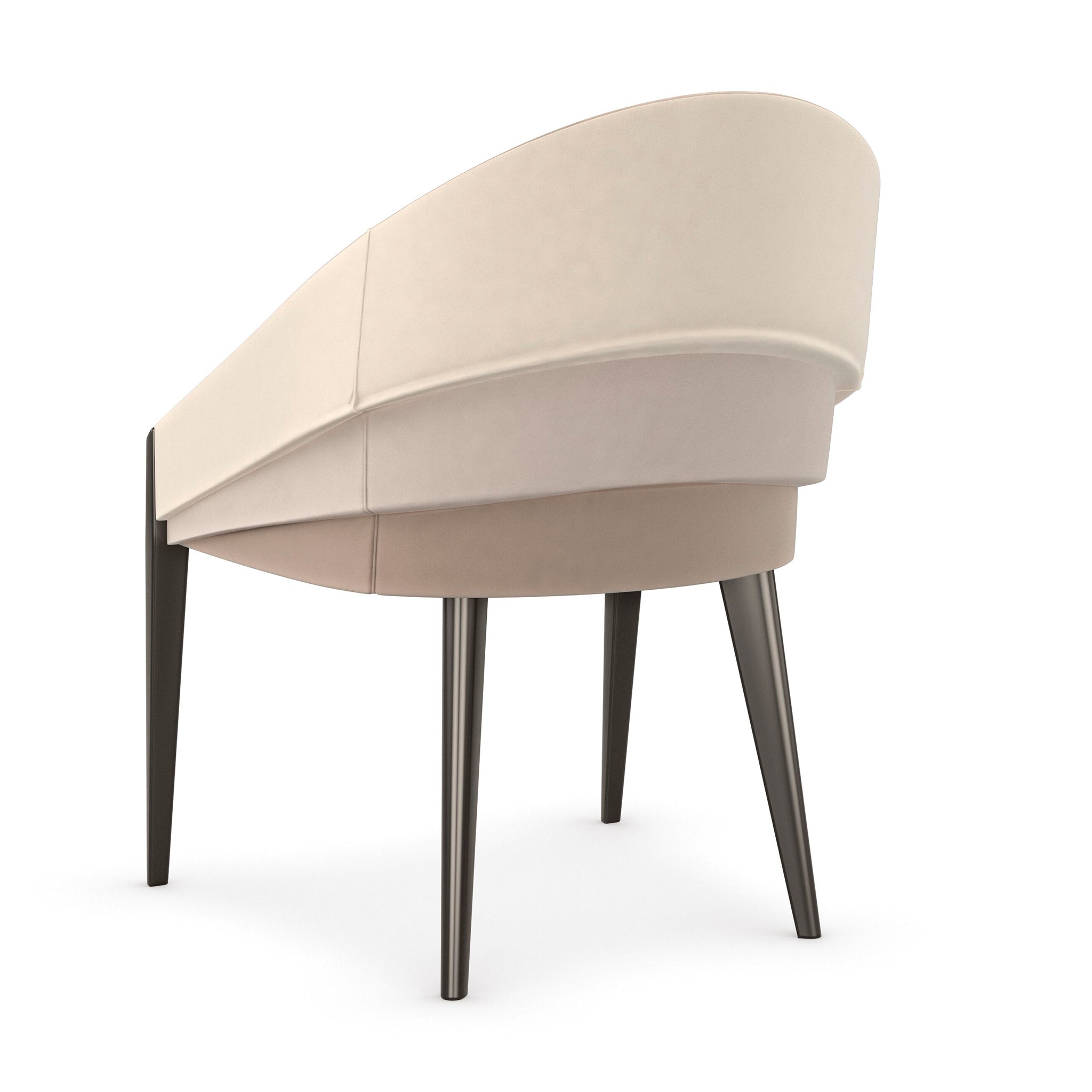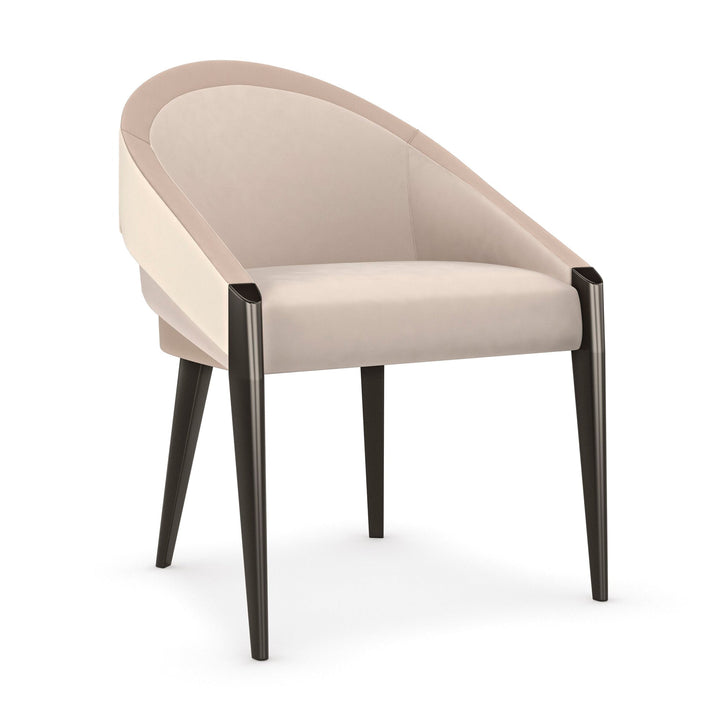 Designed for plush living spaces, this one-of-a-kind chair will create a focal point in any setting. Creating an ombre effect, its outer back has a recessed layout covered in varying velvet tones. Complementing the overall design, the piece rests on tall, tapered legs clad in a glossy and rich finish.