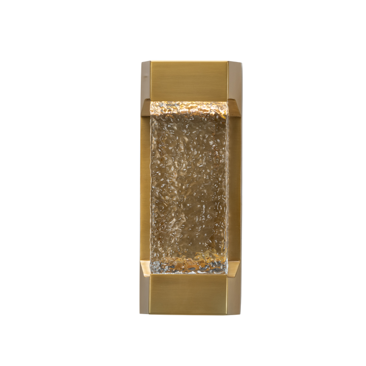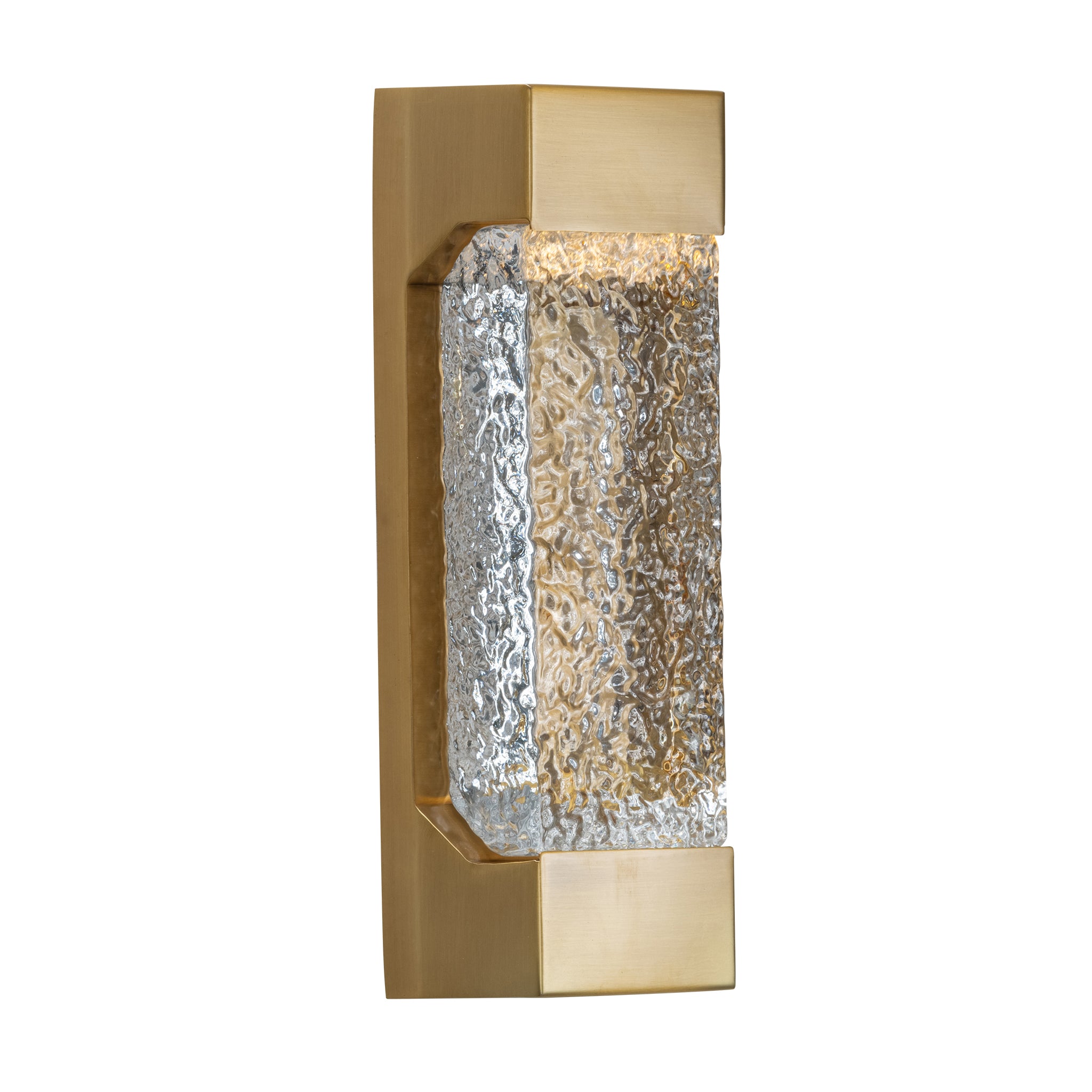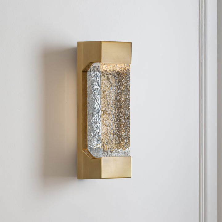 Echoing the chandelier’s art deco aesthetic, this wall lamp features thick textured glass set within a sleek brass frame. Perfect when paired with oriana collection.