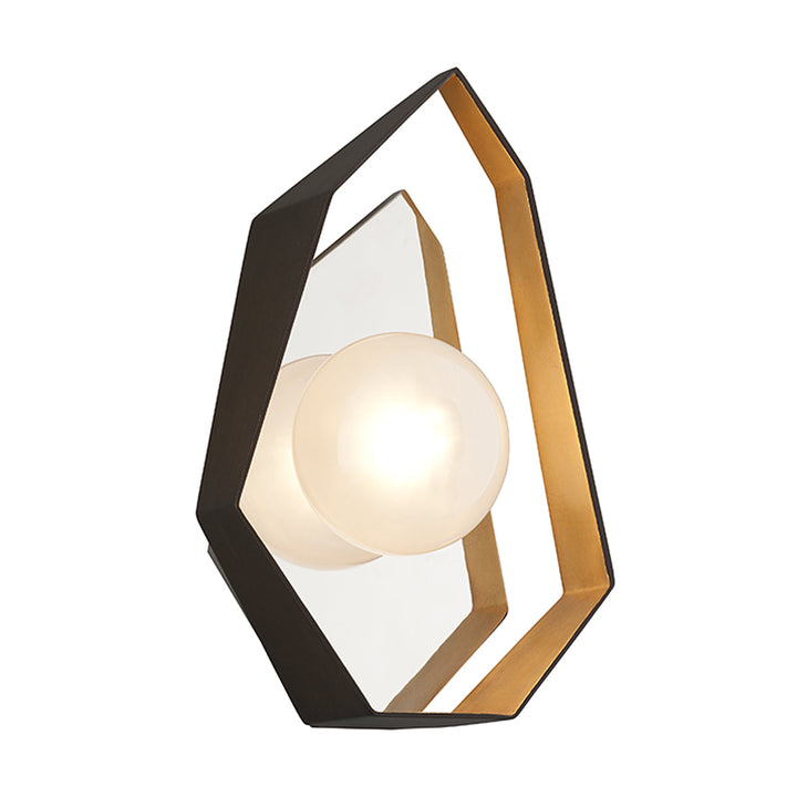 Inspired by Origami - the ancient art of folding paper and creating unique figures, this sconce offers a fresh perspective creating instant indulgence. It is composed of hand-worked iron flaunting a variety of angles and shapes. The Bronze with Gold Leaf finish and Frosted Clear Glass diffuser complement each other quite well.