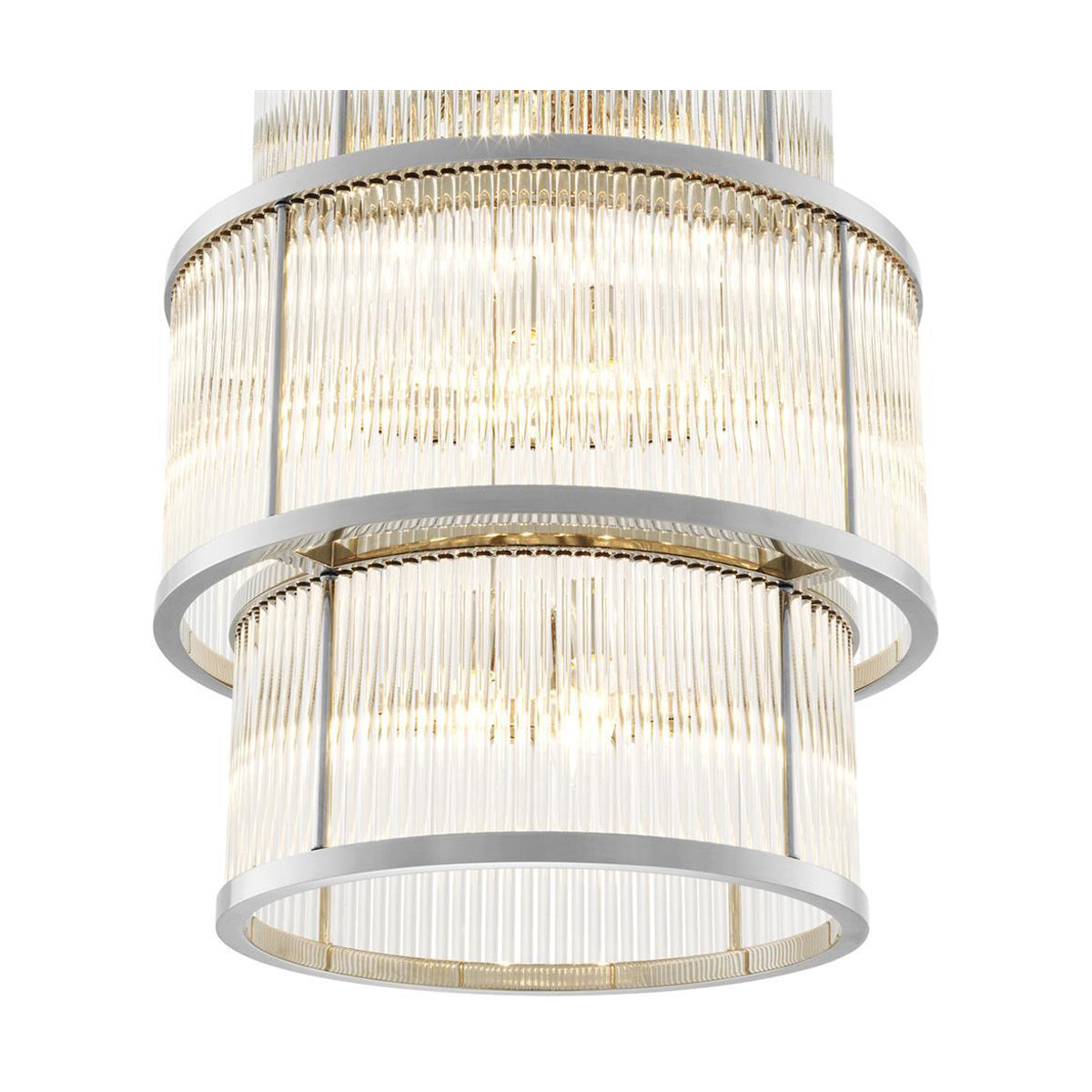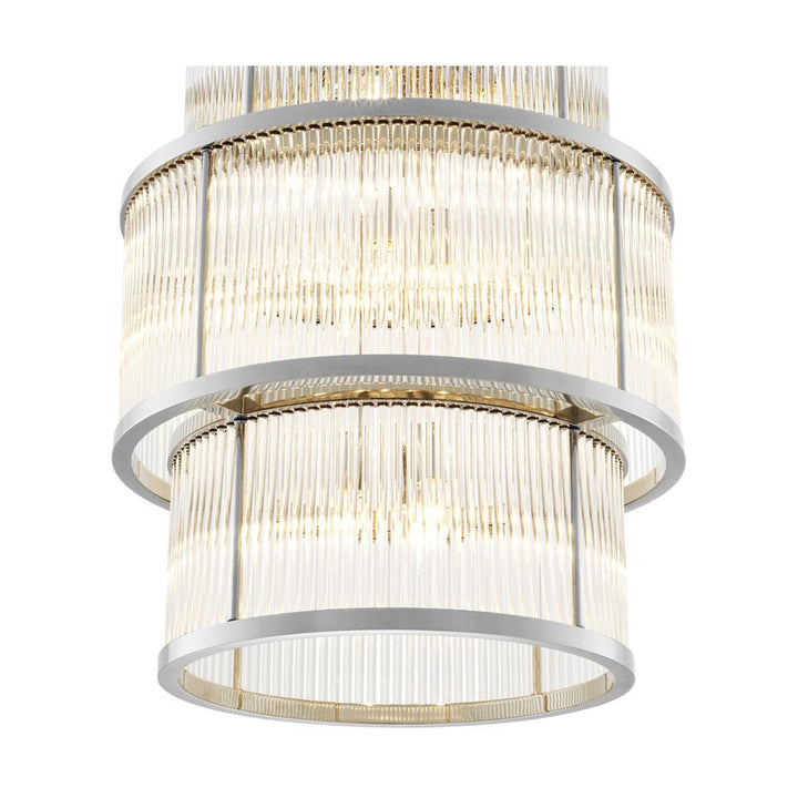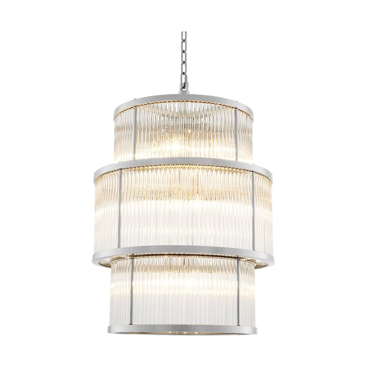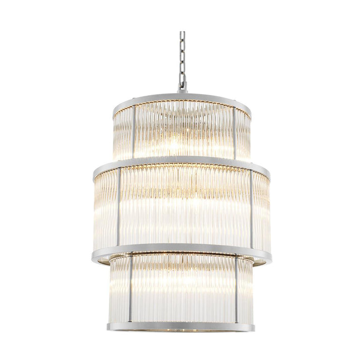 The Art-deco-inspired Palmera Chandelier brings a touch of glamour to your home's interior. The Nickel-finished drum shade with clear glass rods makes a bold statement. Thanks to its retro aesthetic, this piece will surely captivate everyone's attention.