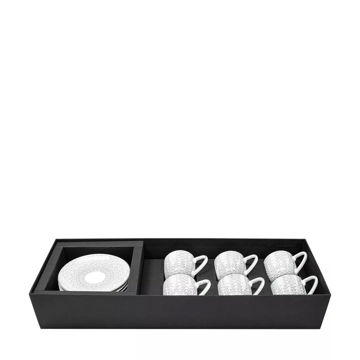 Pantheon coffee cup and saucer is an exquisite set that showcases sophistication and style. It is a set of 6 pcs carved in Porcelain material in a chic design that fits comfortably in hand. The set is adorned with intricate patterns that add to its elegant appeal. Elevates your favorite beverage drinking experience to a new level of refinement and indulgence.