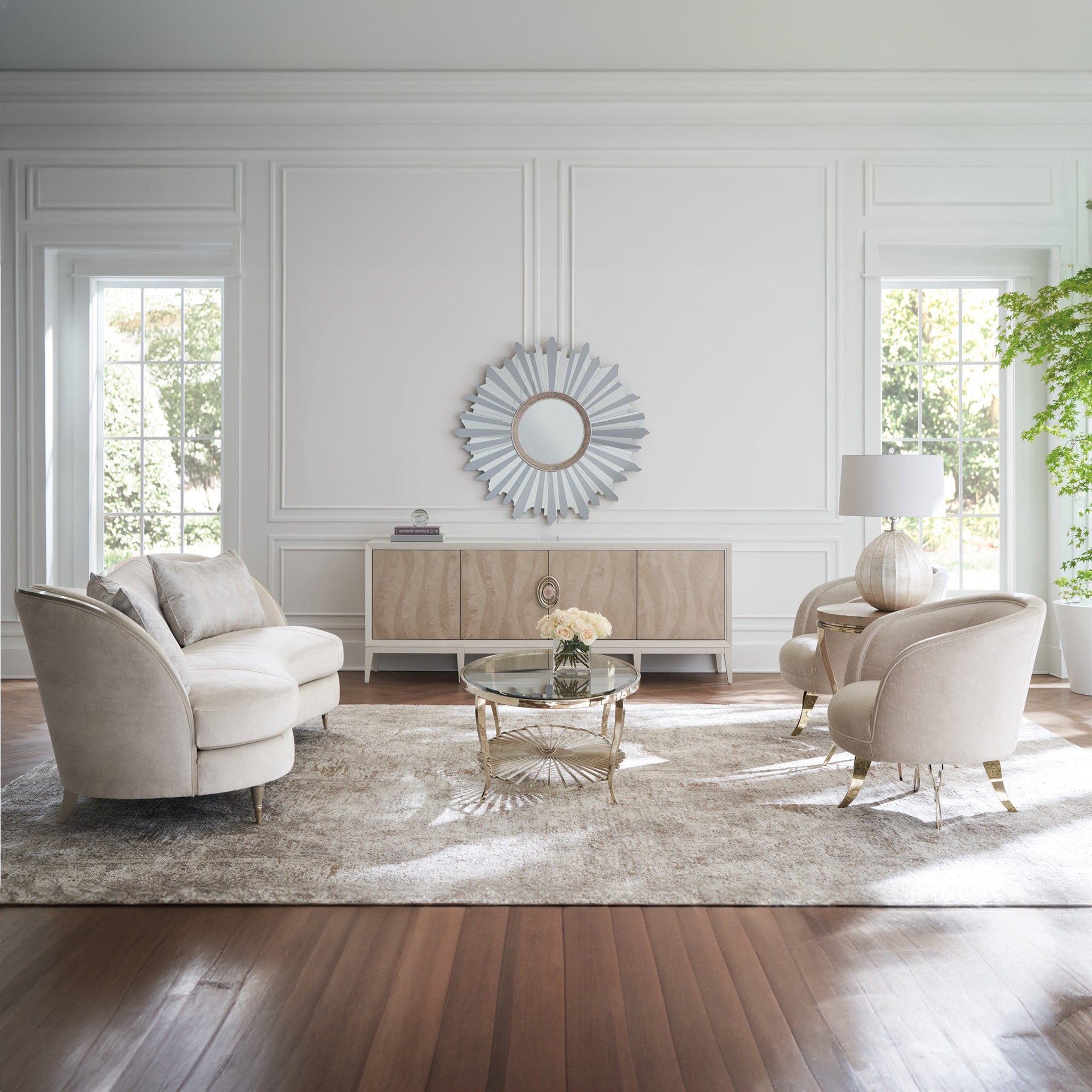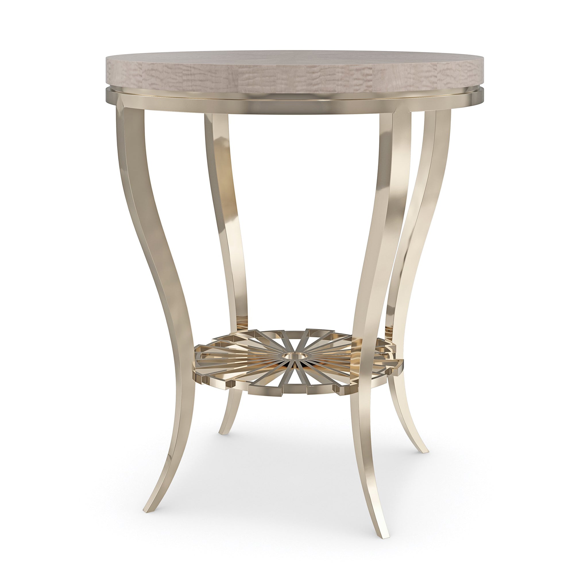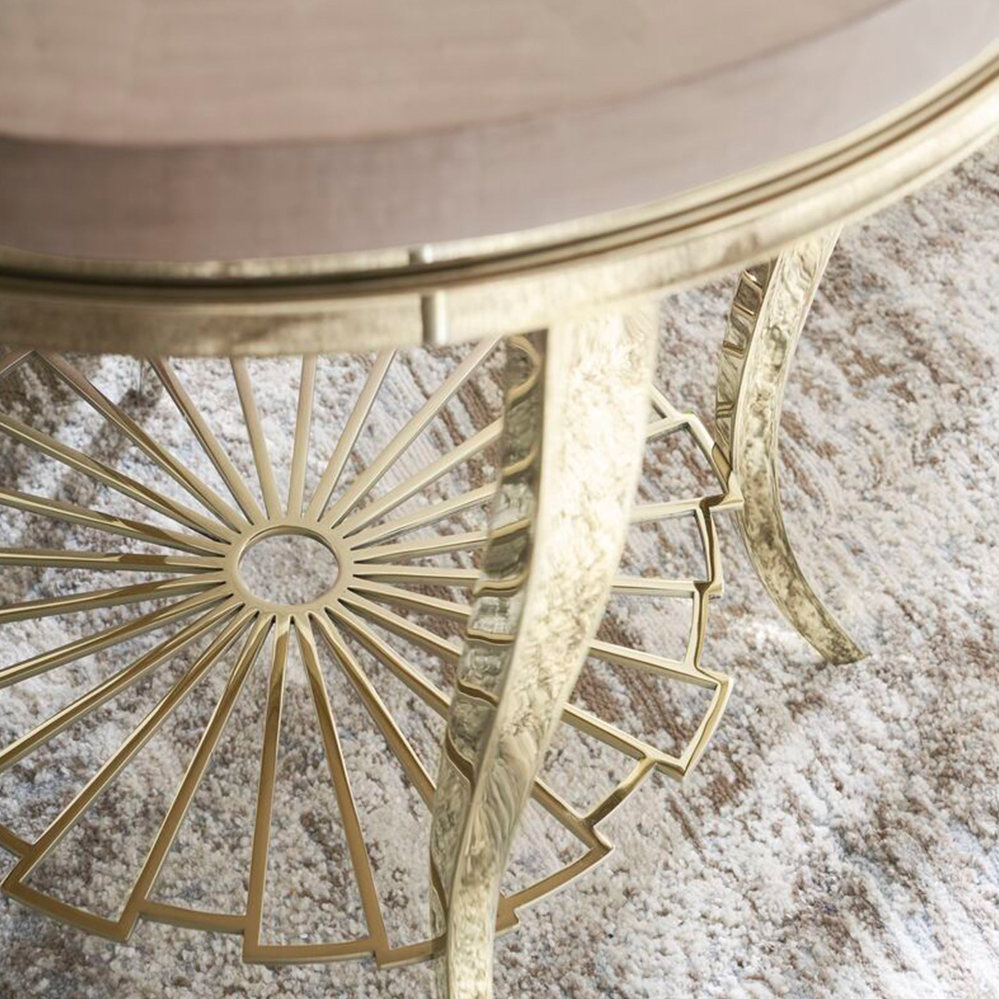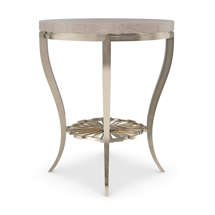 Ready to steal the spotlight, the Plié accent table captivates with its Art Nouveau-inspired metal stretcher, a visual treat doubling as a petite shelf. The warm Chinchilla finish highlights a radiant wood grain crafted from Grey curly Maple Veneers on top. Square saber legs infuse a touch of modern elegance into the intricate frame, adorned in a sophisticated Whisper of Gold.