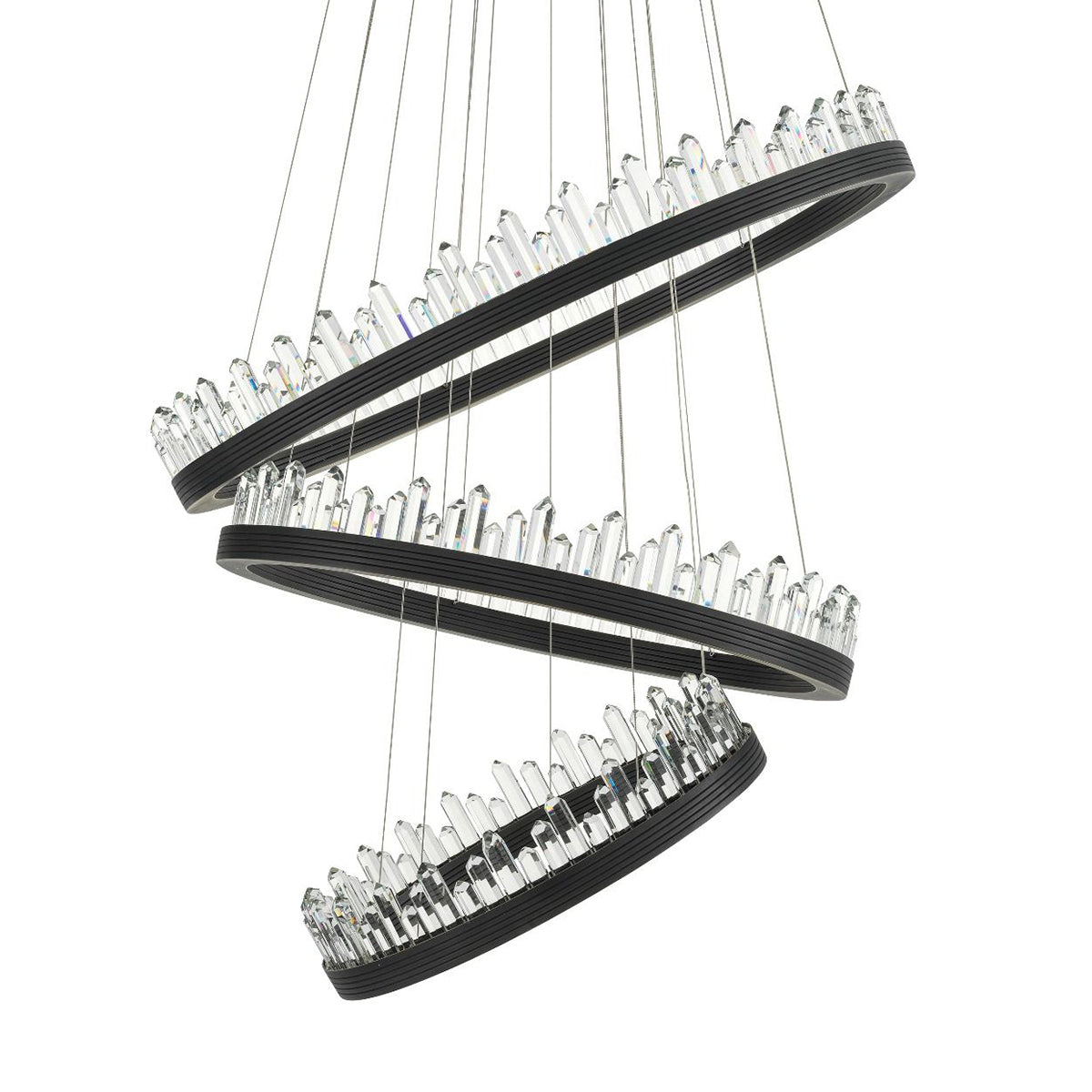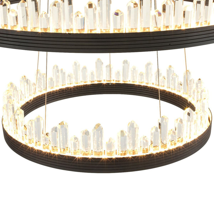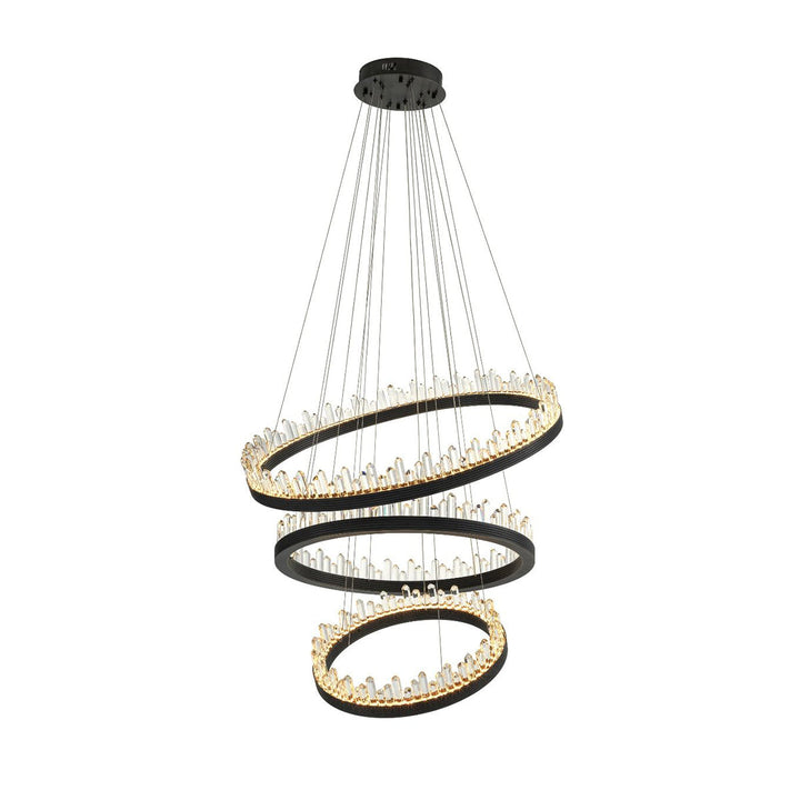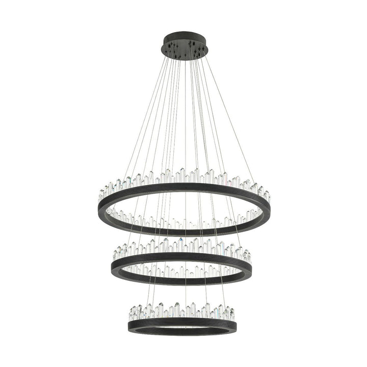 Light up your room with the wonderful Randall Chandelier. The playful design of this bronze finish 3-ring pendant will add character to your interior. Each ring can be hung in any desired position by adjusting the length of the cables.Integrated LED lights beautifully disperse light through the crystal glass decorations.
