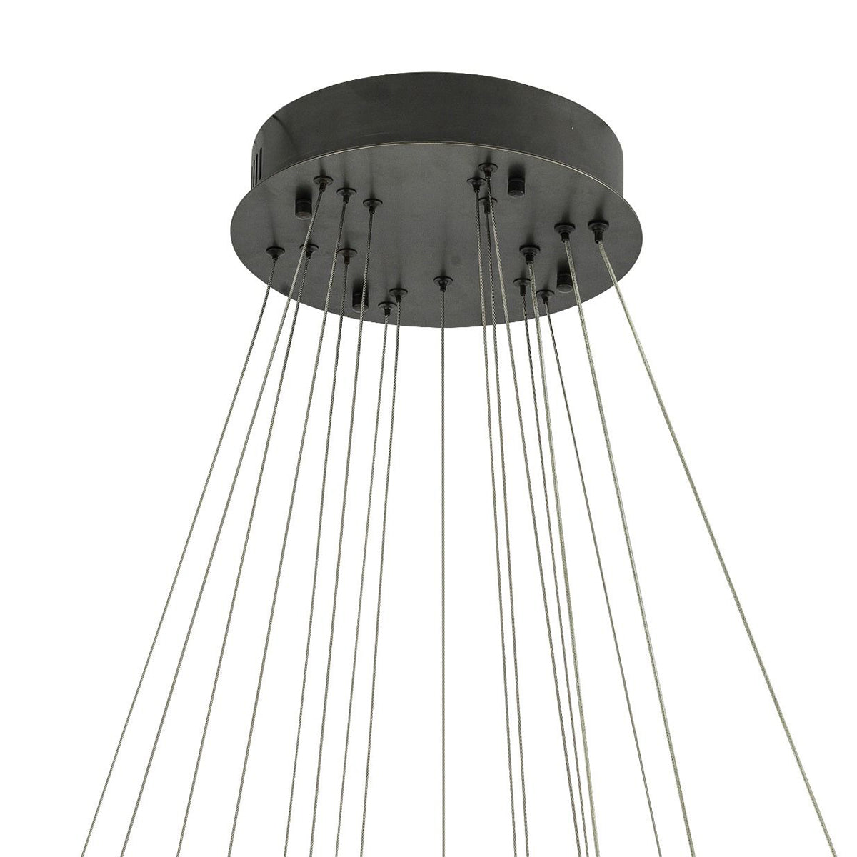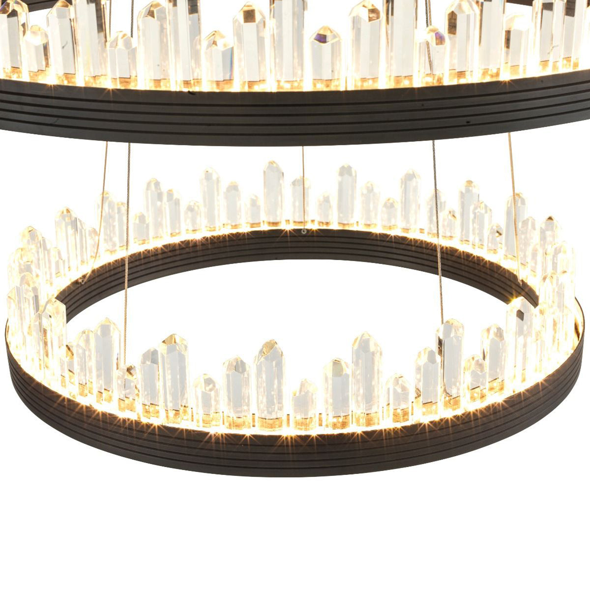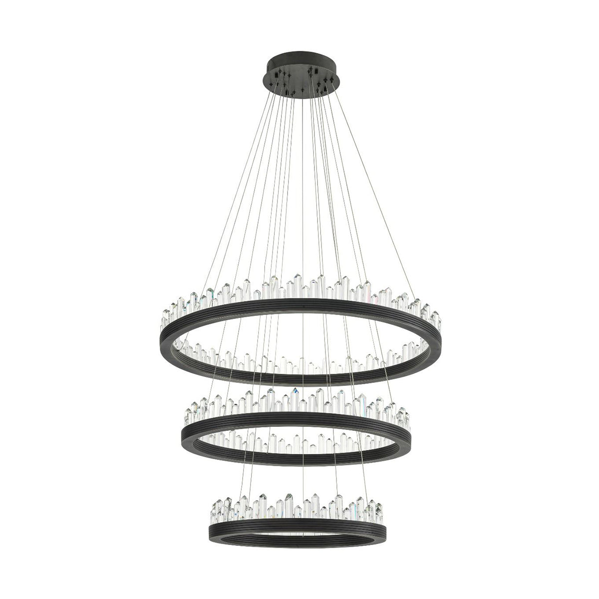 Light up your room with the wonderful Randall Chandelier. The playful design of this bronze finish 3-ring pendant will add character to your interior. Each ring can be hung in any desired position by adjusting the length of the cables.Integrated LED lights beautifully disperse light through the crystal glass decorations.