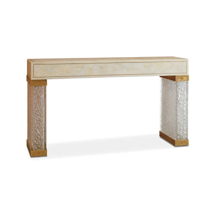 Modern classic with art deco influence, this console features a crystal stone top with brass inlay. Hand-carved acrylic legs add sculptural clarity and refined texture. Antique brass skirting completes the design with refined elegance.