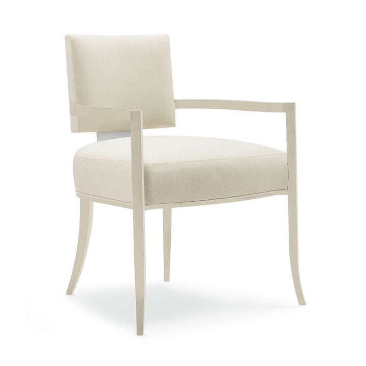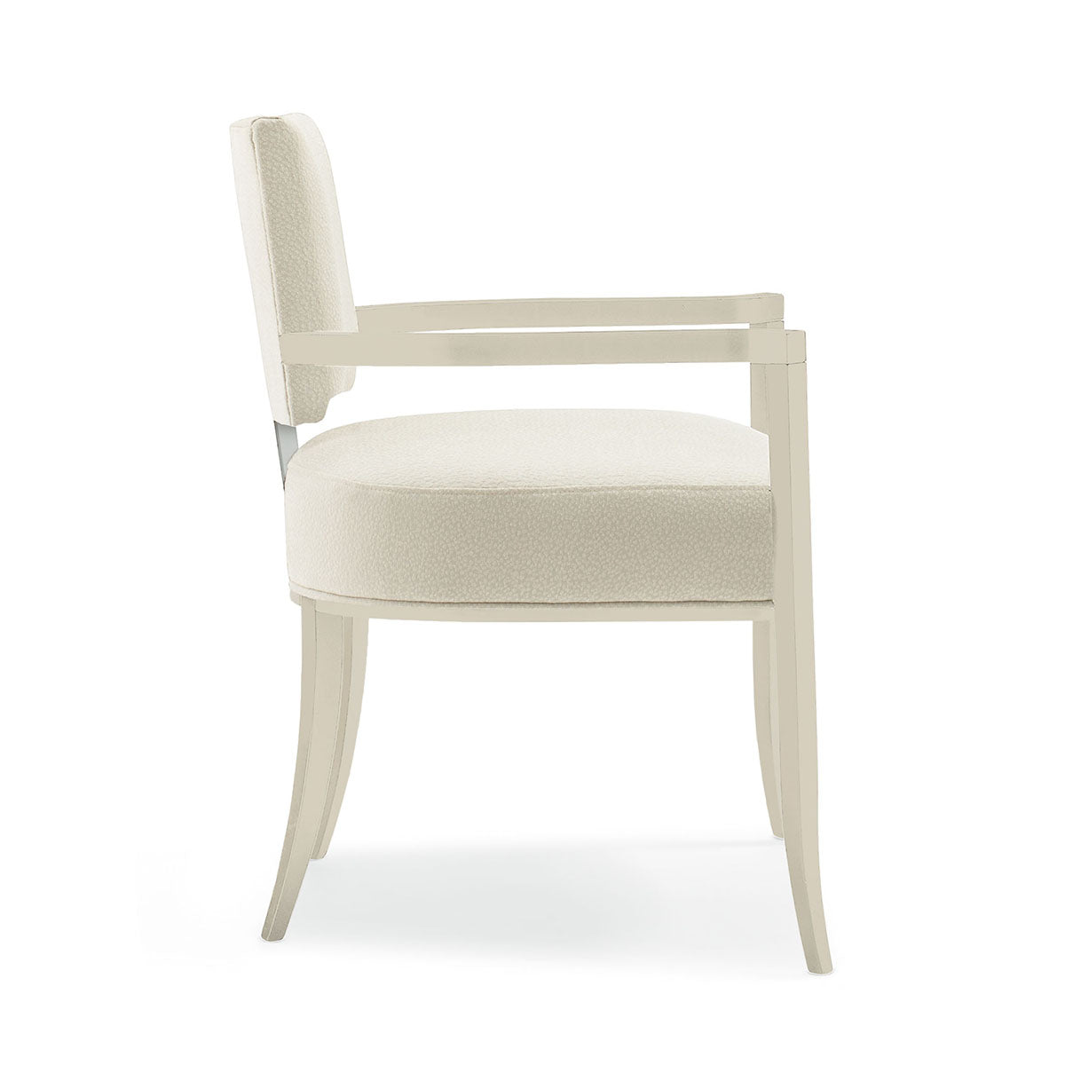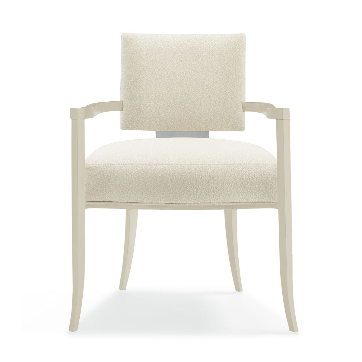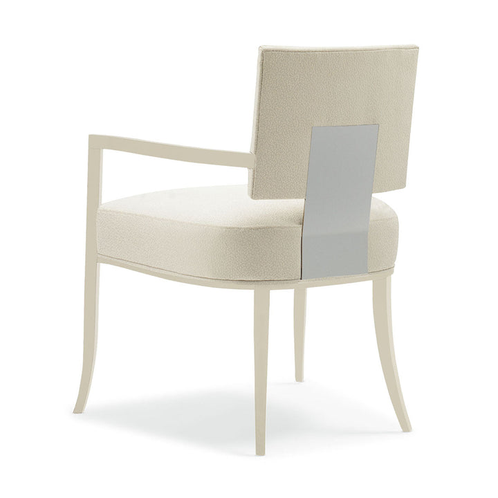 Inspired by a modern klismos chair, this piece exposes wood frame and saber legs in a Soft Silver Paint finish. Its wide panel backrest and seat are dressed in Neutral Sateen fabric for a visual uplift and comfortable feel. A metal back splat in a Lightly Brushed Chrome finish ensures sturdiness and adds to elevated aesthetics.
