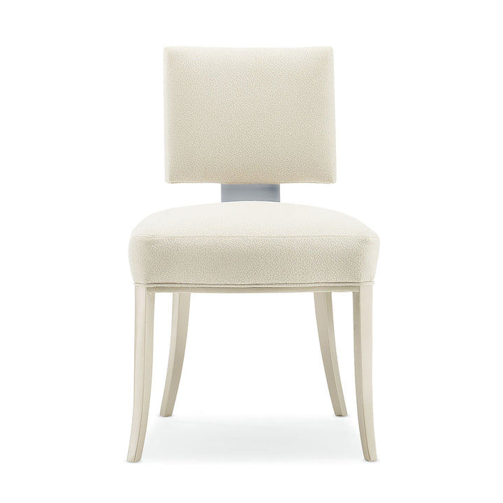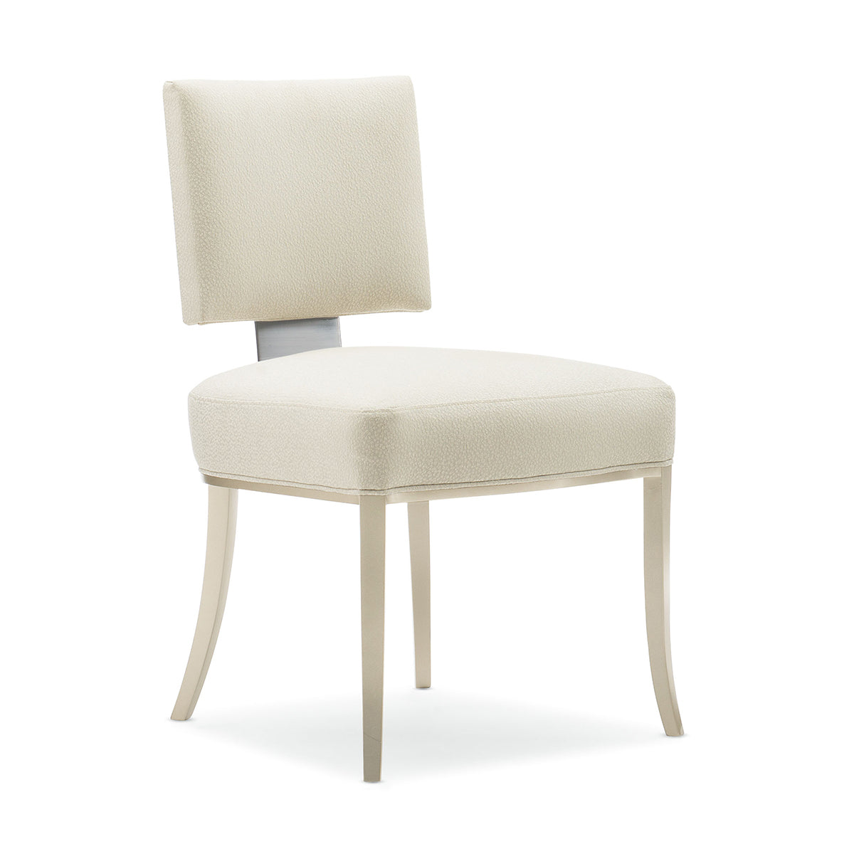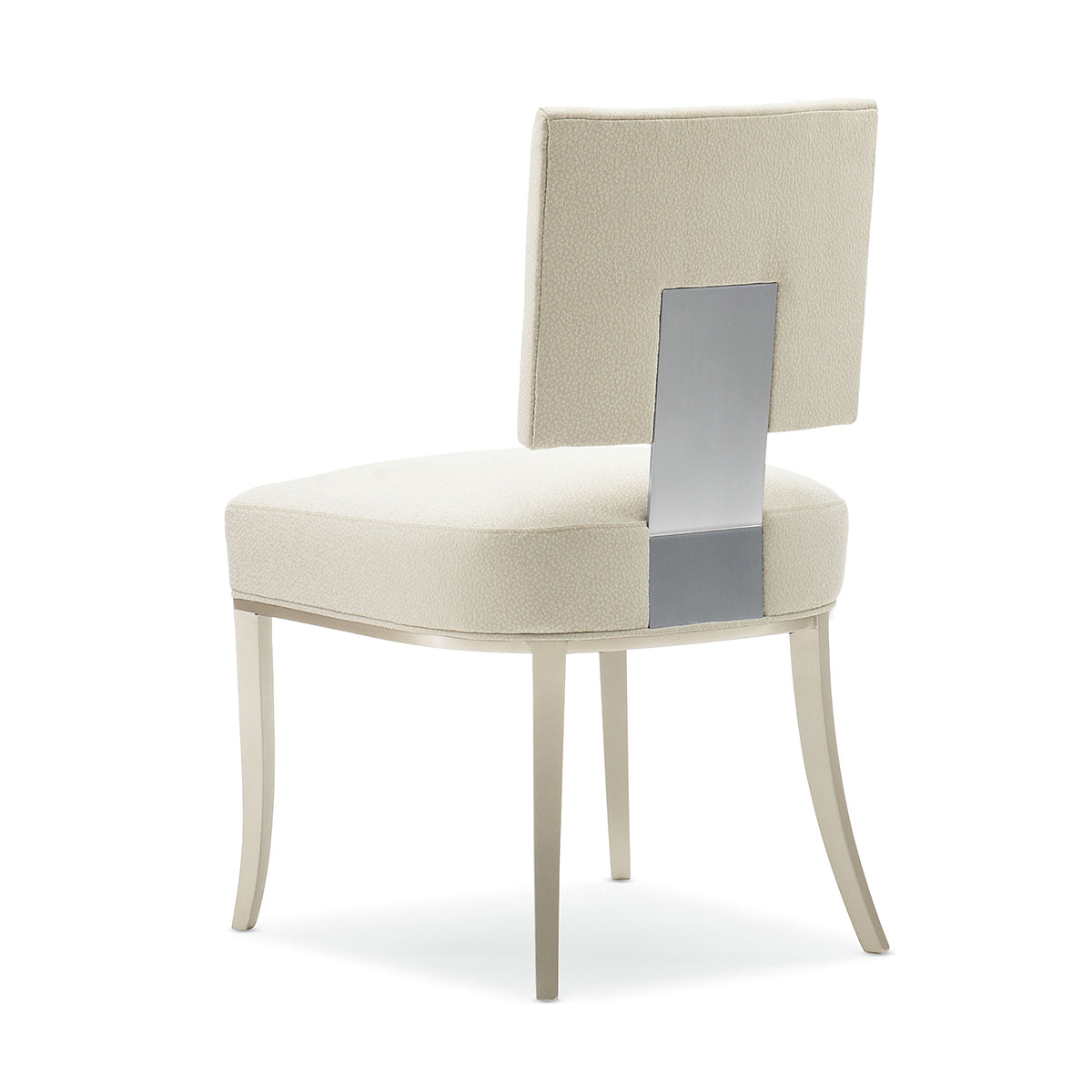 Inspired by a modern klismos chair, this armless piece exposes a wood frame and saber legs in a Soft Silver Paint finish. Its wide panel backrest and seat are dressed in Neutral Sateen fabric for a visual uplift and comfortable feel. A metal back splat in a Lightly Brushed Chrome finish ensures sturdiness and adds to elevated aesthetics.