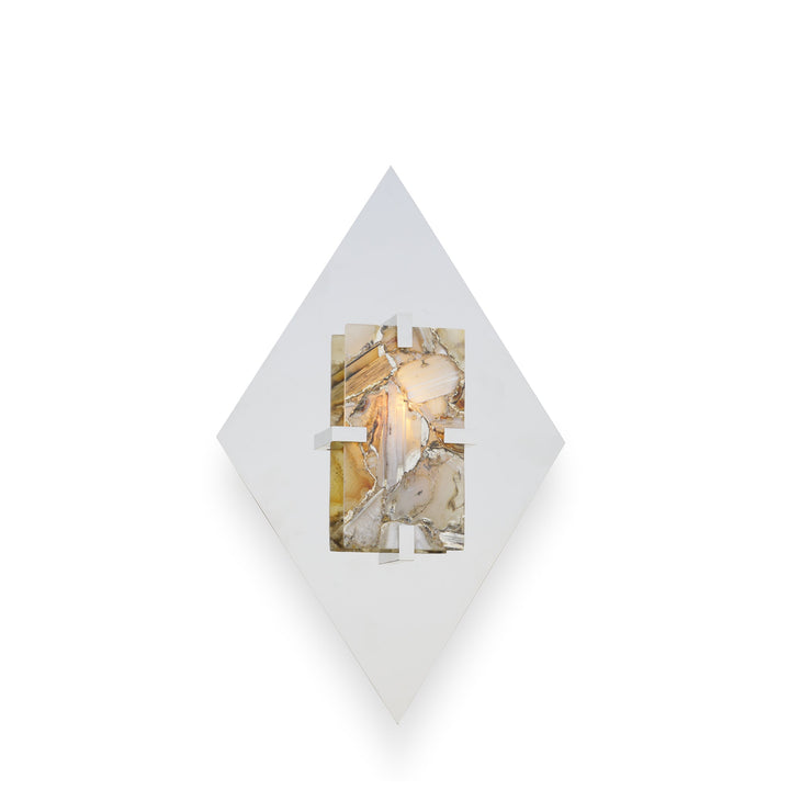 The Retro Wall Sconce is grand yet straightforward and will add a contemporary flair to your home interior. A diamond-shaped metal structure in a Nickel finish gives a sleek and pristine appearance. Its configuration is complemented by the Natural Agate Stone that sparkles when the lights are switched on. Completing the Retro Wall Sconce collections will make a bold statement in any setting.