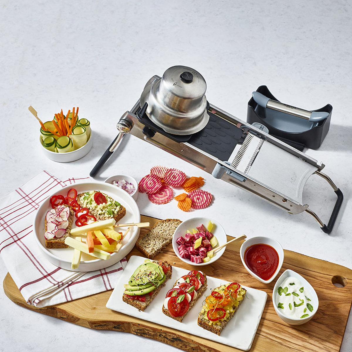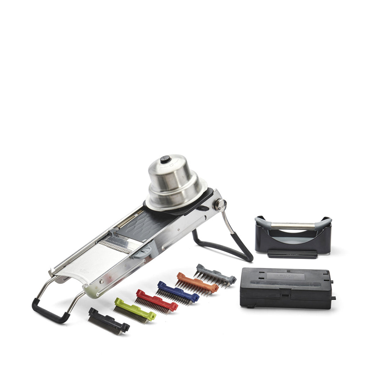 The innovative Revolution Master Mandoline, equipped with a twin horizontal blade, effortlessly conquers all fruits and vegetables, even delicate citrus and the softest produce. Its scalloped and fluted edges guarantee flawless cuts, empowering your kitchen creativity with unwavering confidence. Complete with a detachable storage box housing six Julienne combs, ranging from 2mm to 10mm, it gives unequaled versatility in your slicing endeavors.