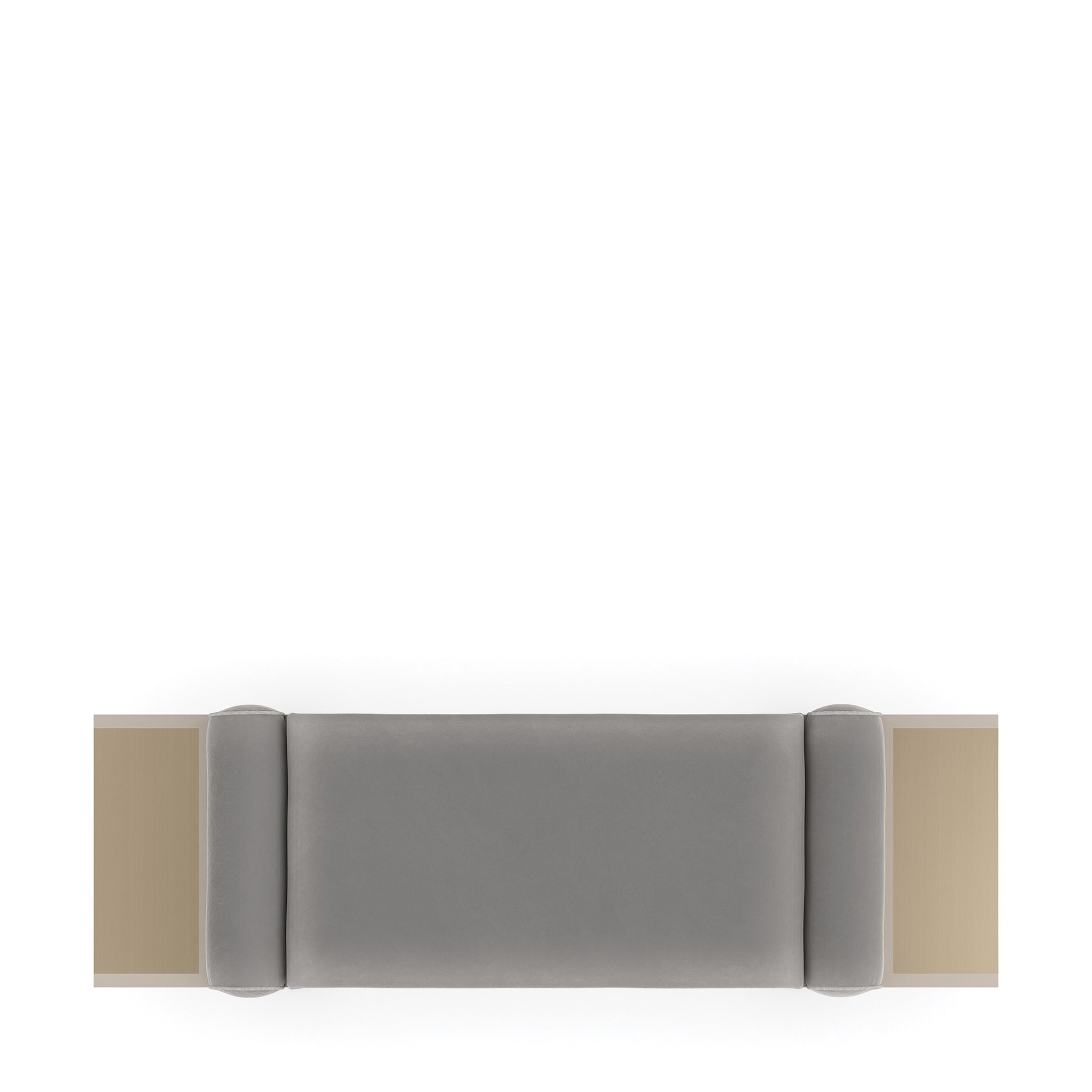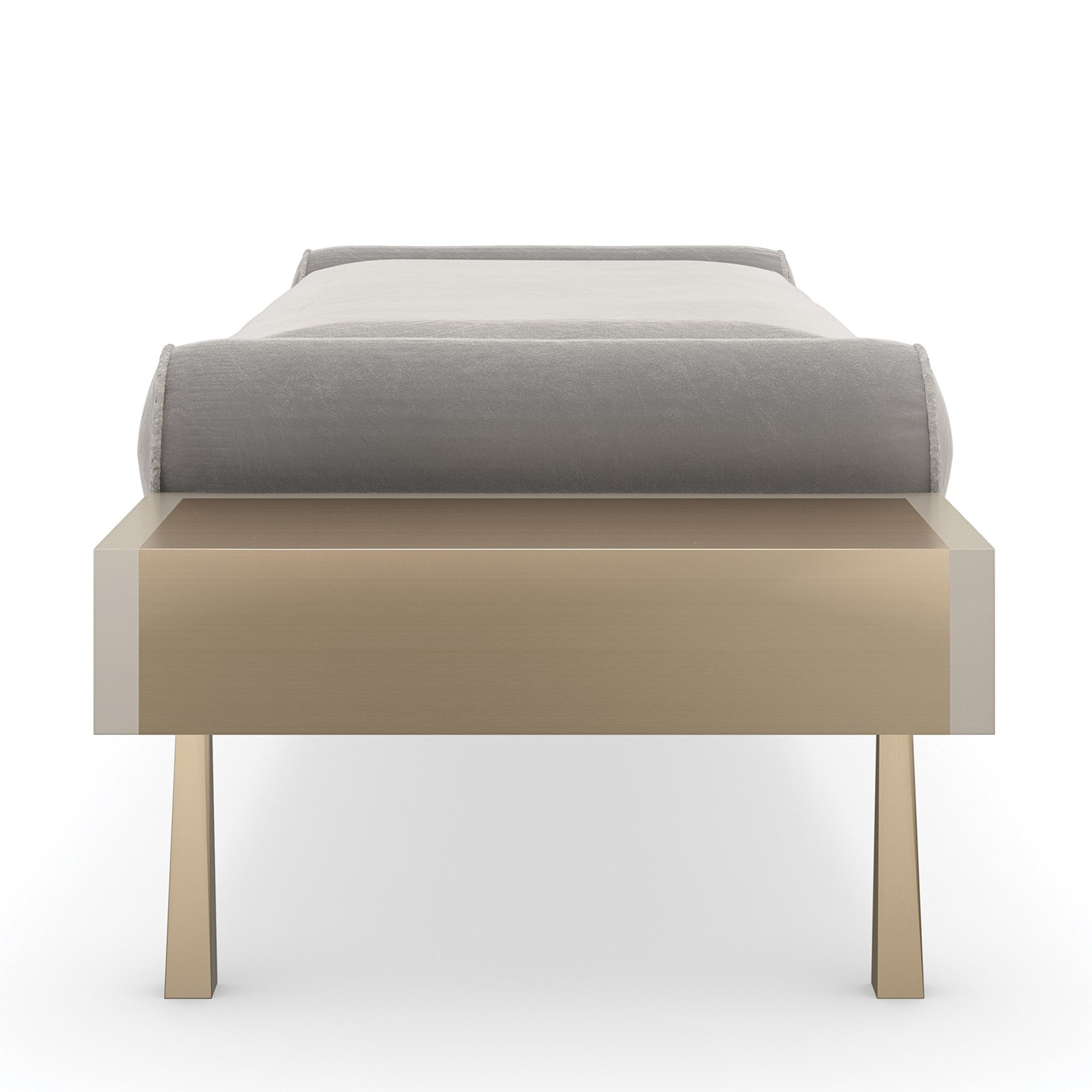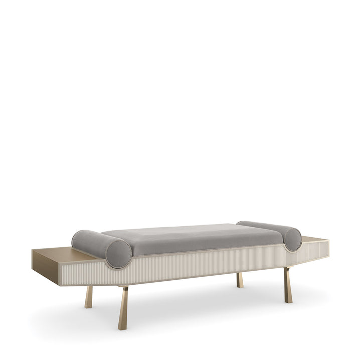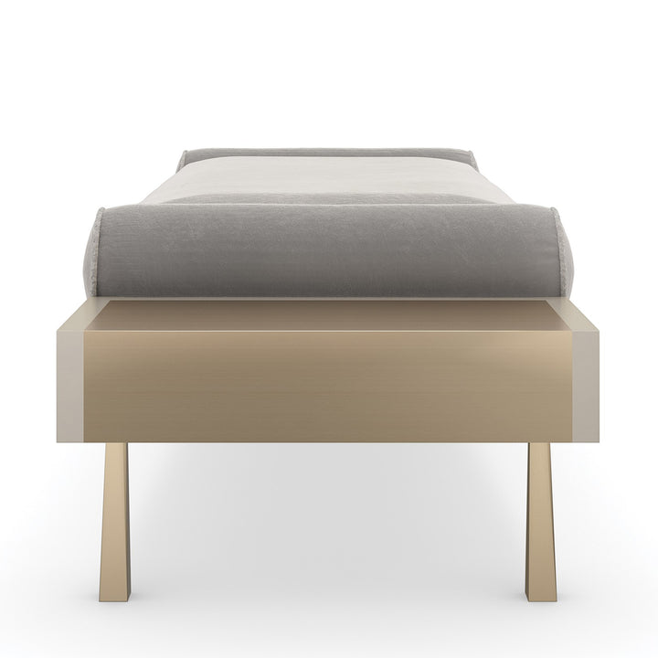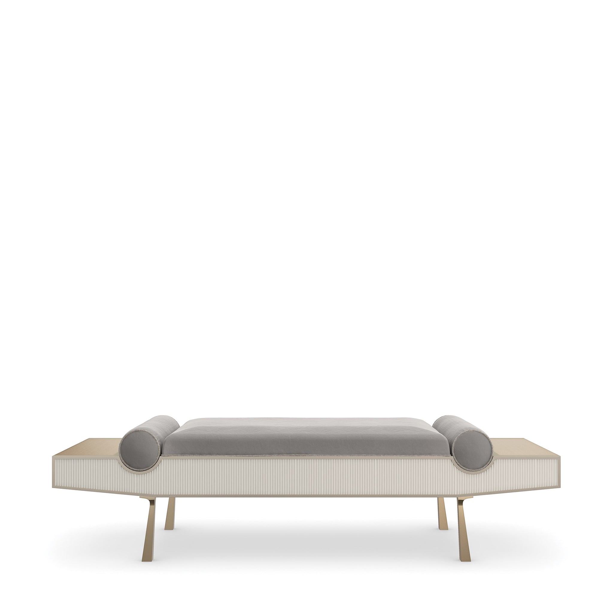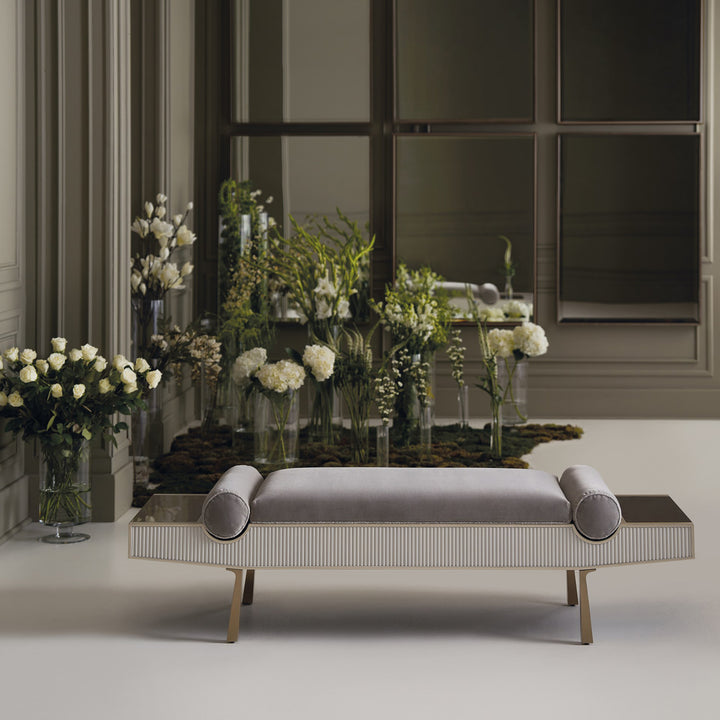 This simple bench exudes modern elegance and is the ideal size for an entryway or the foot of a bed. Its rhythmic and eye-catching pattern is introduced by the reeded apron finished in creamy Almond Milk. The smooth fabric upholstery features recessed bolster pillows and contrasting metal wings—ideal for displaying a book or decorative object. Brushed Gold finish wraps the ends, completing this magnificent blend of modern style and timeless sophistication.