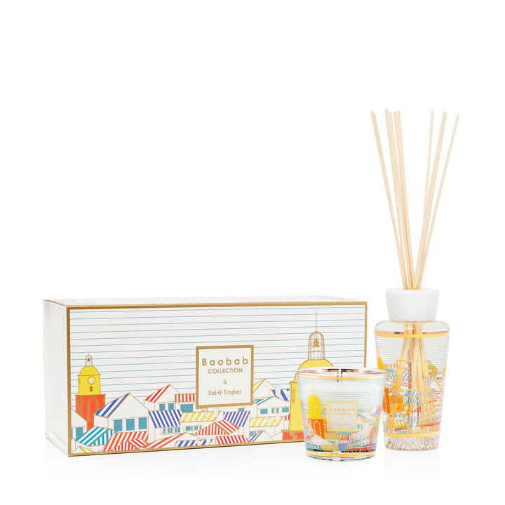 The Saint Tropez scented candle and fragrance diffuser featured in the Baobab Collection are decorated with a multicoloured and gold silk-screen print depicting the roofs of the town's houses and paying tribute to its legendary bell tower.