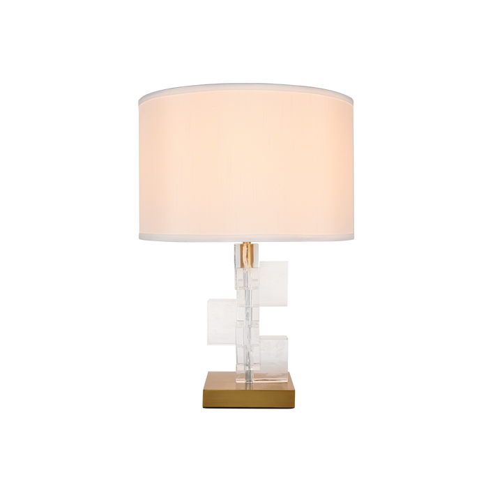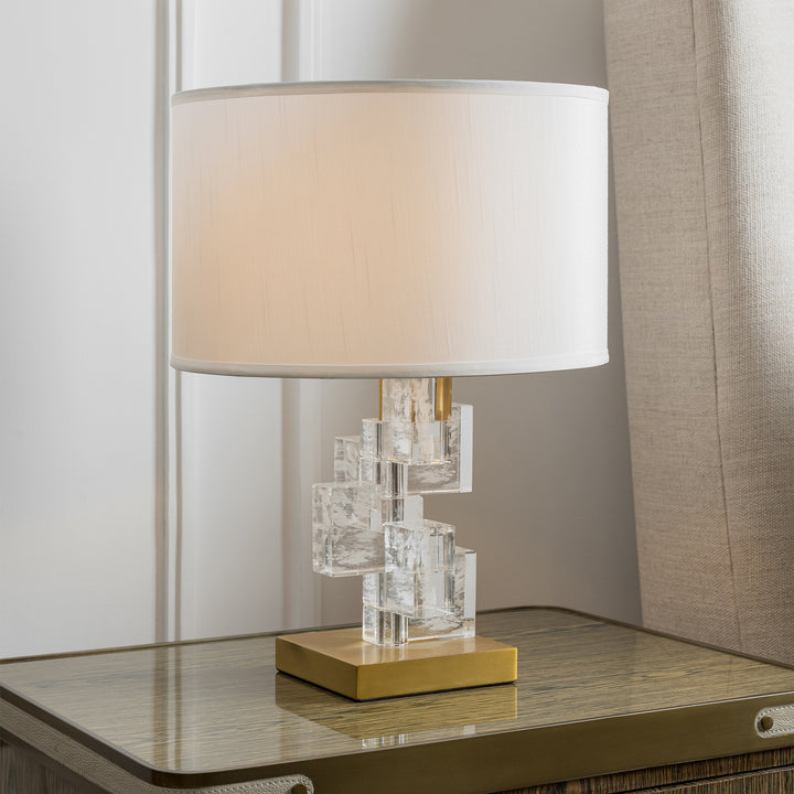 Defined by art deco influence, this table lamp features a striking geometric crystal-stacked arrangement and a base in an antique brass finish, creating a perfect interplay of timeless glamour and architectural elegance.