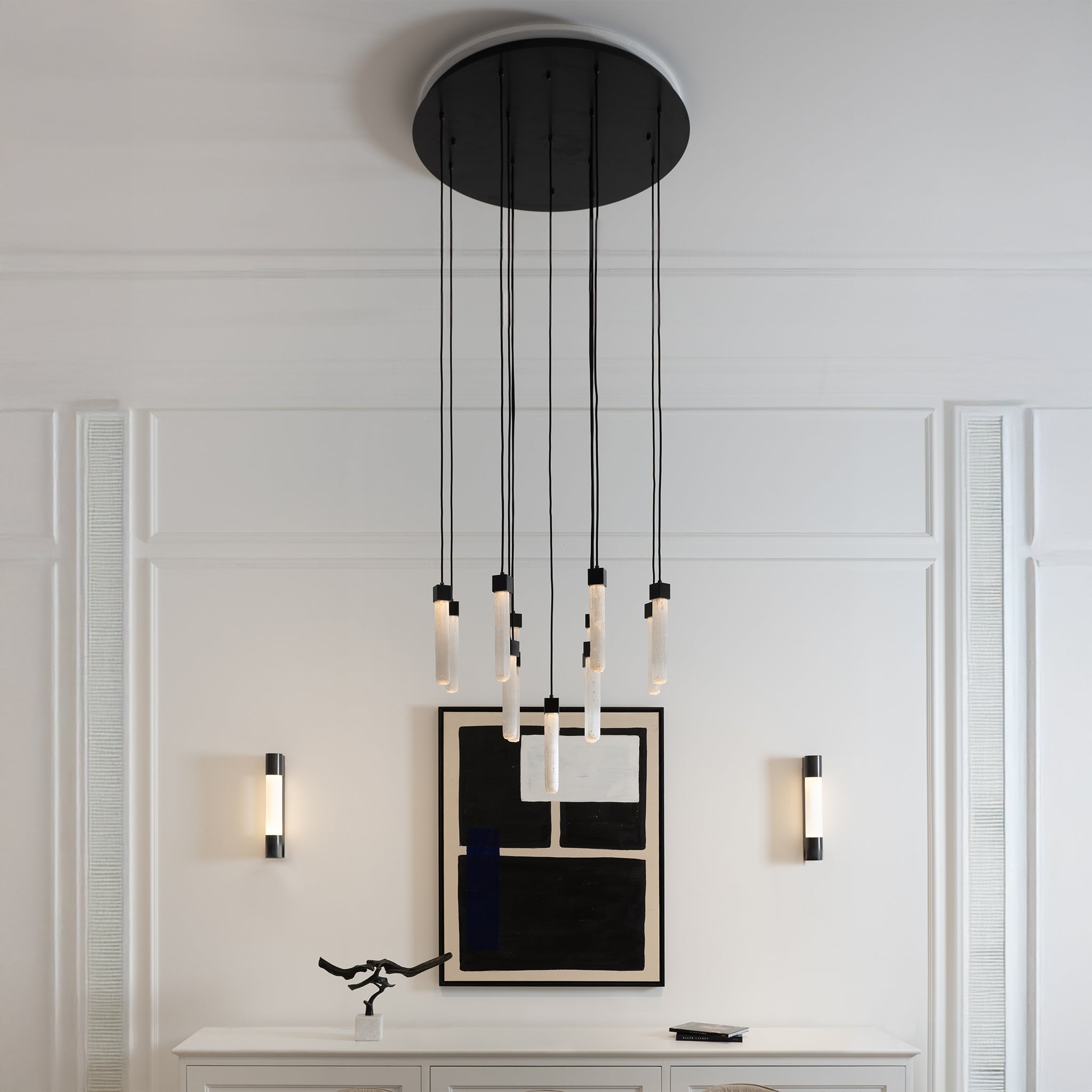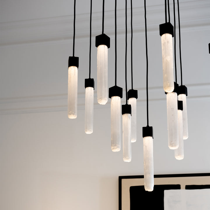 Suspended in graceful harmony, this chandelier embodies minimalism with its stone pendants and bold black canopy. The asymmetrical arrangement creates a refined composition.