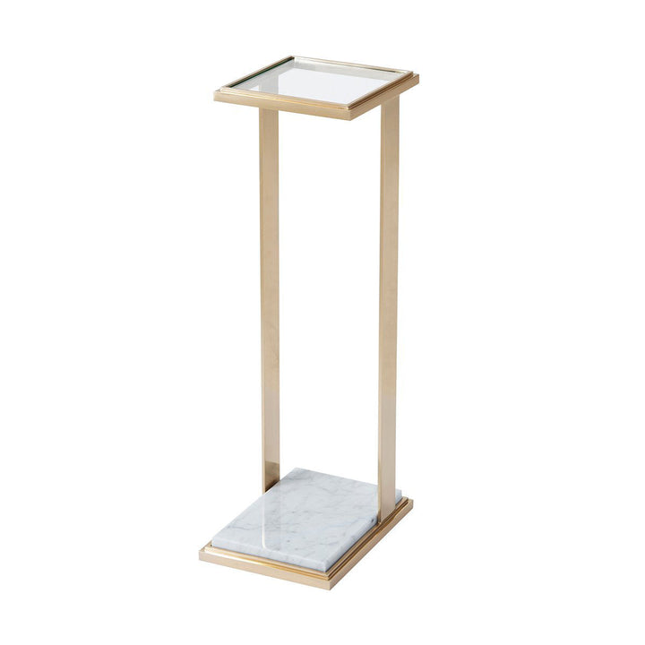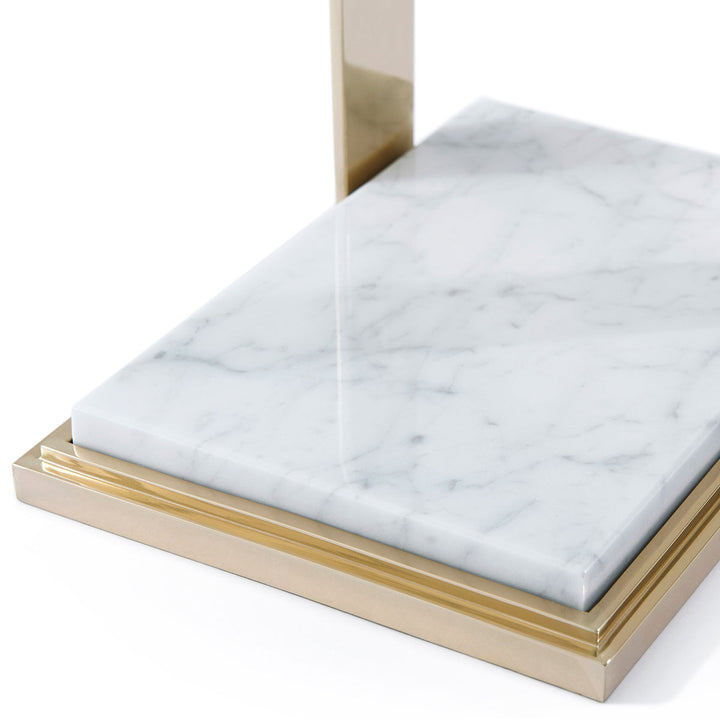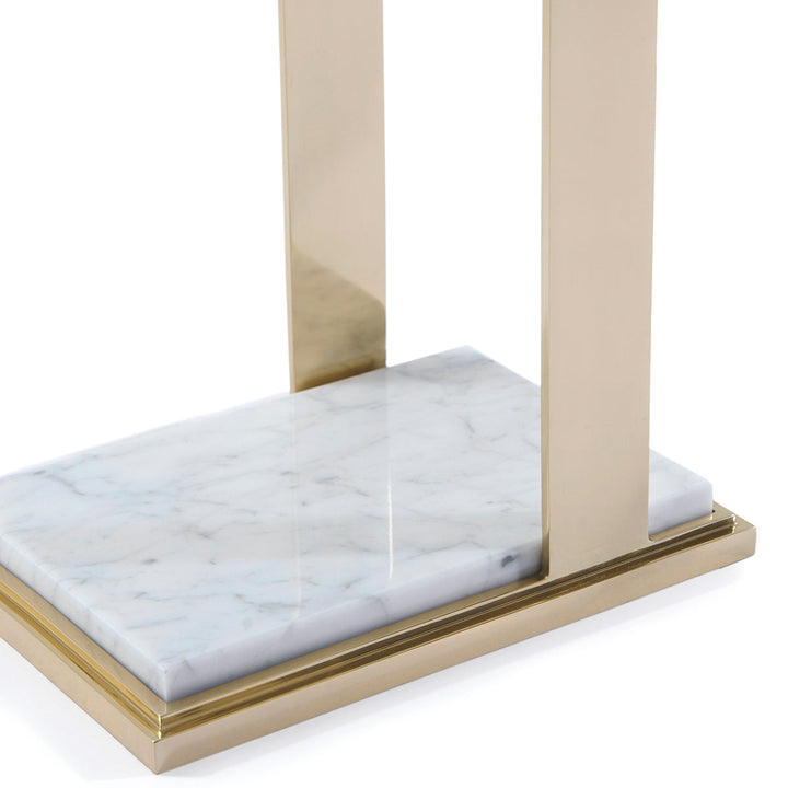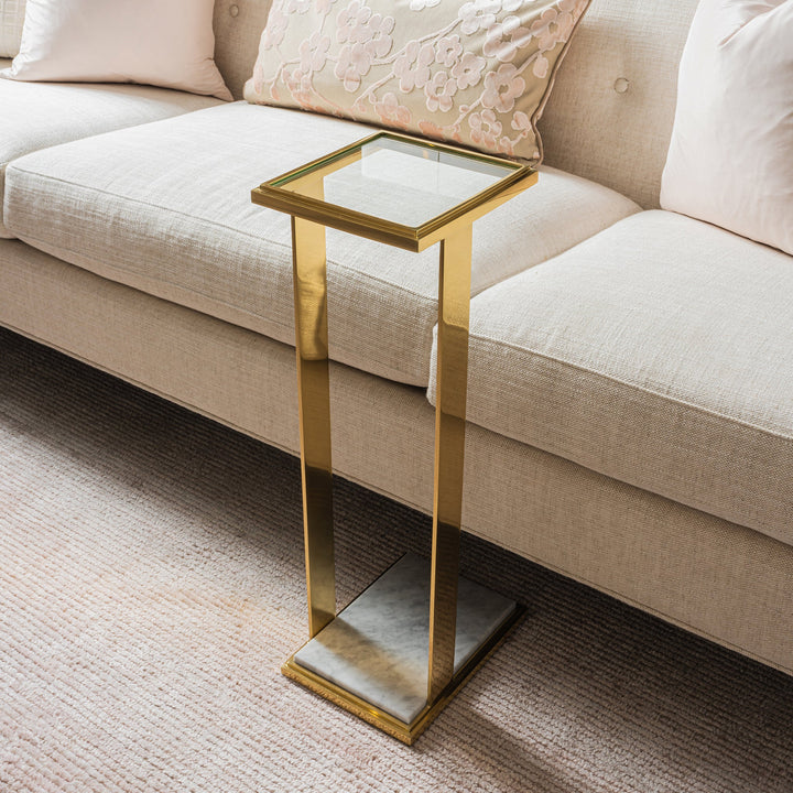 The C-shaped Cantilever accent table is an intelligent creation for today's hustle-bustle life. Just slide on this table to access your laptop, snacks, books, magazines, etc. The elite craftsmanship of polished brass metal frame and the durable tempered glass located in the upper inset give a precision appeal to the counterweighed white marble in the lower inset.