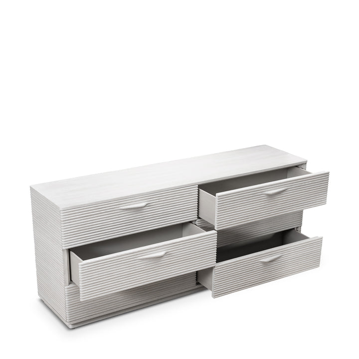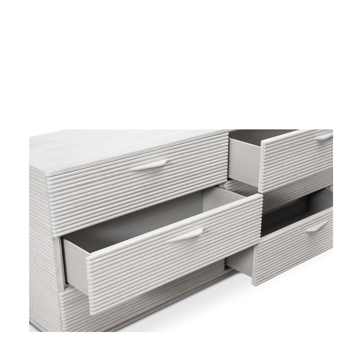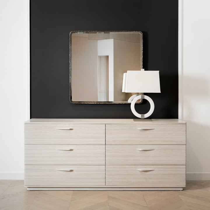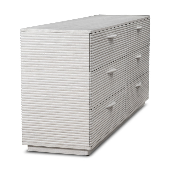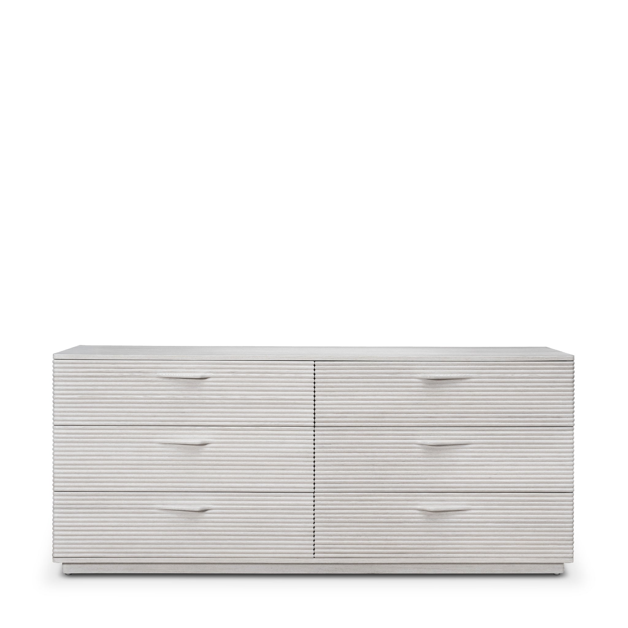 The reeded design in a newport oak finish lends this chest a clean, architectural presence. Crafted from solid ash wood and quartered ash veneer, it showcases the natural beauty of the wood grain with subtle sophistication. Six spacious drawers provide ample storage, combining functionality with timeless elegance.