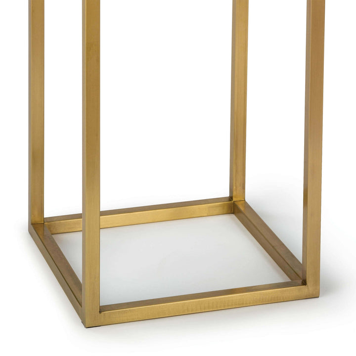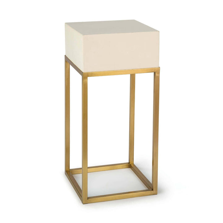 The Sawyer Side Table is a luxe, linear composition that perfectly adorns a block of poured White Plaster atop a sleek Natural Brass base. Perfect for a modern living room, this piece's layered texture is highly sophisticated.