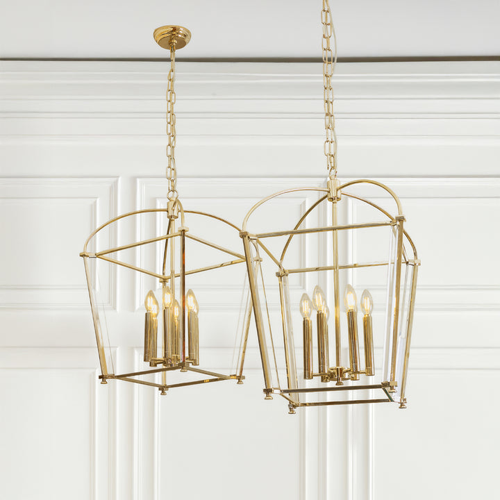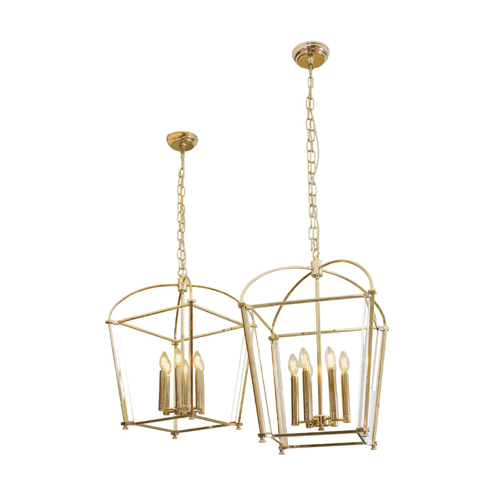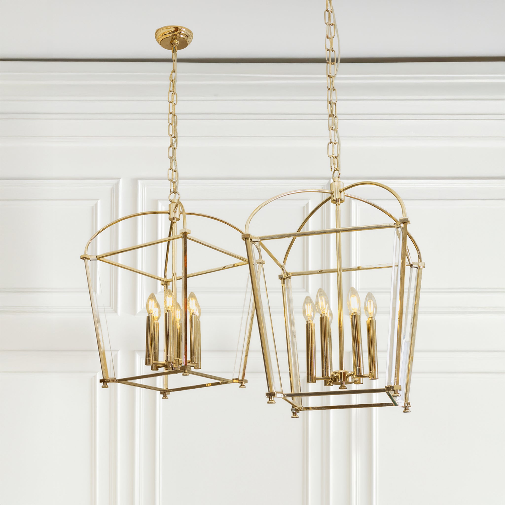 Inspired by the silhouette of vintage lanterns, this chandelier introduces a touch of tradition to the home. Made from stainless steel with antique brass finish and accented by clear crystal.